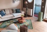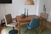 Helles Wohnzimmer mit Sofa, Designer-Sessel, Essbereich, TV, WLAN.