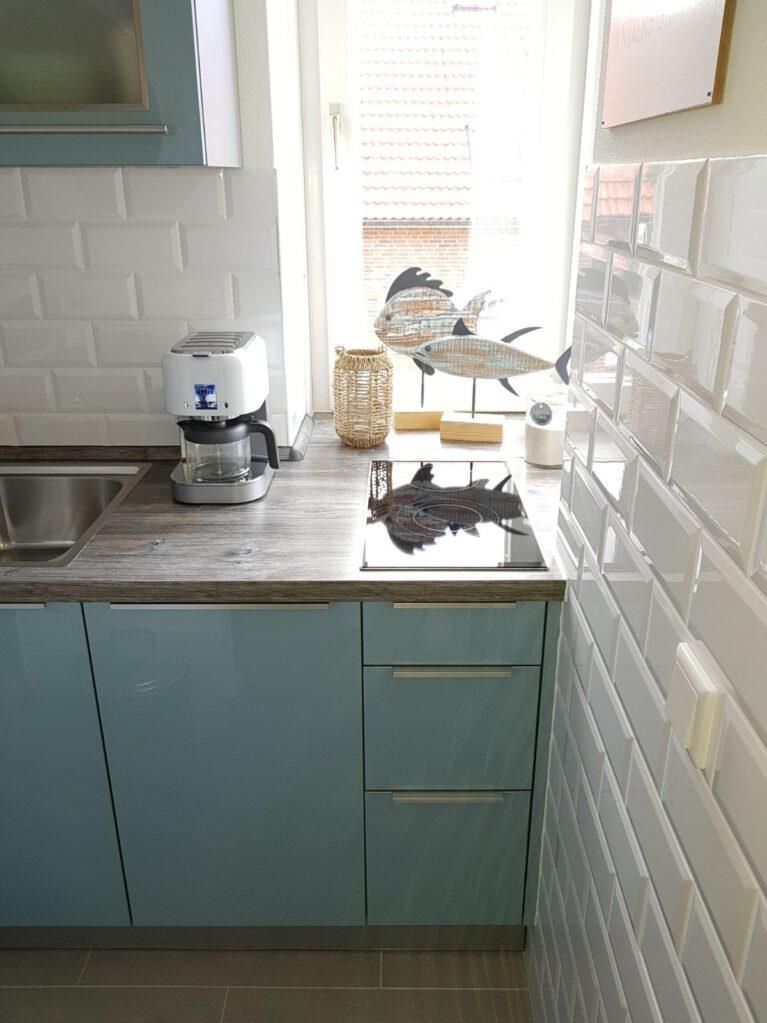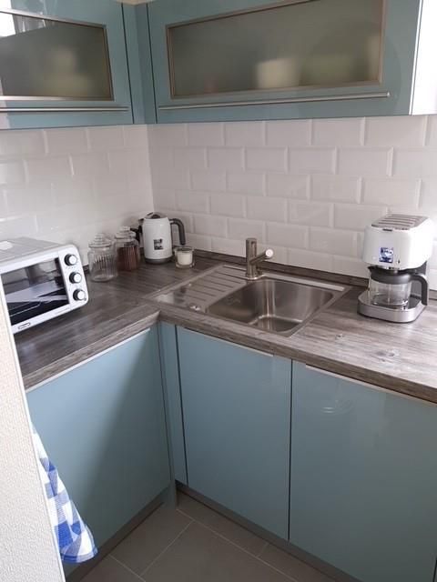 Kleine Küche mit 2-Platten- Cerankochfeld, Geschirrspülmaschine, kleiner Backofengrill.