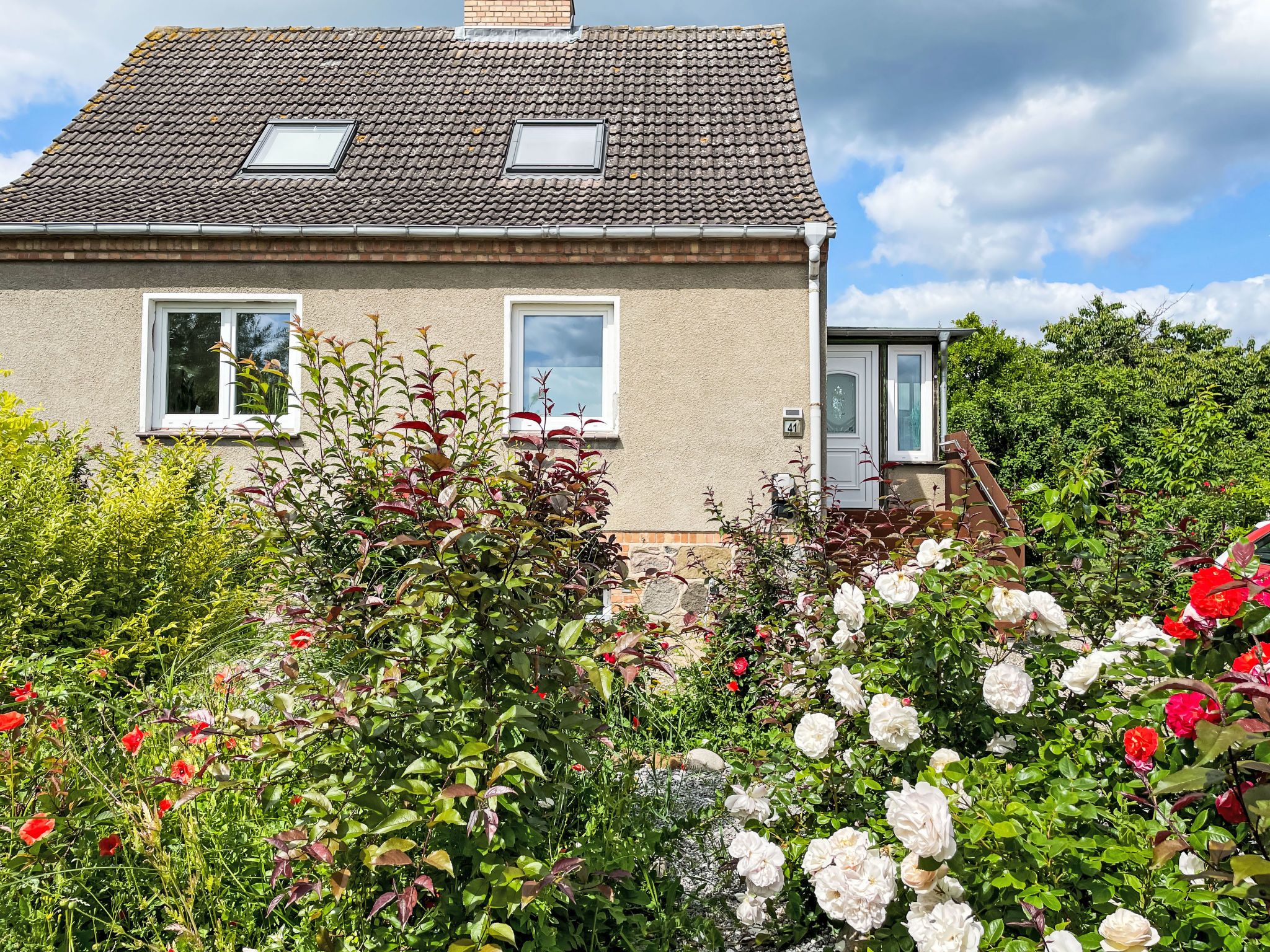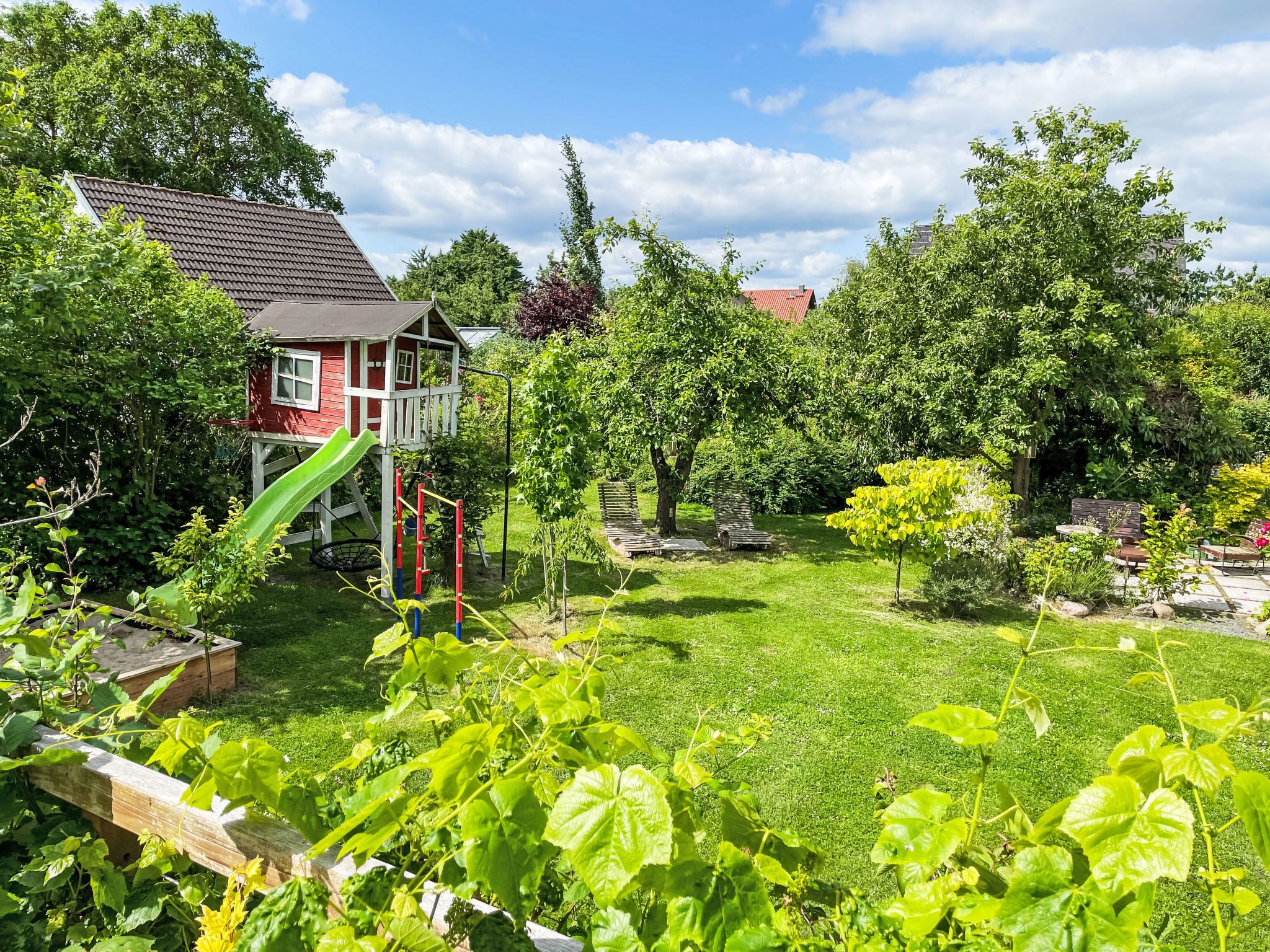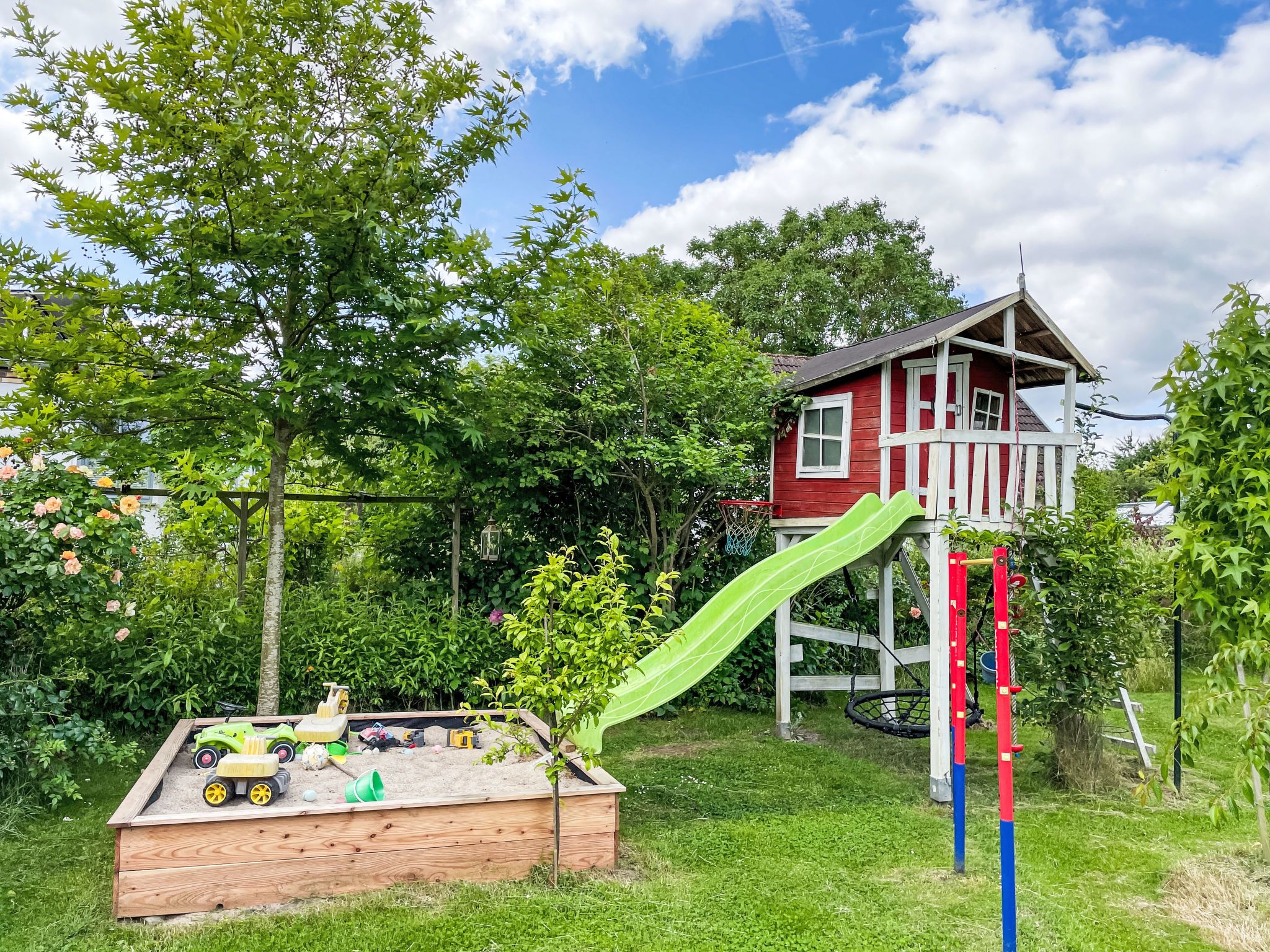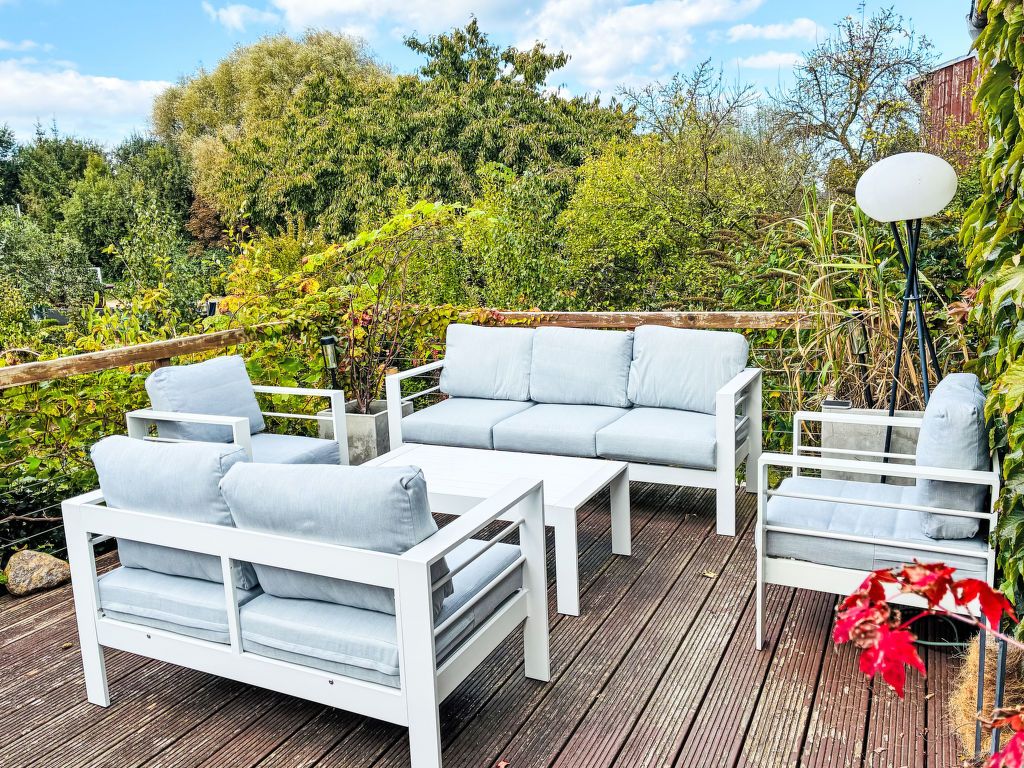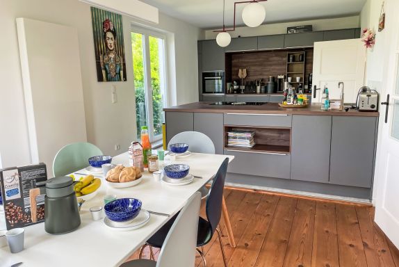 4-Zimmer-Haus 114 m2 auf 2 Stockwerken. Geräumig und hell, modern und gemütlich eingerichtet: Wohnzimmer mit Digital-TV und Radio. Offene Küche (Backofen, Geschirrspüler, 4 Induktionskochplatten, Toaster, Wasserkocher, elektrische Kaffeemaschine) mit Esstisch. Ausgang zum Garten, zur Terrasse. Dusche/WC. Heizung. Obergeschoss: 1 abgeschrägtes Zimmer mit 1 Doppelbett (180 cm, Länge 200 cm). 2 abgeschrägte Zimmer, jedes Zimmer mit 1 Ausziehbett (2 Pers. 2 x 80 cm, Länge 200 cm). Holzdielenboden. Grosse Terrasse. Terrassenmöbel. Schöne Sicht auf den Garten. Zur Verfügung: Waschmaschine, Wäschetrockner, Bügeleisen. Internet (WLAN, gratis). Parkplatz (1 Auto) beim Haus. Bitte beachten: geeignet für Familien. Nichtraucher-Haus. Maximal 2 Haustiere/Hunde erlaubt. Rauchmelder. Im Wohnzimmer gibt es einen hellen Erker als Leseecke. BORA Kochfeld in der Küche und Quooker Wasserhahn.