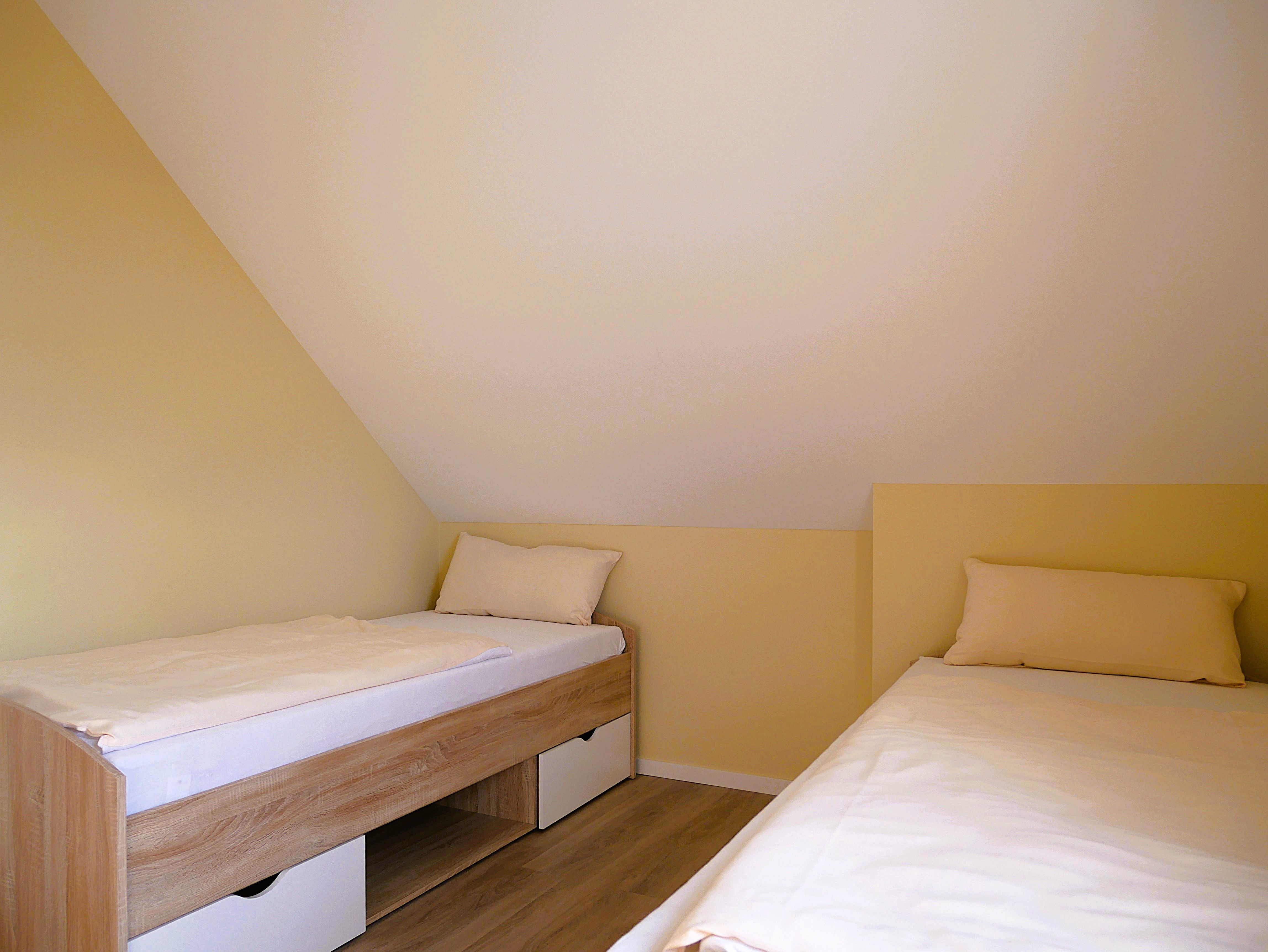 Über eine Treppe mit 15 Stufen gelangen Sie in das Obergeschoss, wo zwei separate Schlafzimmer auf Sie warten: Eines ist mit einem gemütlichen Doppelbett und einem geräumigen Kleiderschrank eingerichtet, das zweite verfügt über zwei Einzelbetten und ebenfalls einen Kleiderschrank. In beiden Schlafräumen sorgen Verdunklungsmöglichkeiten und Insektenschutz an den Fenstern für angenehme Ruhe und erholsamen Schlaf.