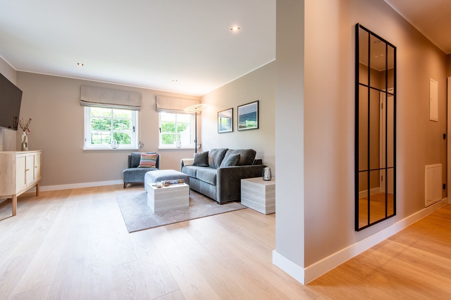 Der großzügige Wohnbereich lädt mit einer stilvollen Einrichtung, einem Boxspring-Schlafsofa und einer einladenden Atmosphäre zum Verweilen ein. Hier können Sie entspannte Stunden mit der Familie verbringen oder den Tag bei einem Film ausklingen lassen. Der angrenzende Essbereich bietet ausreichend Platz für gemeinsame Mahlzeiten und gesellige Abende.