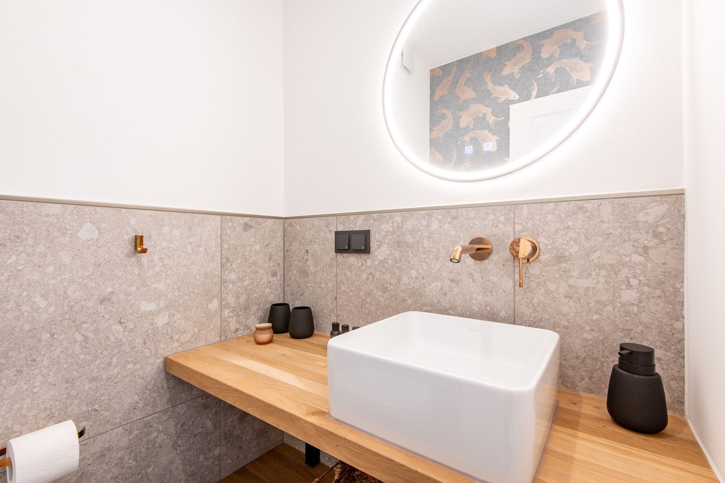 Das moderne Badezimmer ist mit einer ebenerdigen Dusche ausgestattet und ein Gäste-WC sorgt zusätzlich für Komfort. Highlight ist der gemeinschaftlich nutzbare Wellnessbereich mit Sauna und Fitnessgeräten, der Ihnen pure Entspannung bietet.