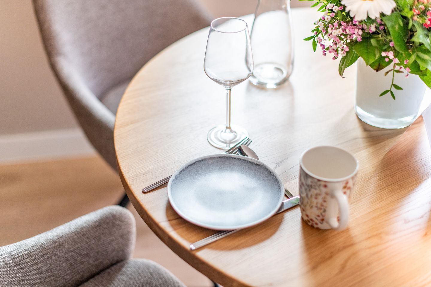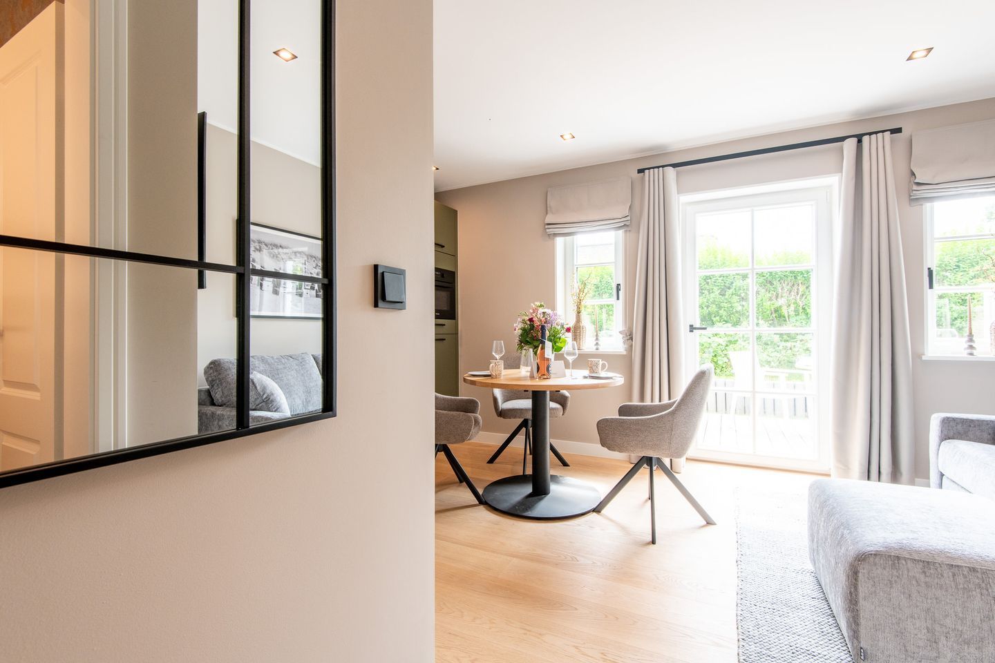 Der gemütliche Wohnbereich lädt mit einer stilvollen Einrichtung und einer einladenden Atmosphäre zum Verweilen ein. Hier können Sie entspannte Stunden zu zweit verbringen oder den Tag bei einem Film ausklingen lassen. Der angrenzende Essbereich bietet Platz für gemeinsame Mahlzeiten und schöne Abende. Auf der großen Süd-Terrasse scheint die Sonne nahezu den ganzen Tag für Sie.