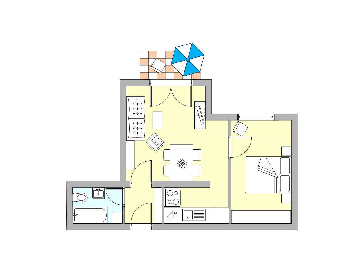 Die Ferienwohnung verfügt über ein Schlafzimmer und ein Badezimmer mit Badewanne und WC. Besonders familienfreundlich ist die Lage der Unterkunft, nur ca. 10 m vom Strand und der Badestelle entfernt. Auch der nächste Golfplatz ist nur ca. 3 km entfernt.