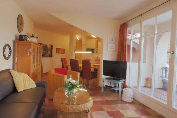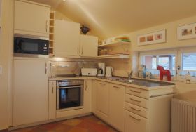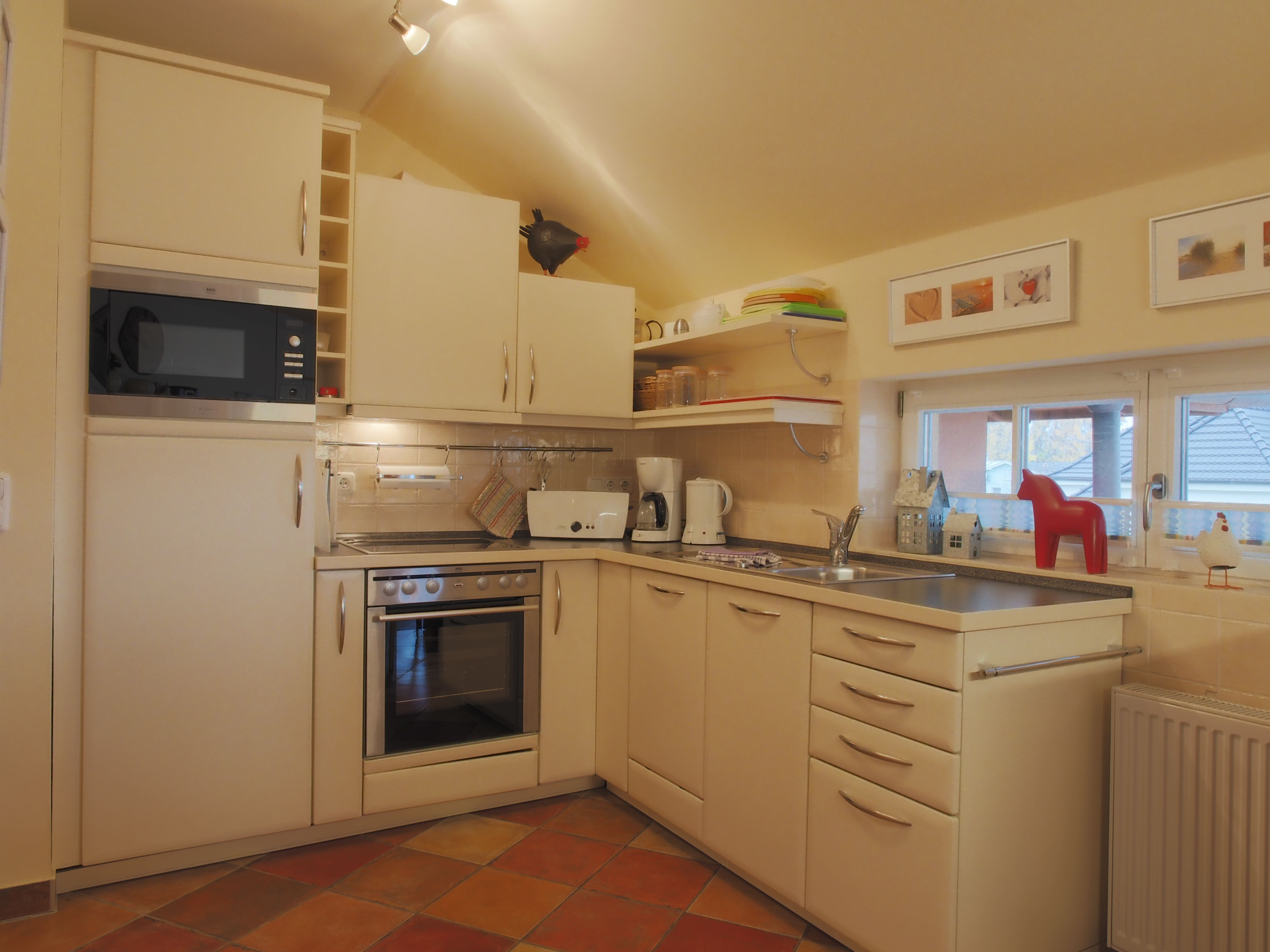 Die offene, aber separate Küche wird vom Wohnraum durch den großen Esszimmertisch getrennt, so dass der gesamte Wohn-/Essbereich großzügig und freundlich wirkt. Mit den modernen Geräten in der Küche macht das Kochen auch im Urlaub Spaß. (4-Platten-Ceran-Feld, Mikrowelle, Kühlschrank, Geschirrspüler, Kaffeemaschine, Toaster, Mixer, Eierkocher, Wasserkocher und komplettes Geschirr).