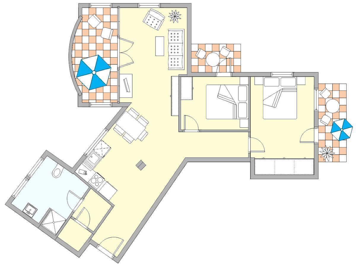 Morgens bis in den Mittag können Sie bei Sonnenschein auf dem kleinen Balkon (Ostseite) des Schlafzimmers frühstücken. Der Balkon vom zweiten Schlafzimmer bietet Schatten bei großer Wärme. Ab nachmittags genießen Sie dann bis in den späten Abend die Sonne auf dem überdachten Balkon des Wohnzimmers.