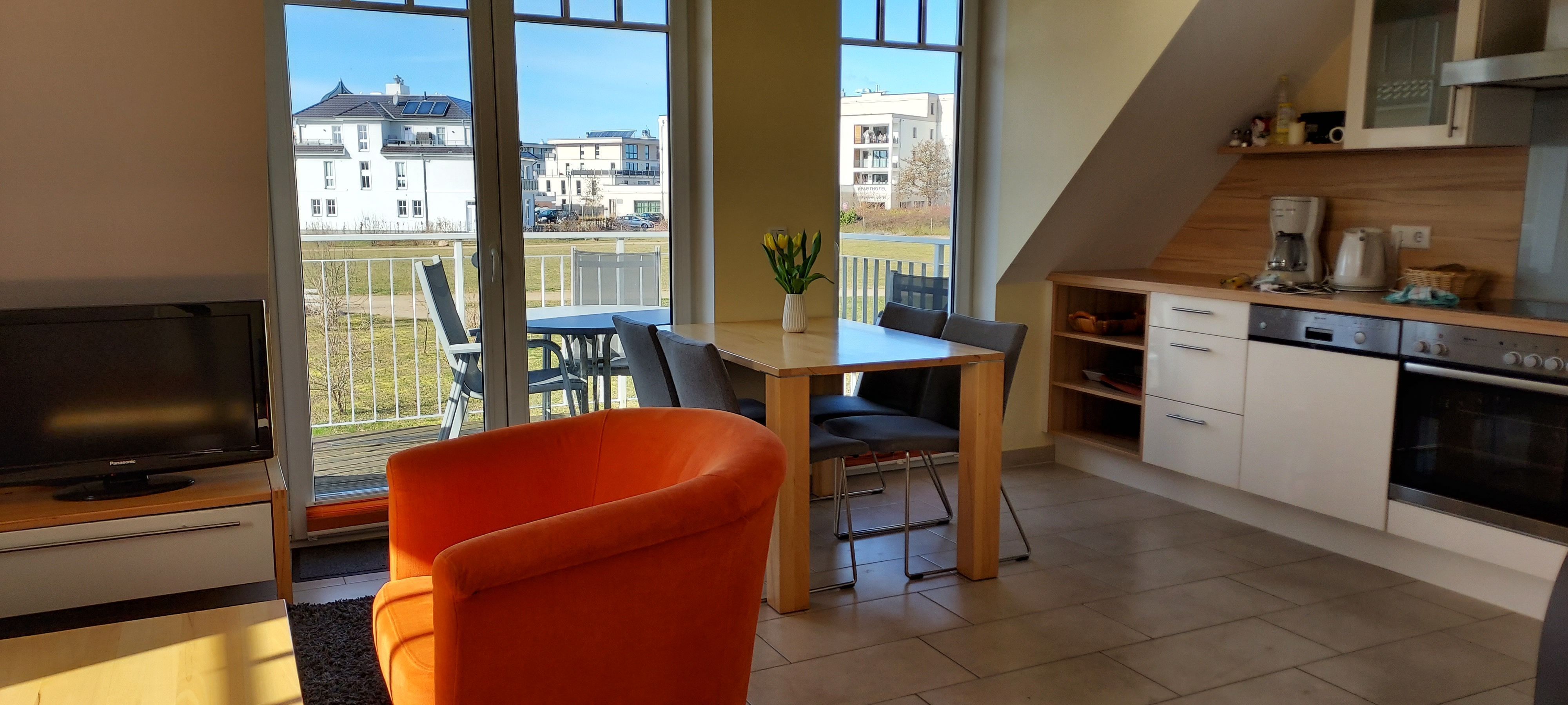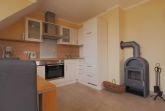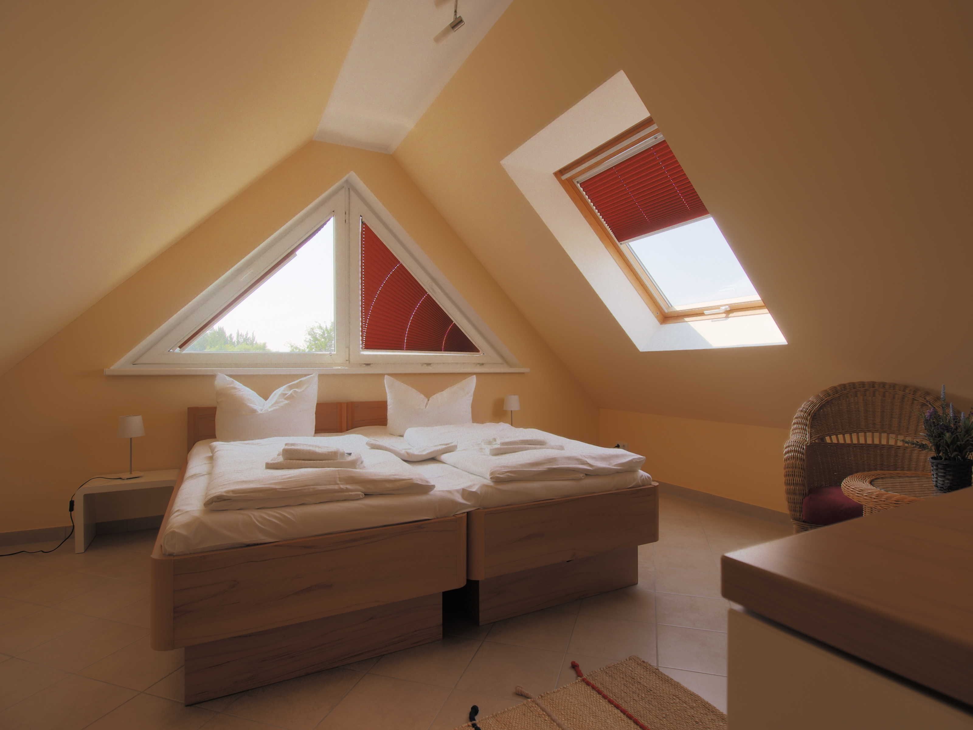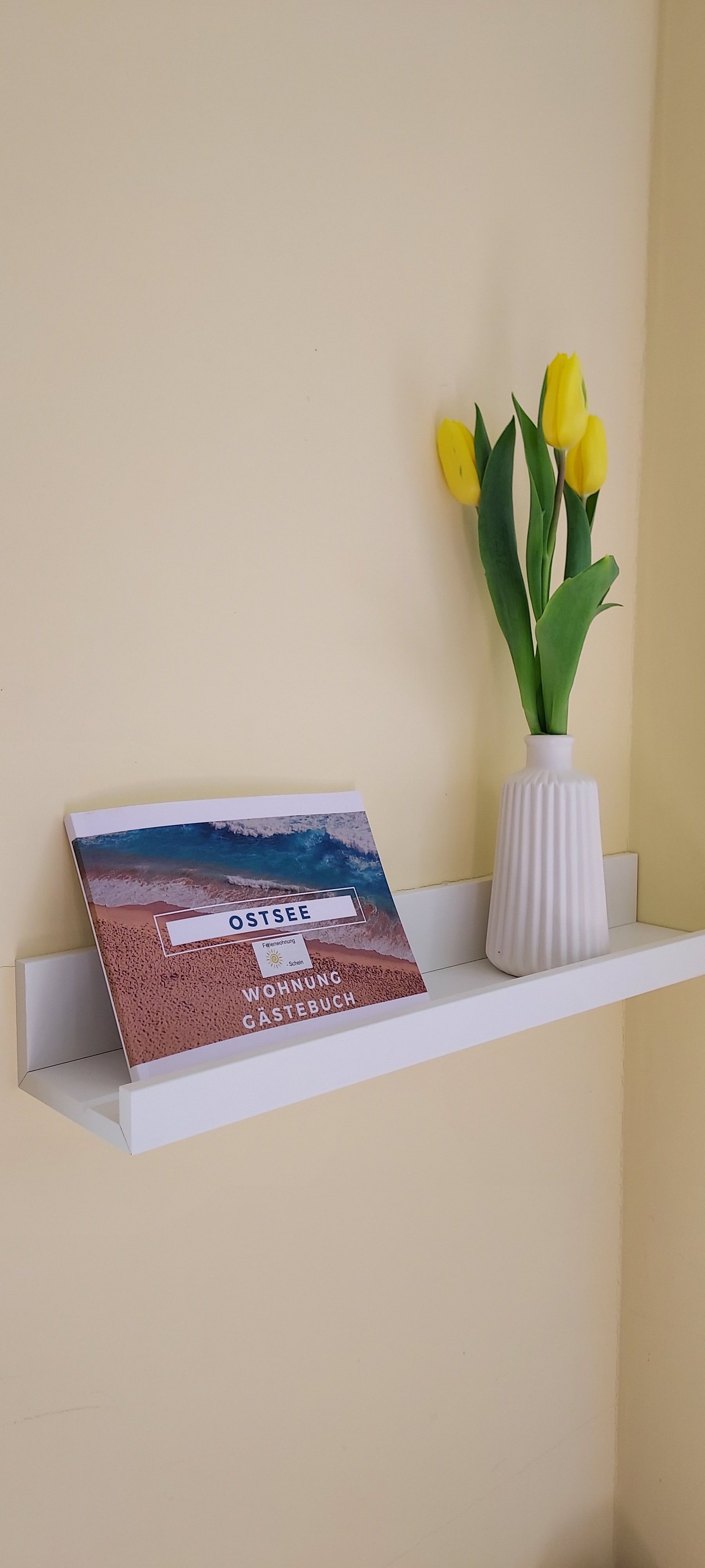 Die Ferienwohnung befindet sich im linken Obergeschoss und hat eine Größe von 65 Quadratmetern. Sie verfügt über zwei separate Schlafzimmer, jedes mit einem großen Doppelbett und einem Kleiderschrank ausgestattet. Das zweite Schlafzimmer befindet sich auf der oberen Ebene und ist über eine innenliegende Treppe erreichbar. Es verfügt außerdem über einen Schlafsessel. Die Küche ist mit einem Geschirrspüler, Backofen und Kaffeemaschine ausgestattet. Im Badezimmer gibt es eine Dusche und eine Waschmaschine. Zwei Balkone gehören zur Wohnung, einer ist vom Wohnbereich aus zugänglich, der andere vom Schlafzimmer auf der Wohnebene. Handtücher und Bettwäsche werden in der Erstausstattung gestellt. Für eine gemütliche Atmosphäre sorgt ein schöner Kaminofen, besonders in der kalten Jahreszeit oder bei entspannten Abenden. Haustiere sind gegen Aufpreis erlaubt. Ein PKW-Stellplatz steht während des Aufenthaltes zur Verfügung.