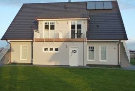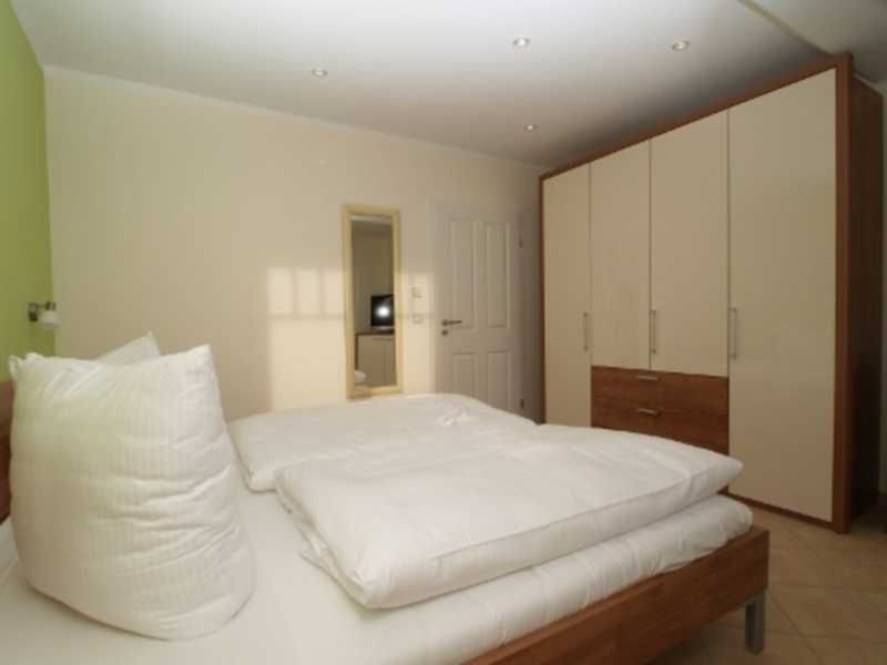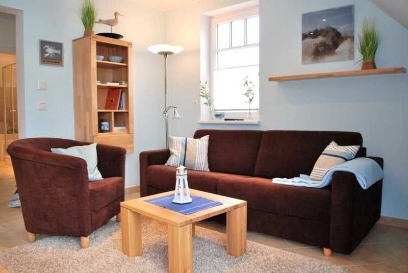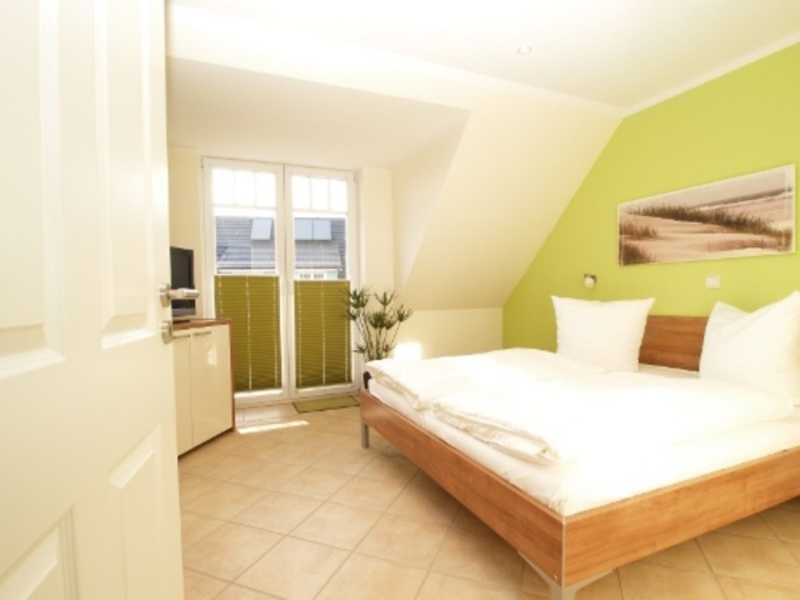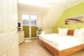 Die Ferienwohnung La Mer befindet sich im Obergeschoss links und umfasst eine Fläche von 60 Quadratmetern. Sie verfügt über einen geräumigen Wohnbereich sowie zwei separate Schlafzimmer. Eines der Schlafzimmer ist mit einem großen Doppelbett und einem Kleiderschrank ausgestattet. Das zweite Schlafzimmer befindet sich auf der oberen Ebene der Maisonette-Wohnung und ist über eine innenliegende Treppe zu erreichen. Dort stehen zwei Einzelbetten zur Verfügung.