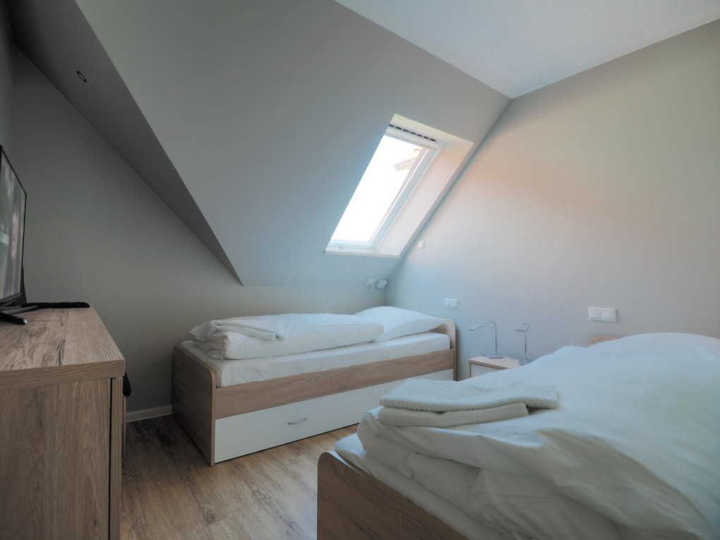 Diese 3-Zimmer-Wohnung befindet sich im Obergeschoss und zeichnet sich durch ihre offene und gemütliche Gestaltung aus. Im Wohnzimmer steht ein Schlafsofa zur Verfügung. Die Küche ist vollständig ausgestattet und öffnet sich zum Essbereich sowie zum Wohnbereich mit einer Sitzecke und einem Fernseher. Vom Wohnbereich aus gelangt man auf den Westbalkon, auf dem sich Gartenmöbel befinden und von dem aus man wunderschöne Sonnenuntergänge beobachten kann. Die Wohnung verfügt außerdem über zwei Schlafzimmer, die jeweils mit einem Fernseher ausgestattet sind, ein Duschbad mit Tageslicht, ein Gäste-WC und eine Abstellkammer. Zusätzlich zum umfangreichen Inventar verfügt die Wohnung über einen Fahrradschuppen und einen PKW-Stellplatz.