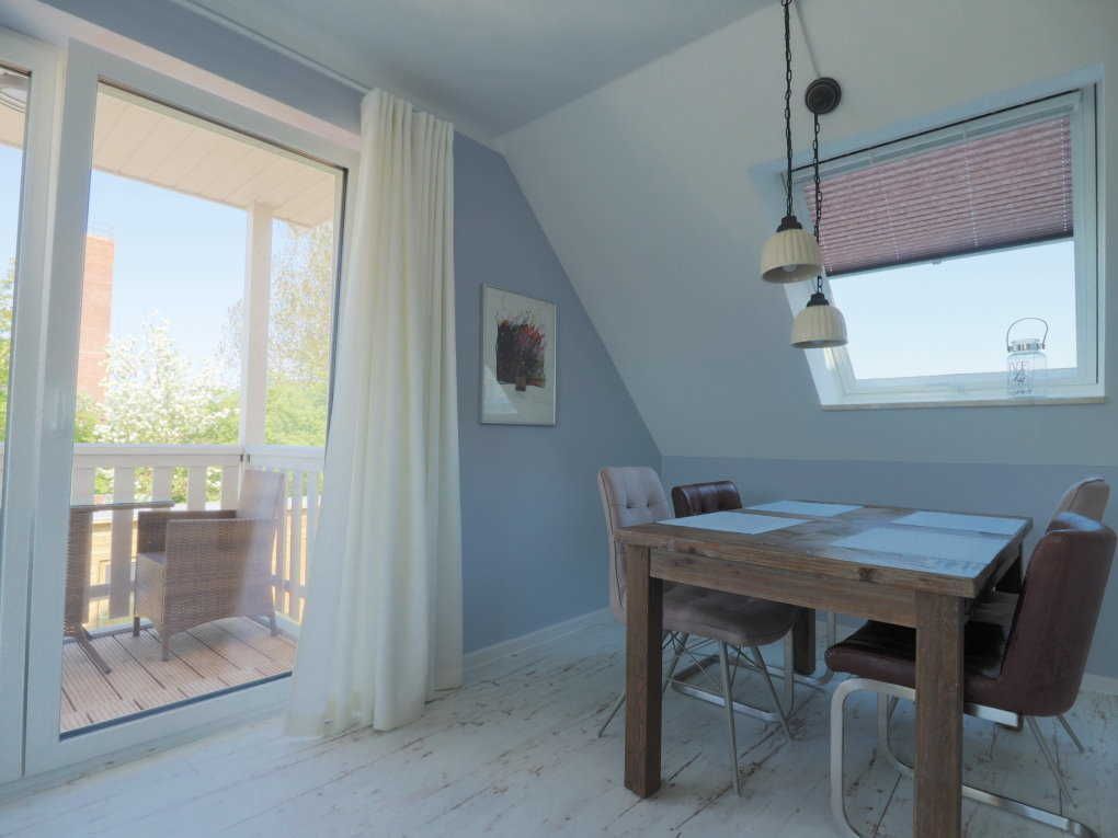 Die Wohnung befindet sich im Obergeschoss und besteht aus zwei Zimmern. Im Wohnzimmer befindet sich ein Schlafsofa, welches bei Bedarf als weitere Schlafgelegenheit genutzt werden kann. Die Küche ist vollständig ausgestattet und offen zum Wohnbereich mit Sitzecke und TV. Das Schlafsofa verfügt über eine Klappfunktion, ein integriertes Lattenrost und eine Matratze. Vom Wohnbereich aus gelangt man auf den Balkon, der mit Gartenmöbeln ausgestattet ist. Im Schlafzimmer befindet sich ein Doppelbett, ein großer Kleiderschrank mit Spiegel, ein Stuhl zur Ablage von Kleidung und ein TV. Im komfortabel ausgestatteten Duschbad gibt es eine bodengleiche Dusche, einen Kosmetikspiegel und -eimer, einen großen Spiegel und einen Föhn. In der Abstellkammer sind Stuhlauflagen für den Balkon, ein Kinderreisebett, ein Hochstuhl, ein Staubsauger, ein Bodenwischer mit Eimer, ein kleines Tischbügelbrett und ein Bügeleisen vorhanden.