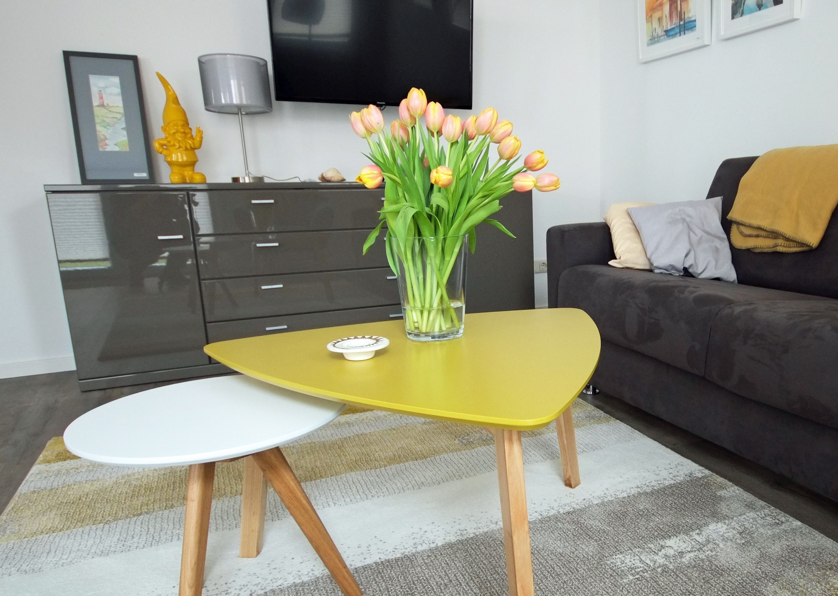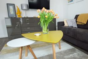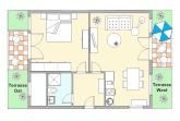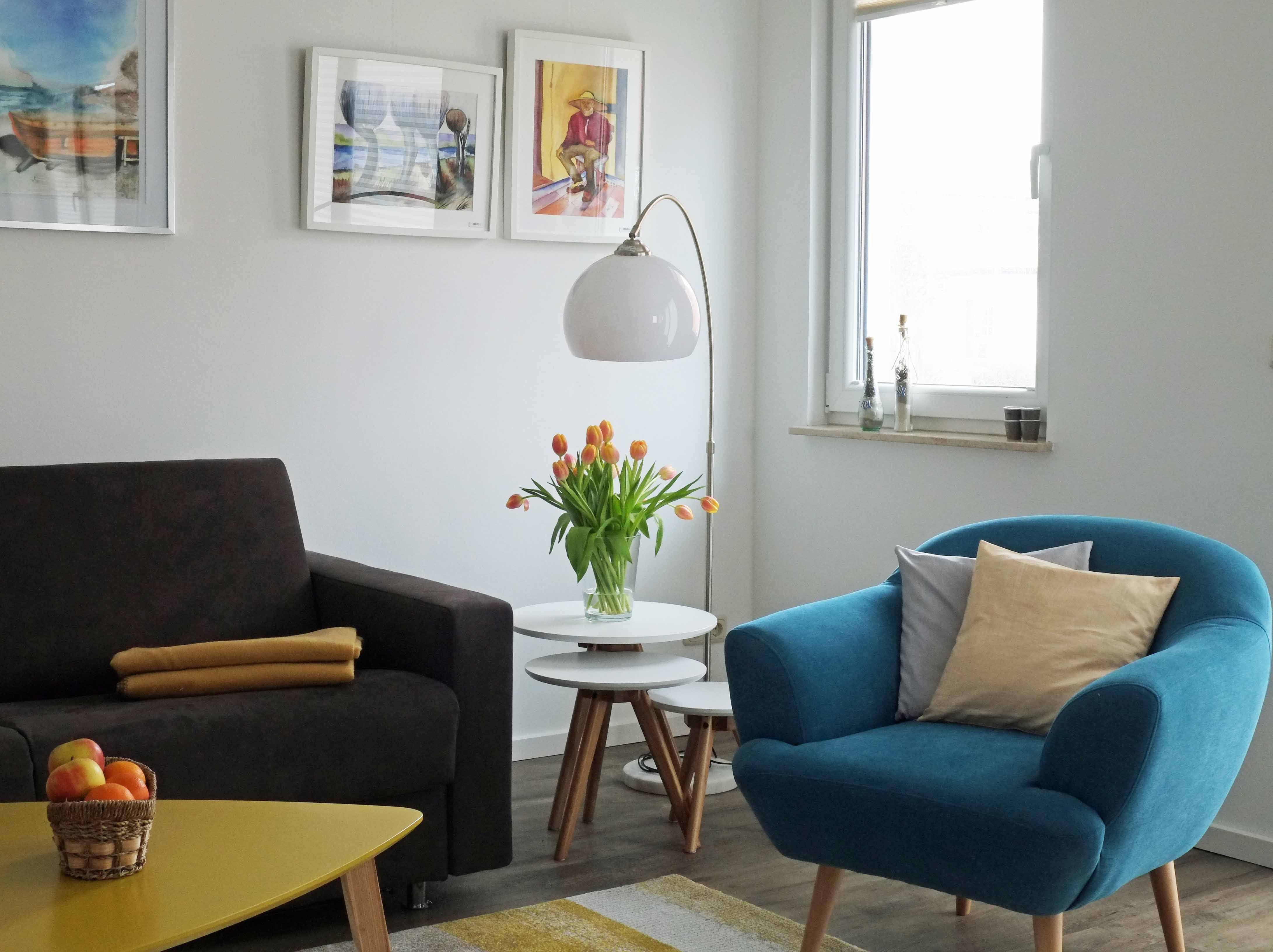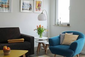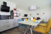 Das Apartment hat einen großen 30m² Wohnraum, Diele und Tageslicht-Duschbad mit WC. Die Küchenzeile und der Essbereich sind in den Wohnbereich integriert. Dort kann aus einem gemütlichen Faltsofa blitzschnell ein 150 x 200 m großes Doppelbett für die Kinder entstehen.