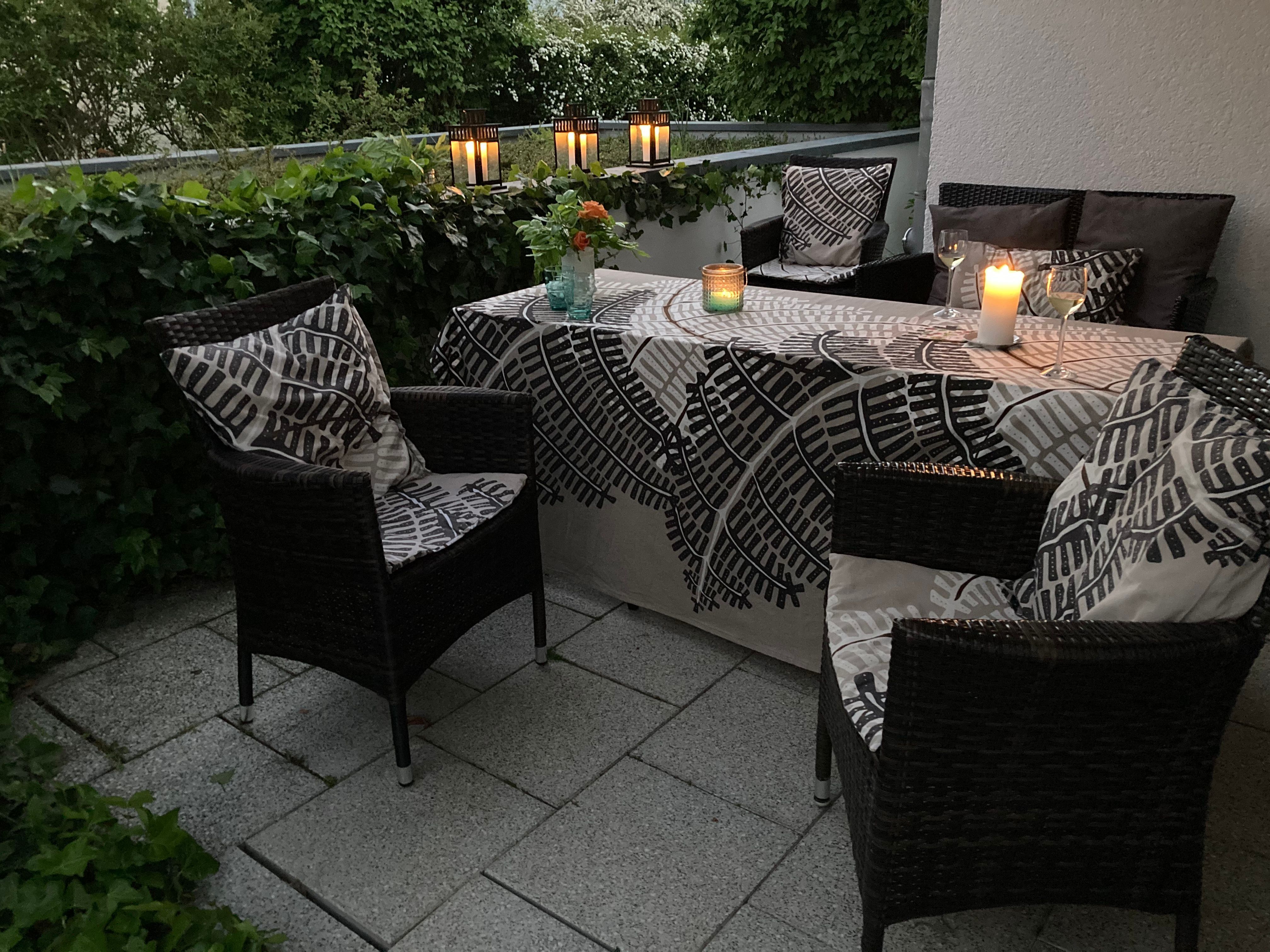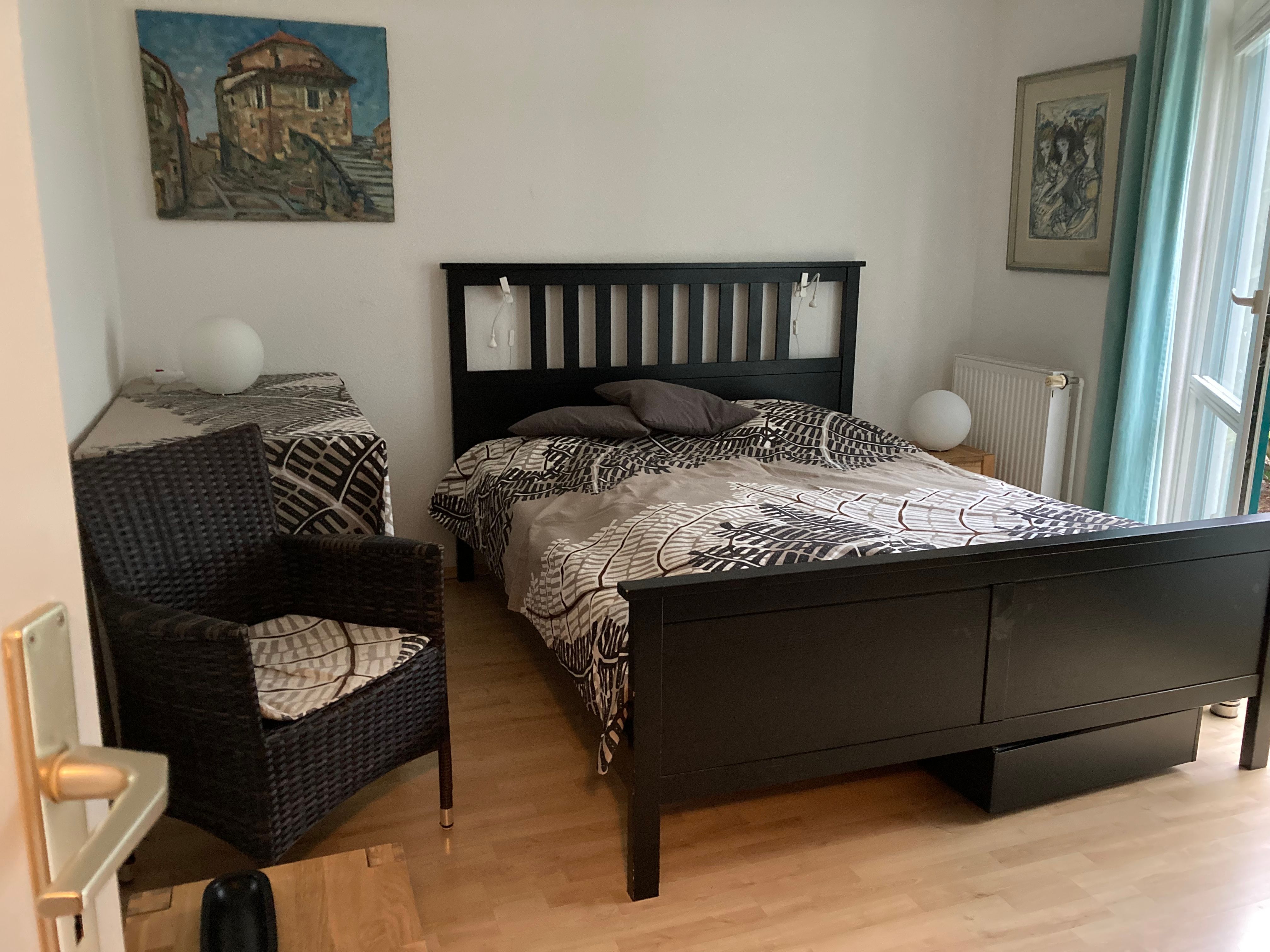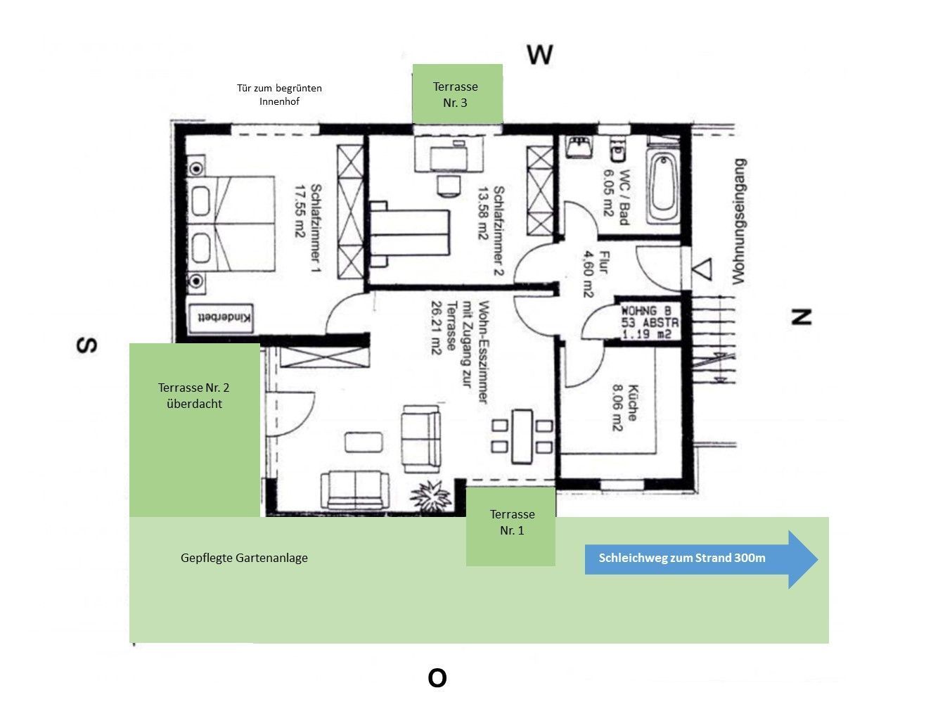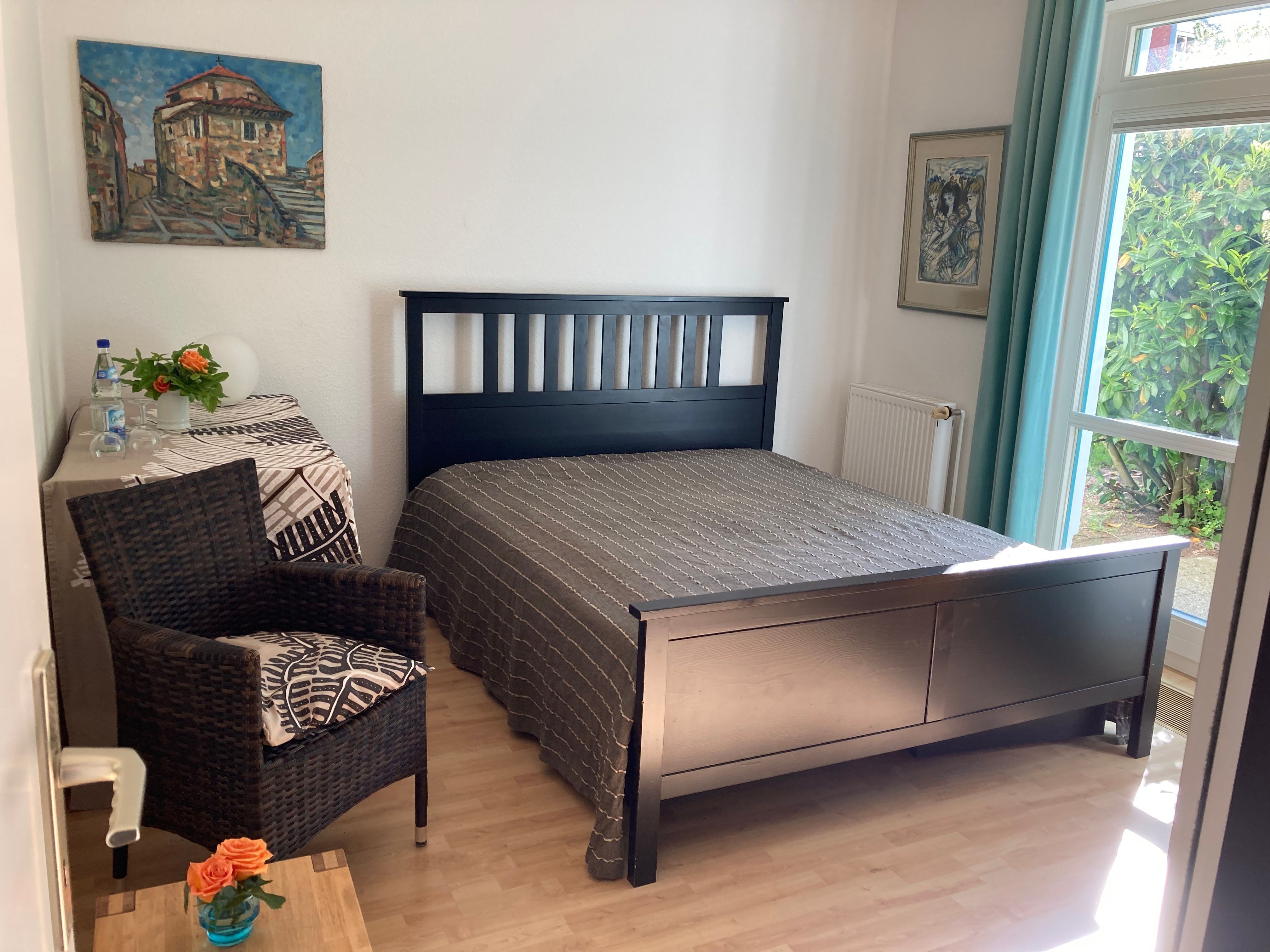 Großzügige (80 qm plus 3Terrassen) individuell u. modern eingerichtete 3-Zi-Ferienwohnung, plus große separate Küche mit Blick in den Garten, 1 Abstellkammer, 2 separate Schlafzimmer mit je Zutritt ins Grüne, gr. Bad mit Außenfenster, geräumiges Wohn-Esszimmer mit großer Fensterfront zur überdachten Terrasse (Süd) hin und weiterem Zutritt zur anderen Terrasse mit Morgensonne (Ost). Eine weitere, die 3.Terrasse geht in Richtung Westen und ist vom Schlafzimmer aus betretbar.