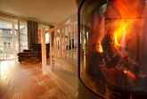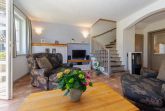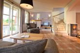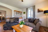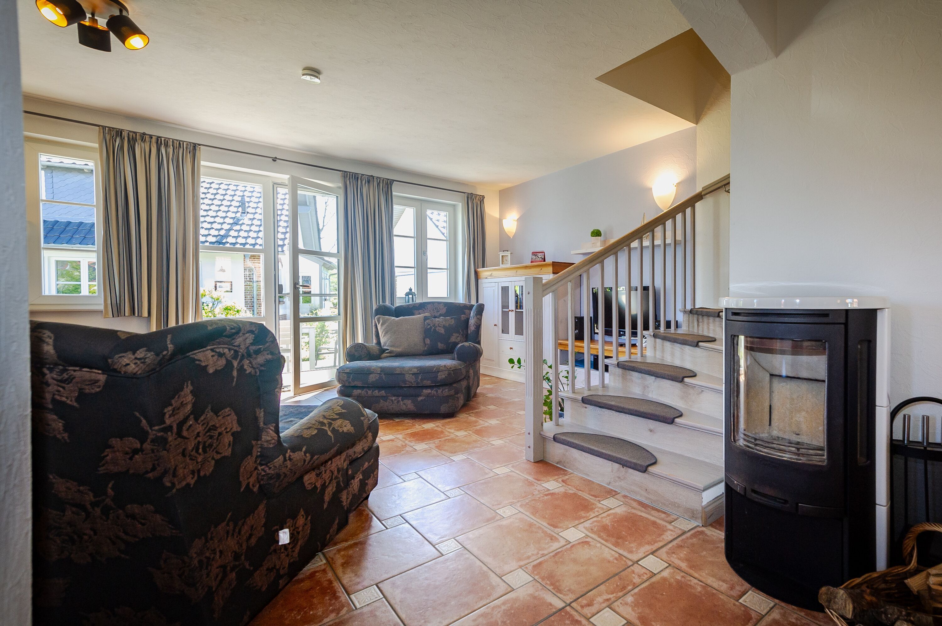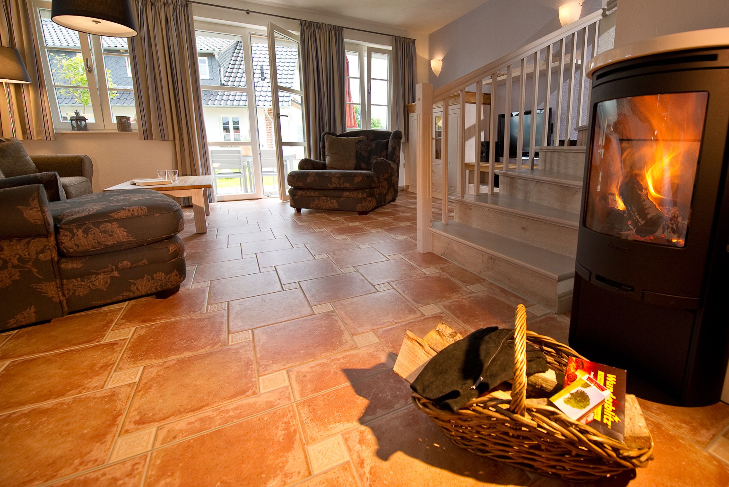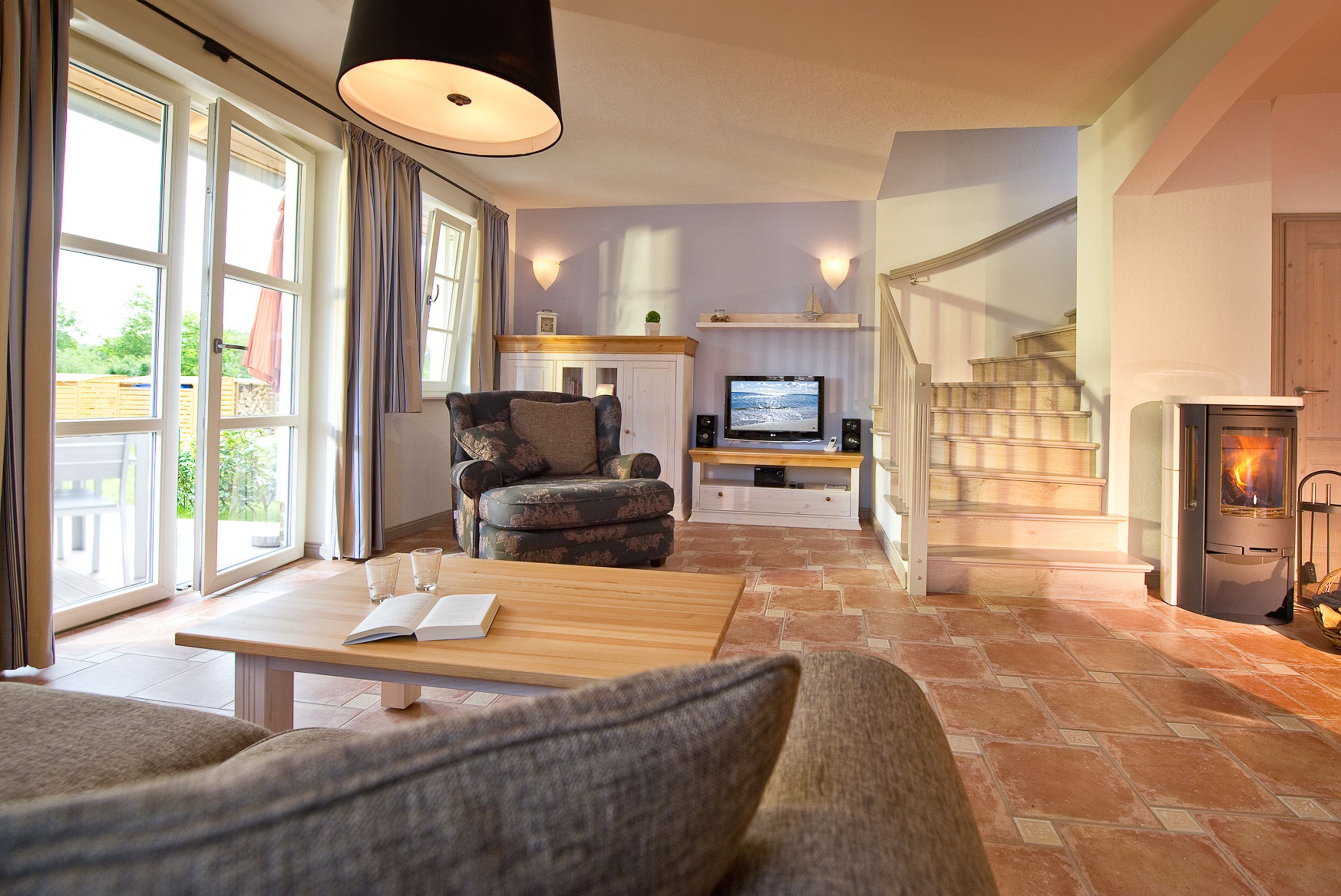 Wohnzimmer u.a. mit Kaminofen, Couch, XXL-Ohrensesseln, Flatscreen-TV, Stereoanlage mit DVD-Player, Fußbodenheizung