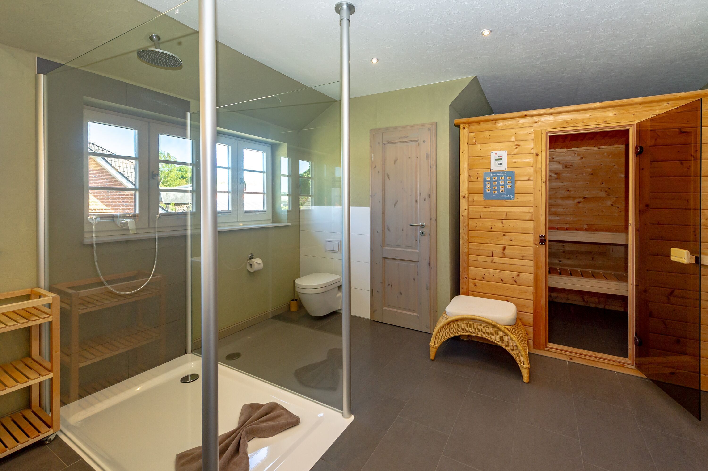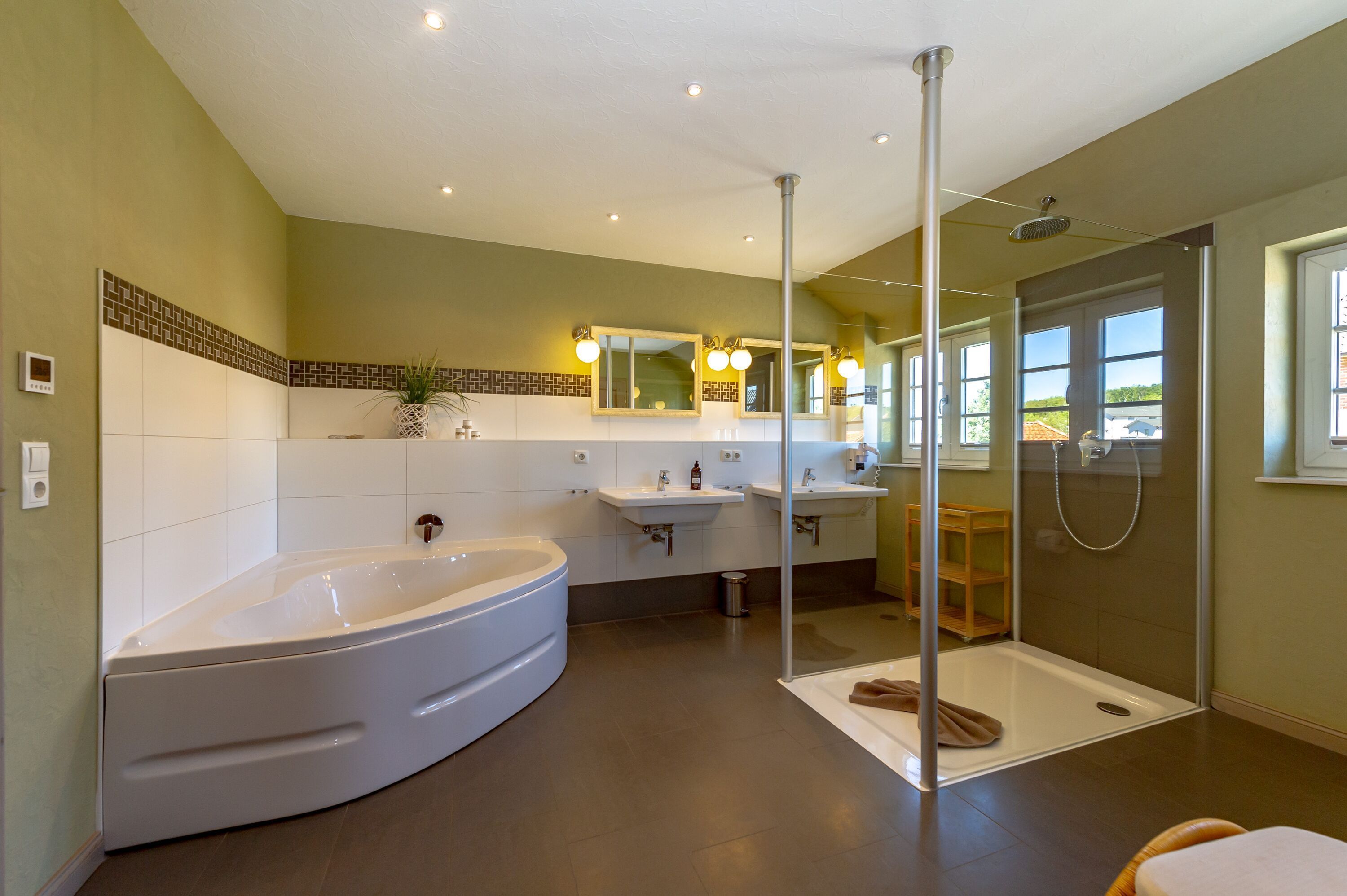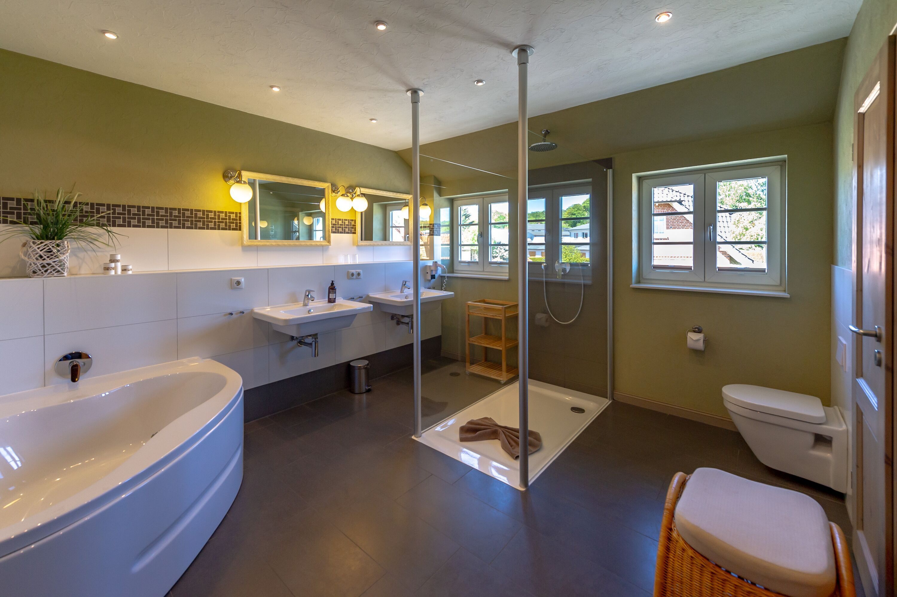 Bad mit ebenerdiger XXL-Dusche, Eckbadewanne, Sauna, Doppelwaschtisch, WC, Handtuchtrockner und Fußbodenheizung
