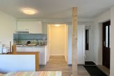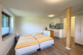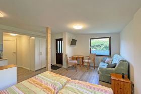 1 Zimmer mit Doppelbett, Wohn-/Essbereich, integrierter Küchenzeile, Doppelschlafcouch, Sessel, Esstisch, SAT-TV und Radio