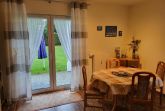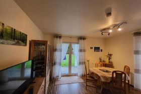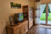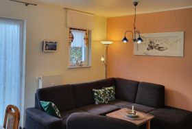 Das Wohnzimmer lädt mit einer gemütlichen Sitzecke zum Verweilen ein und bietet direkten Zugang zur Terrasse sowie zu einem privaten Garten ideal für entspannte Stunden im Freien.