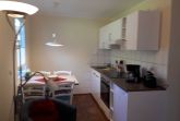 eine Küche mit Spülmaschine und Elektroherd (Backofen), sowie Wohnzimmer mit SAT/TV-Radio.