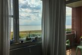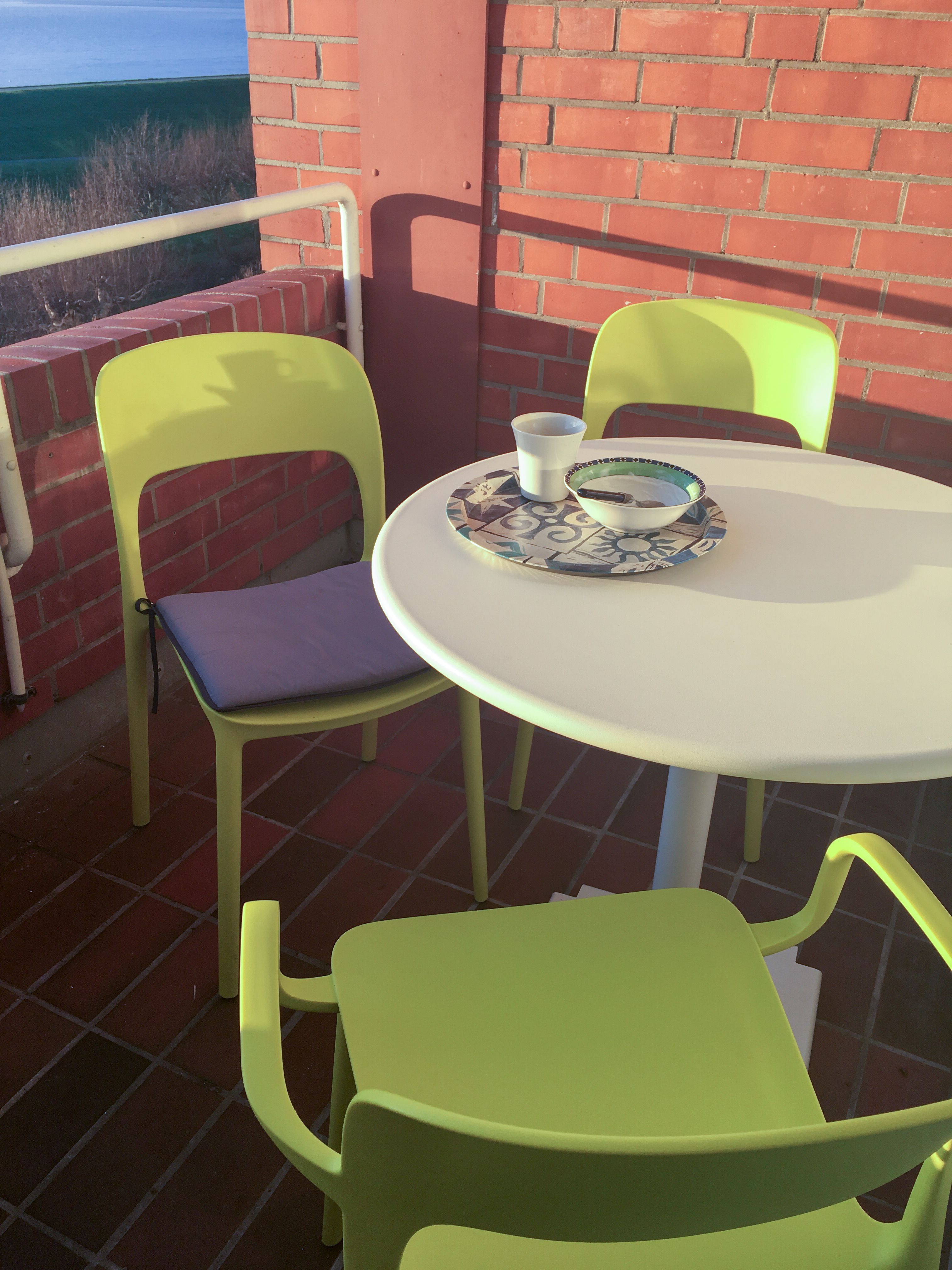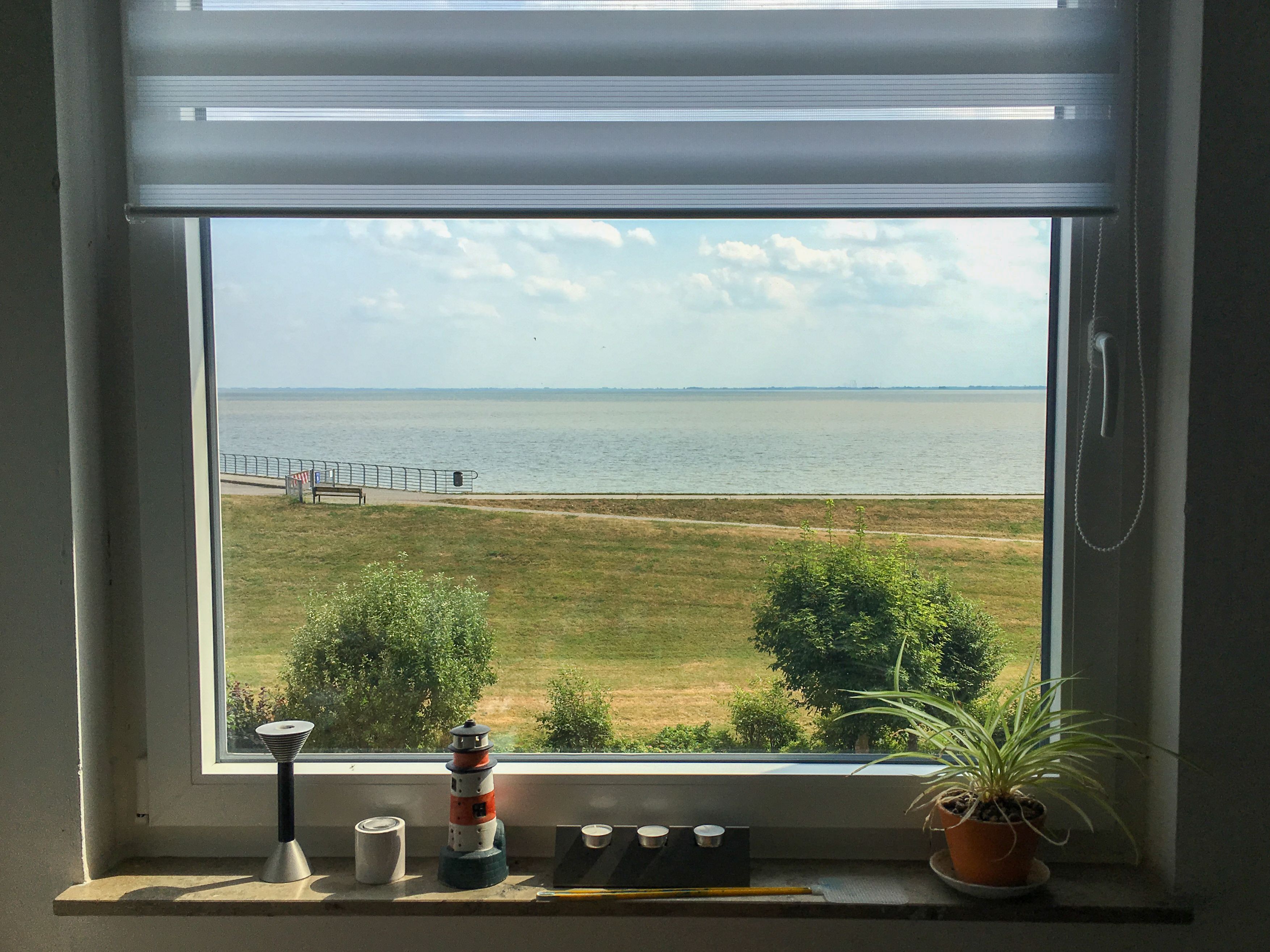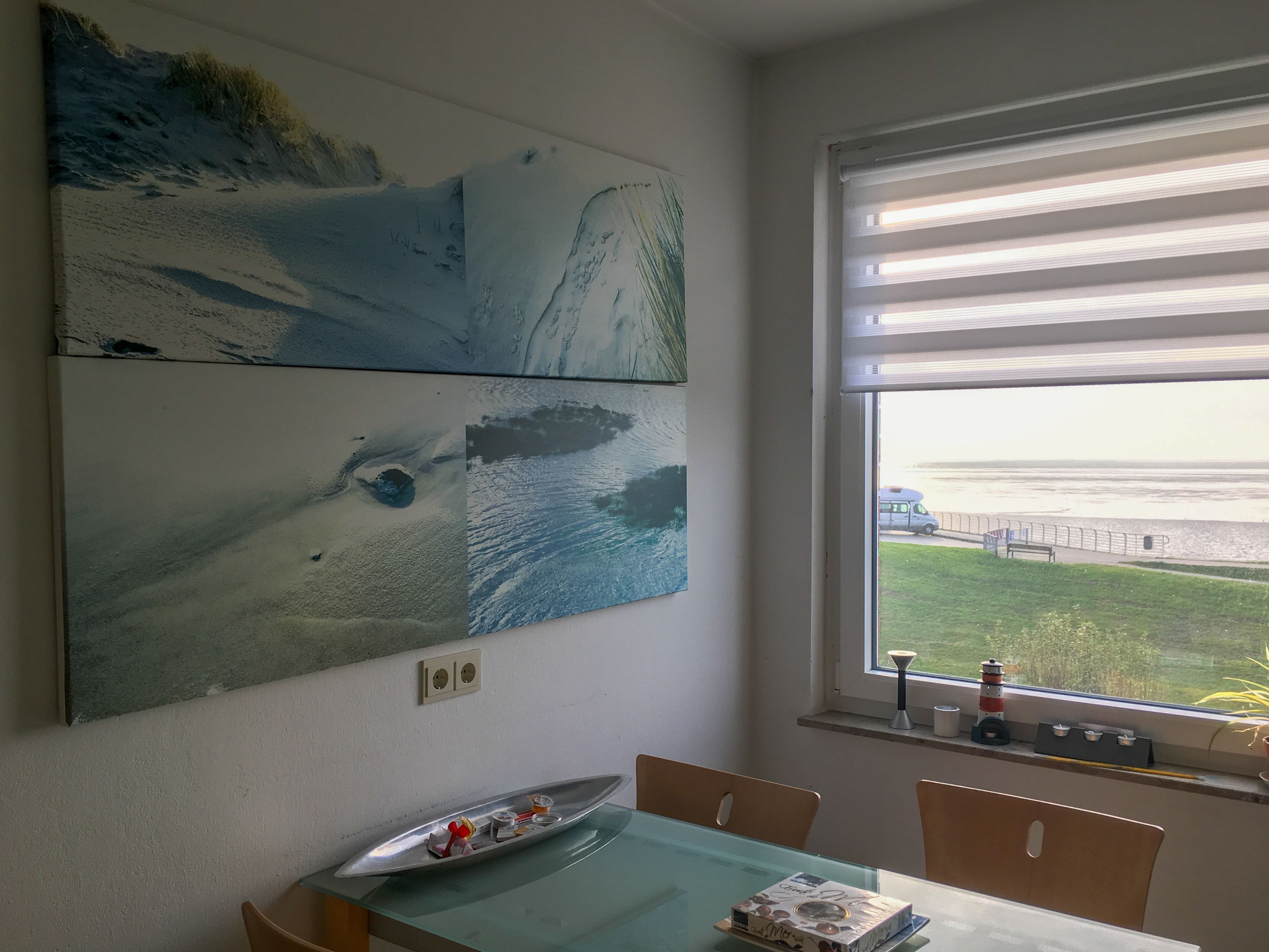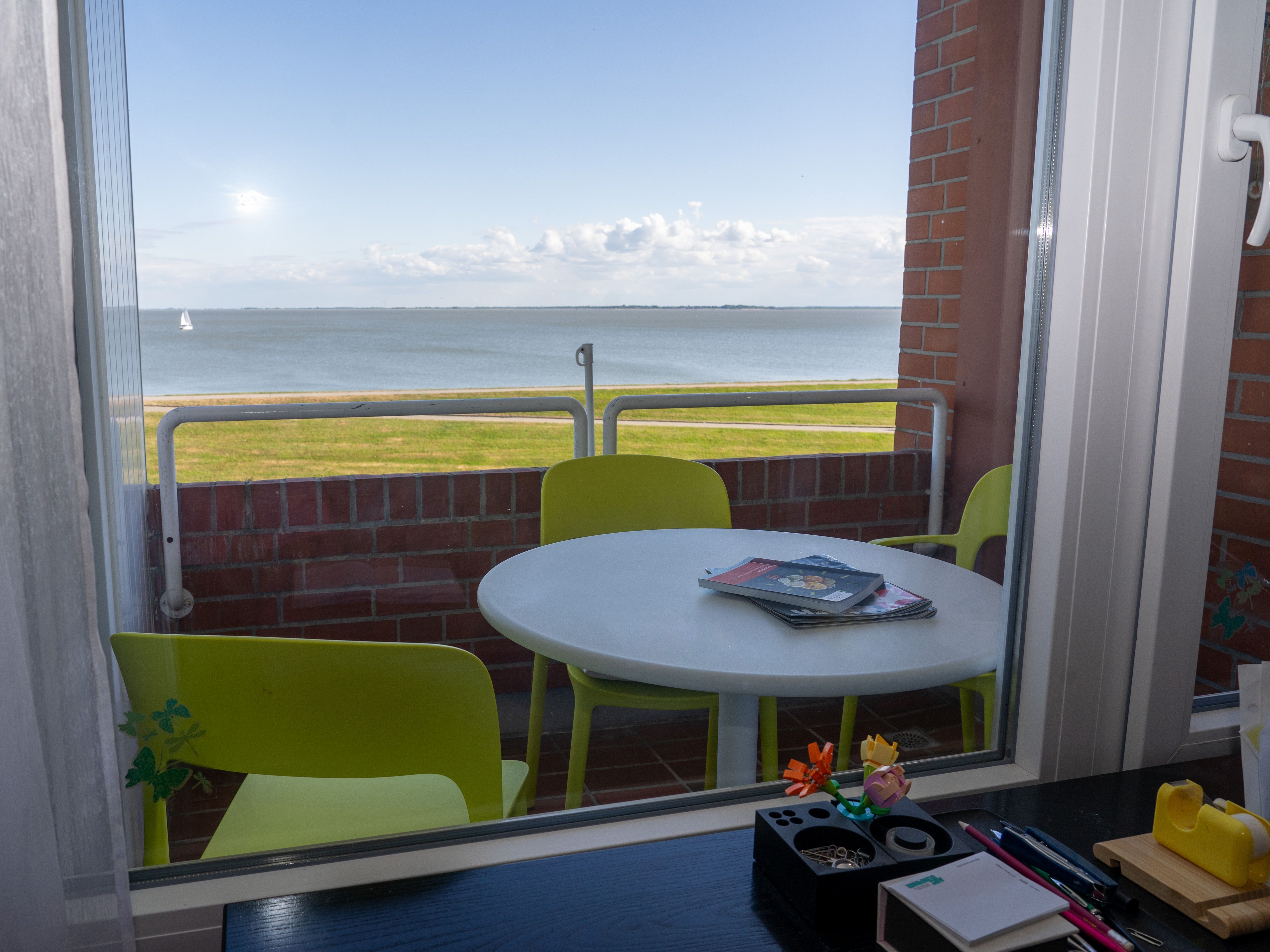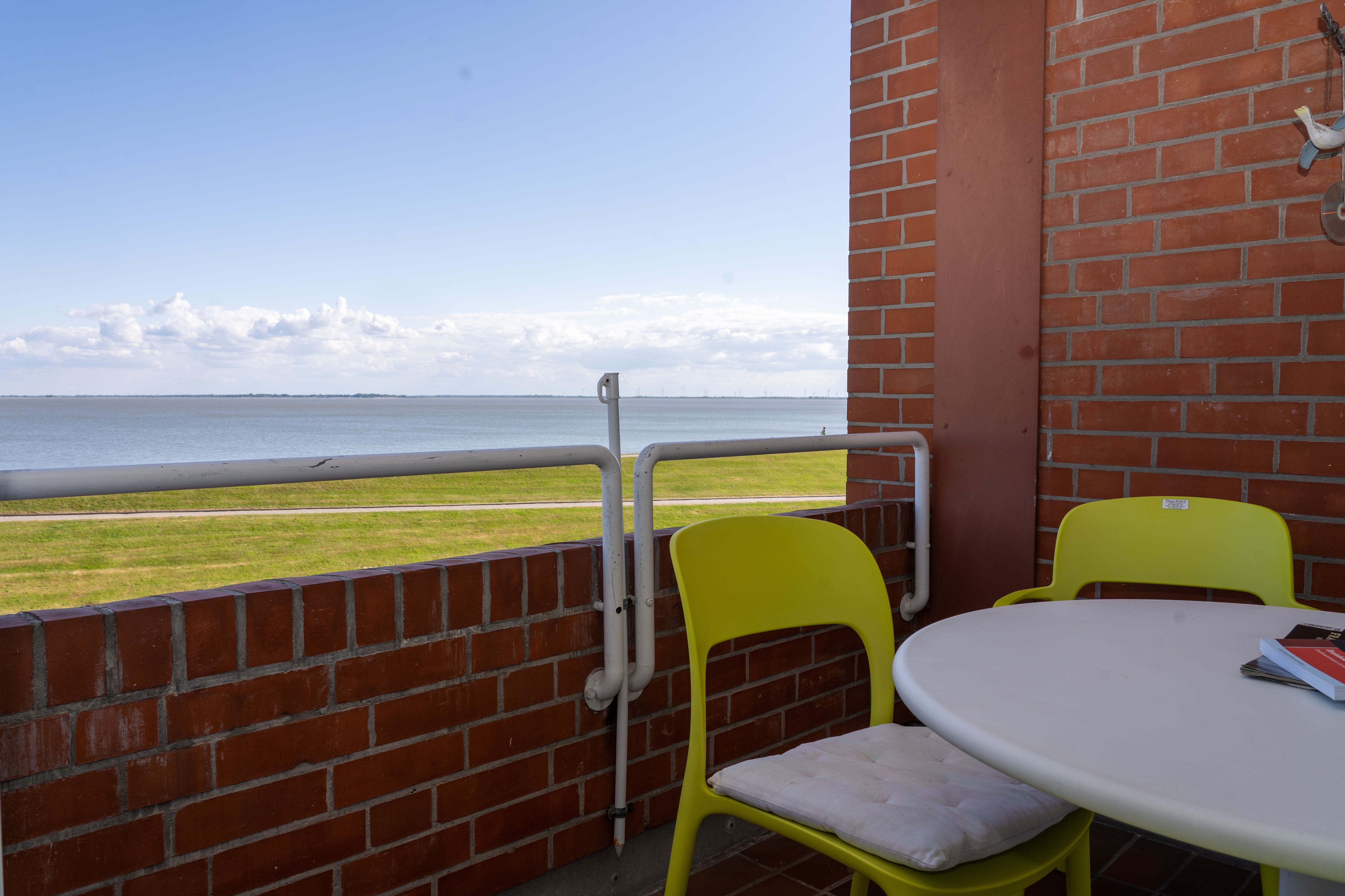 Der überdachte Balkon ist mit Tisch und Stühlen ausgestattet und ca 4 qm groß. Von hier aus kann man das Wechsel der Gezeiten mit seinem Lichterspiel perfekt erleben.
