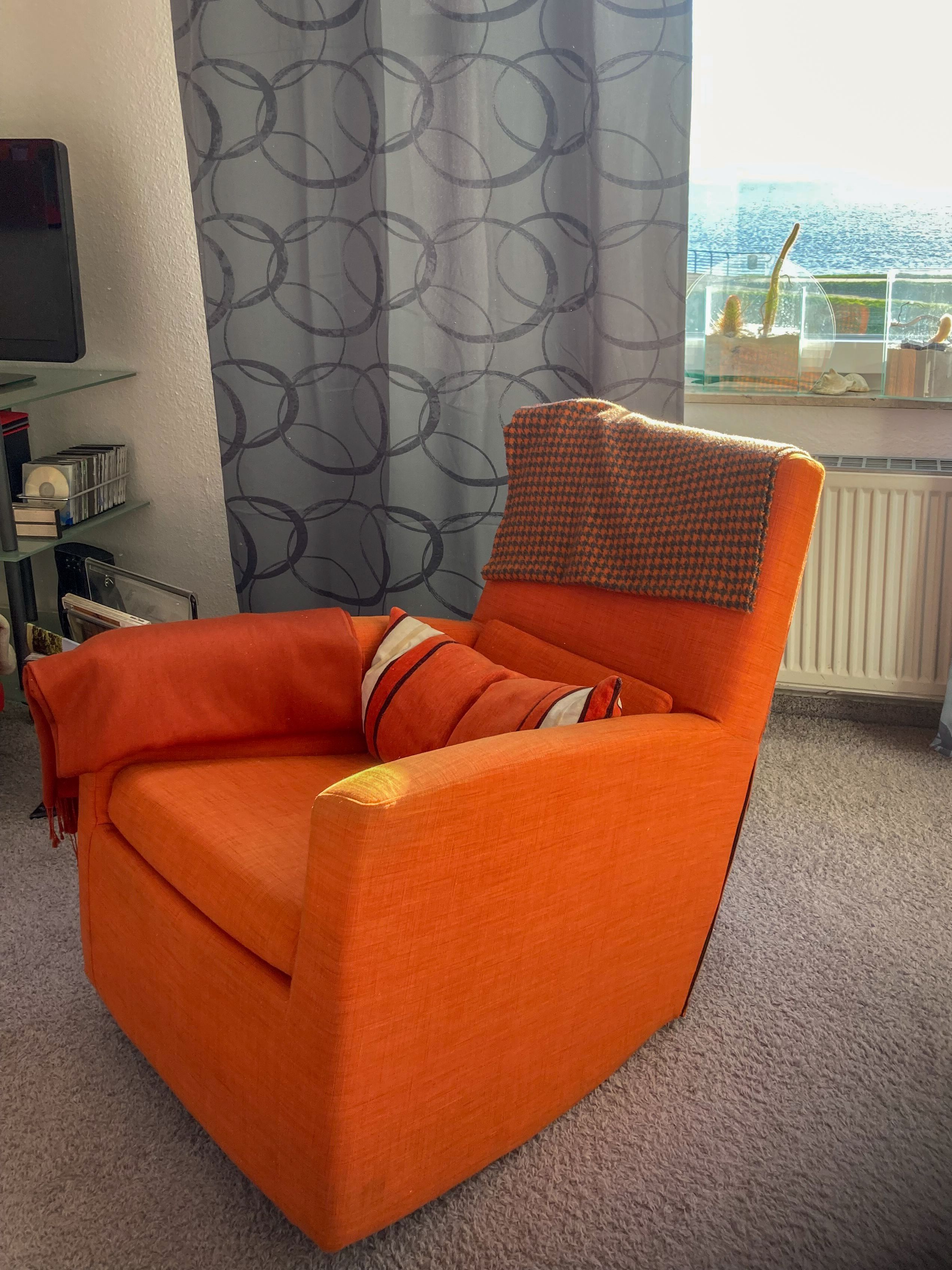 Die Ferienwohnung Horizonte & Harmonie bietet neben dem Bad und der Küche und einem Südbalkon einen kombinierten Wohn-, Schlafraum mit einem großen, französischen Doppelbett und einer Schlafcouch sowie einem gemütlichen Sessel. Am Fenster befindet sich ein großer Schreibtisch mit Meerblick. WLAN ist verfügbar.