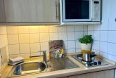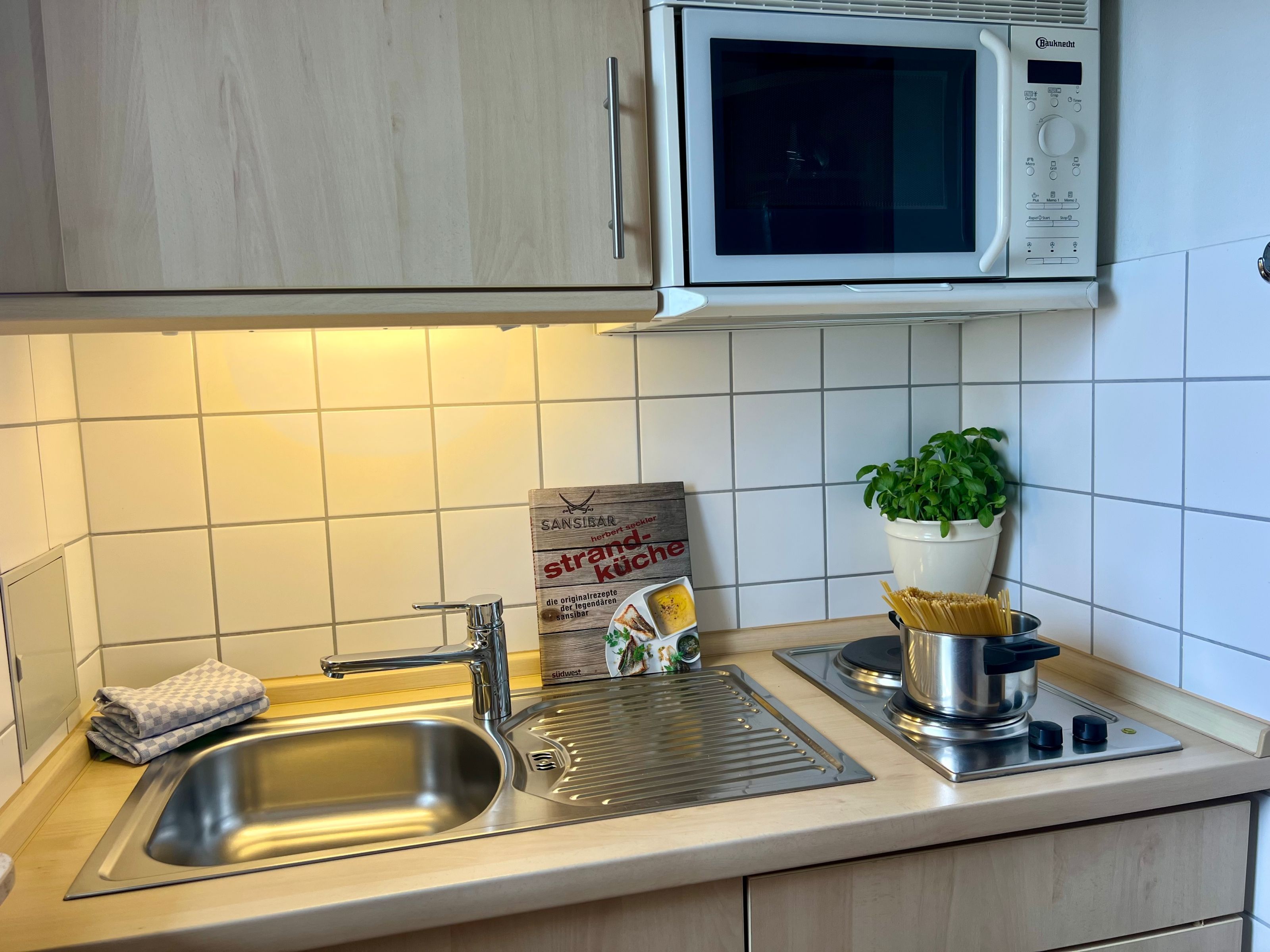 • Küche mit 2 Kochplatten, Dunstabzug, Spüle, Kühlschrank mit Gefrierfach, Kombigerät Mikrowelle/Backofen, Kaffeemaschine, Toaster und Wasserkocher. Die Küche ist komplett bestückt mit Geschirr, Bestecken, Töpfen, etc.