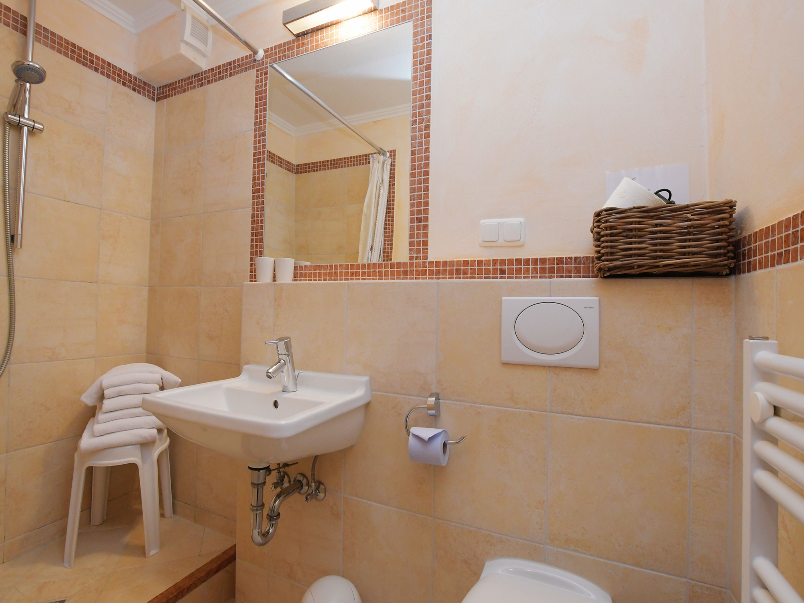 • Dusche, WC, Waschtisch mit großem Spiegel und Ablageflächen