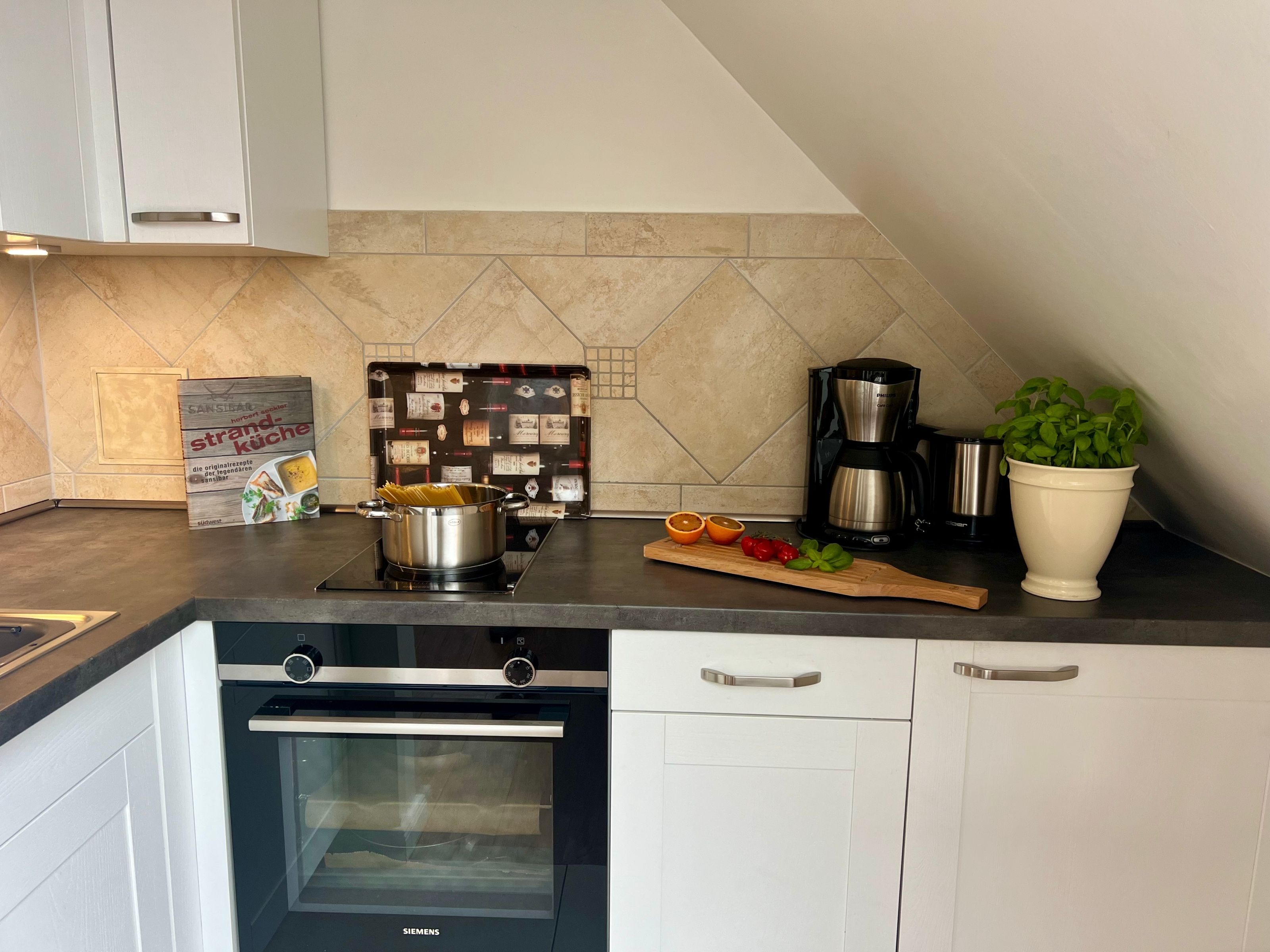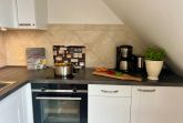 • Küchenzeile mit 2 Kochplatten, Spüle, Spülmaschine, Kühlschrank mit Gefrierfach, Mikrowelle, Kaffeemaschine, Toaster und Wasserkocher. Die Küche ist komplett bestückt mit Geschirr, Bestecken, Töpfen, etc.