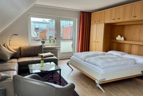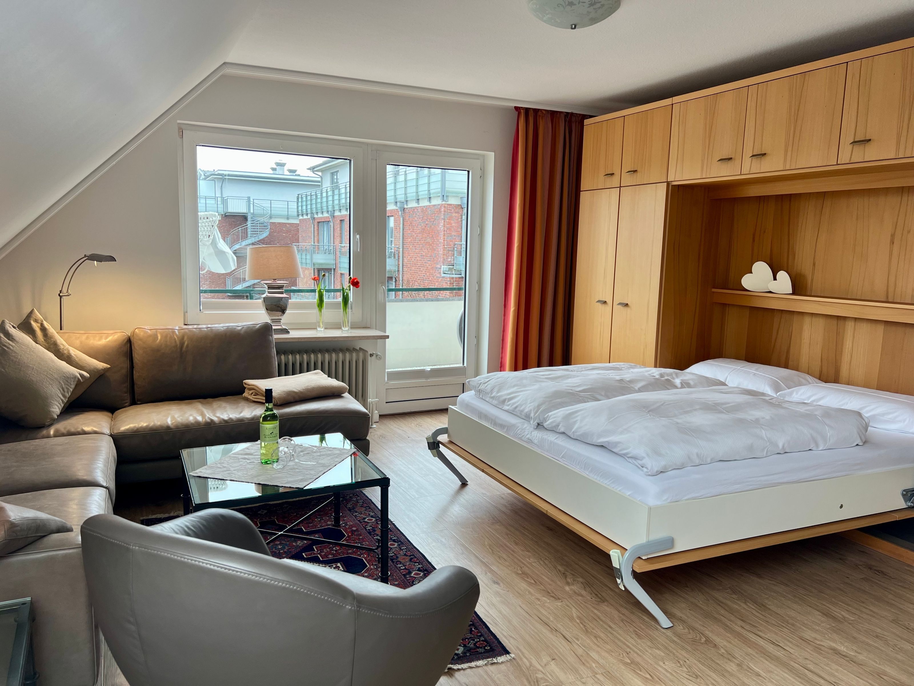 • Kombinierter Wohn-Schlafraum mit großem Schrankdoppelbett, Sitzgruppe mit Couch und 2 Sesseln, Esstisch mit Stühlen, SAT-TV, Stereoanlage, Balkon nach Südwesten mit Gartenmöbeln.
