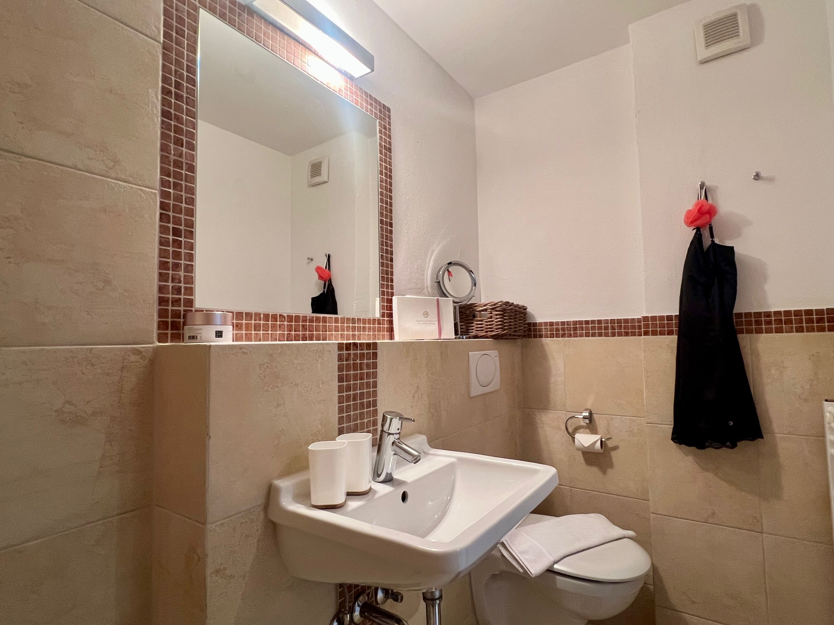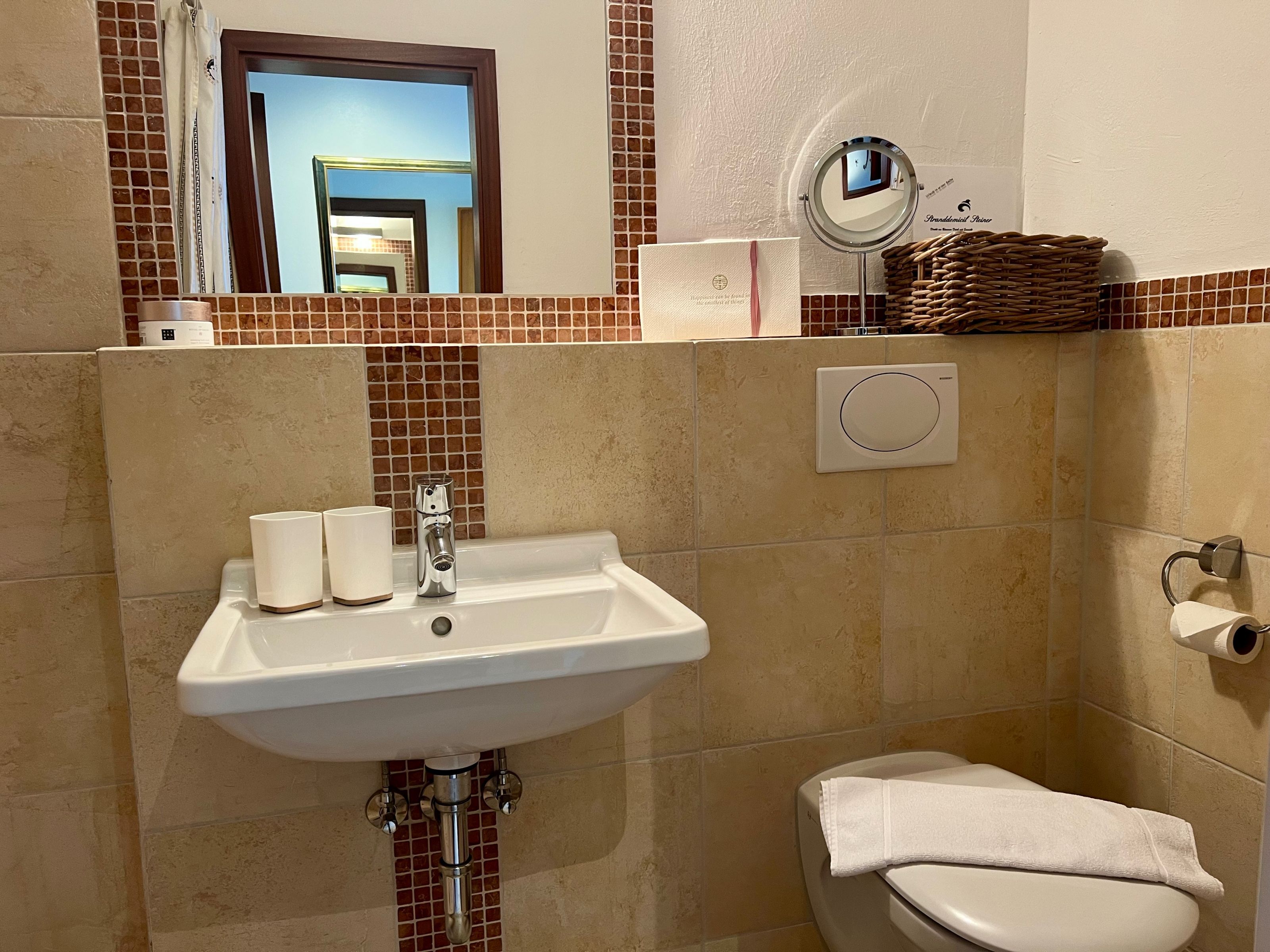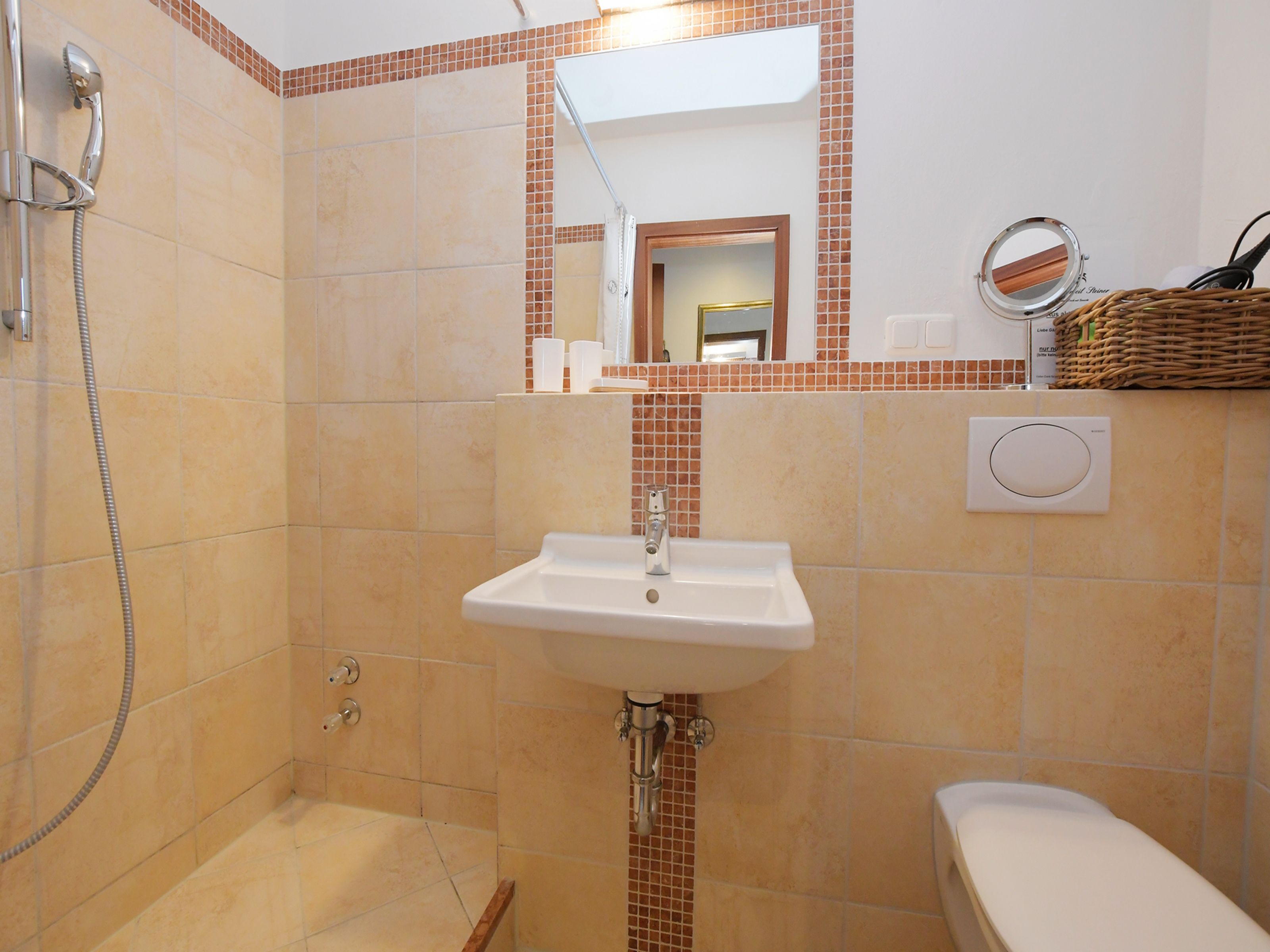 • Dusche, WC, Waschtisch mit großem Spiegel und Ablageflächen