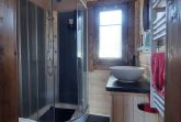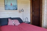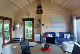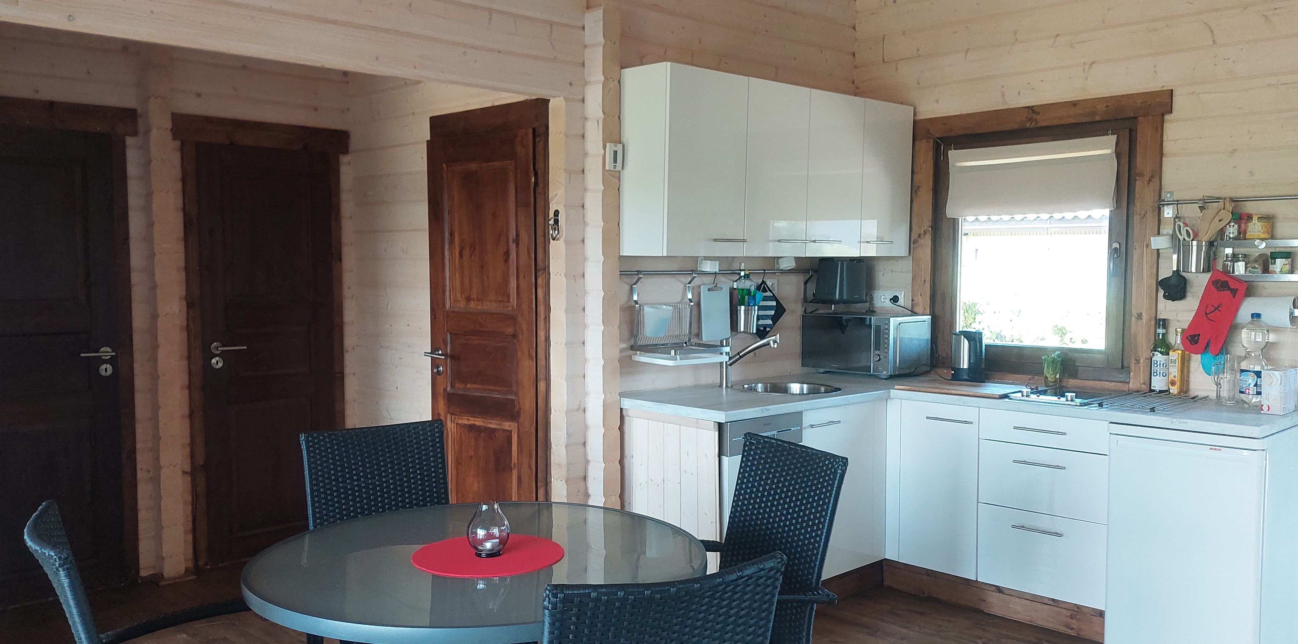 Das lichtdurchflutetet Blockhaus hat einen großzügigen Wohnbereich mit Küchenecke. Das Schlafzimmer ist mit einer französische Liege ausgestattet. Das zweite Zimmer mit Blick zum Deich verfügt über ein Schlafsofa ebenfalls für 2 Personen. Das Badezimmer mit Fenster ist mit WC, Waschbecken und Dusche, sowie einem elektr. Handtuchwärmer & Fön ausgestattet.