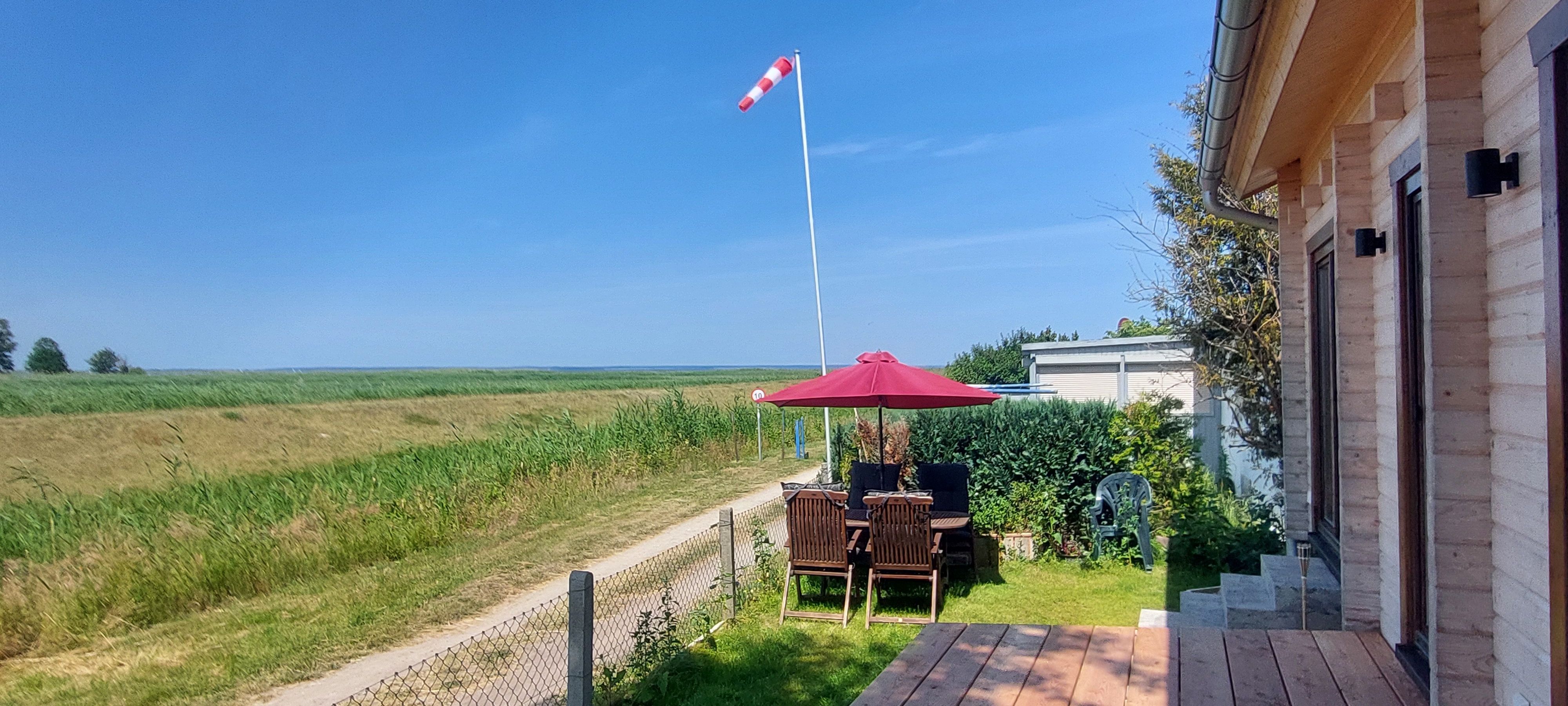 Gäste schätzen es als einen Ort der Erholung, Ruhe & der Nähe zur Natur mit sehr vielfältigen Möglichkeiten der Freizeitgestaltung. Abseits vom Trubel liegt das Blockbohlenhaus direkt hinterm Deich, am Rand der Bungalowsiedlung Am Mühlenberg. Es ist ein wunderbarer Startpunkt für Ausflüge in die herrliche Umgebung der Ueckermünder Heide, zur Ostsee und natürlich zum Haff.