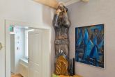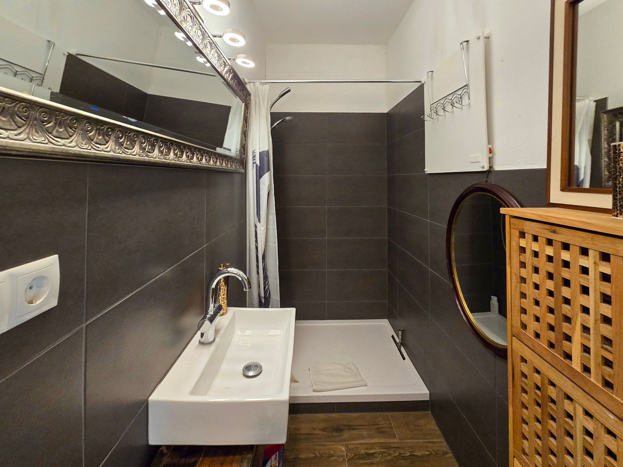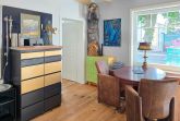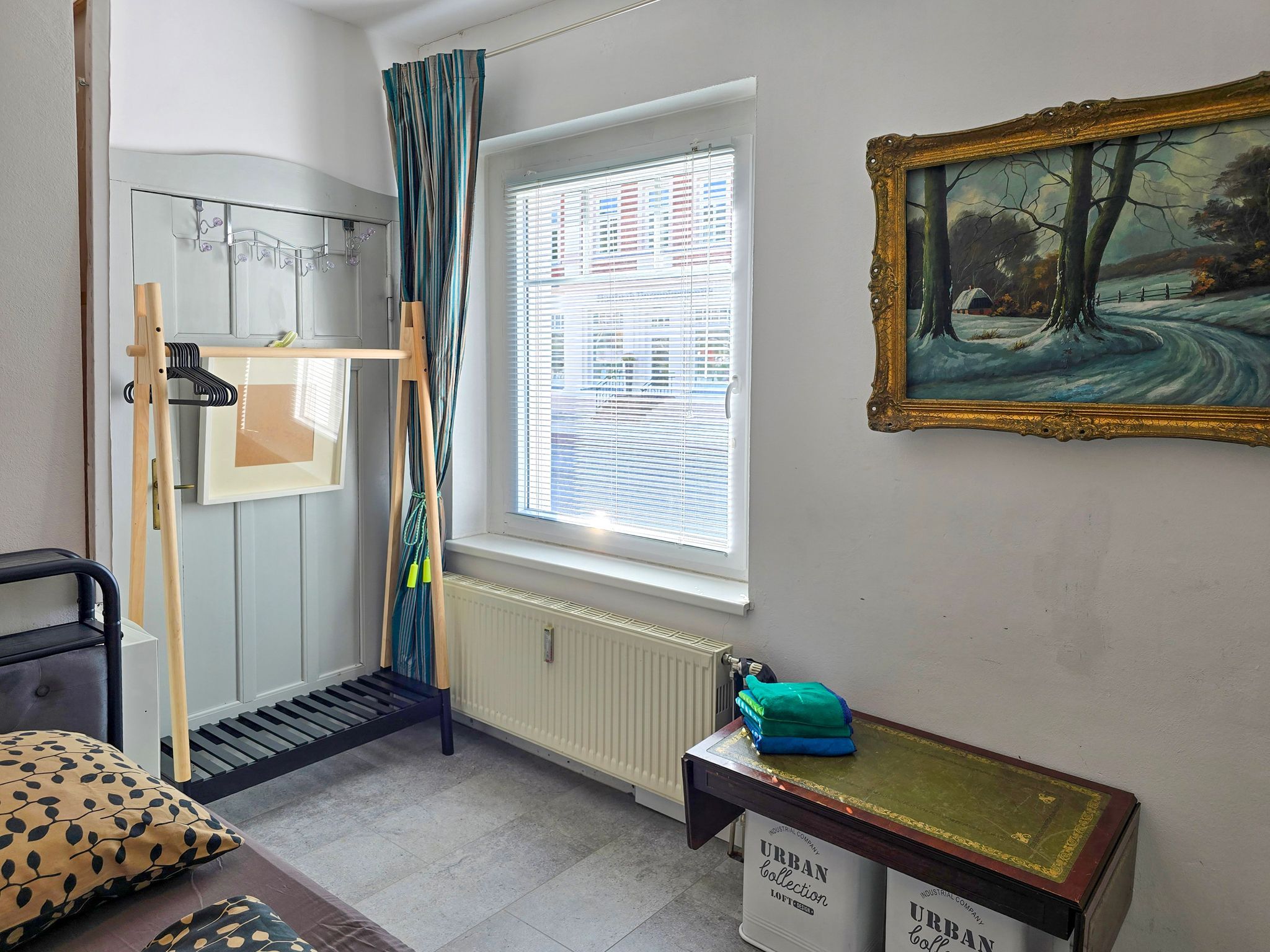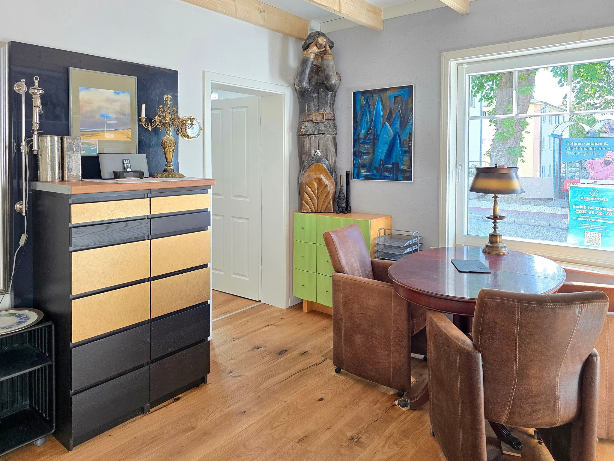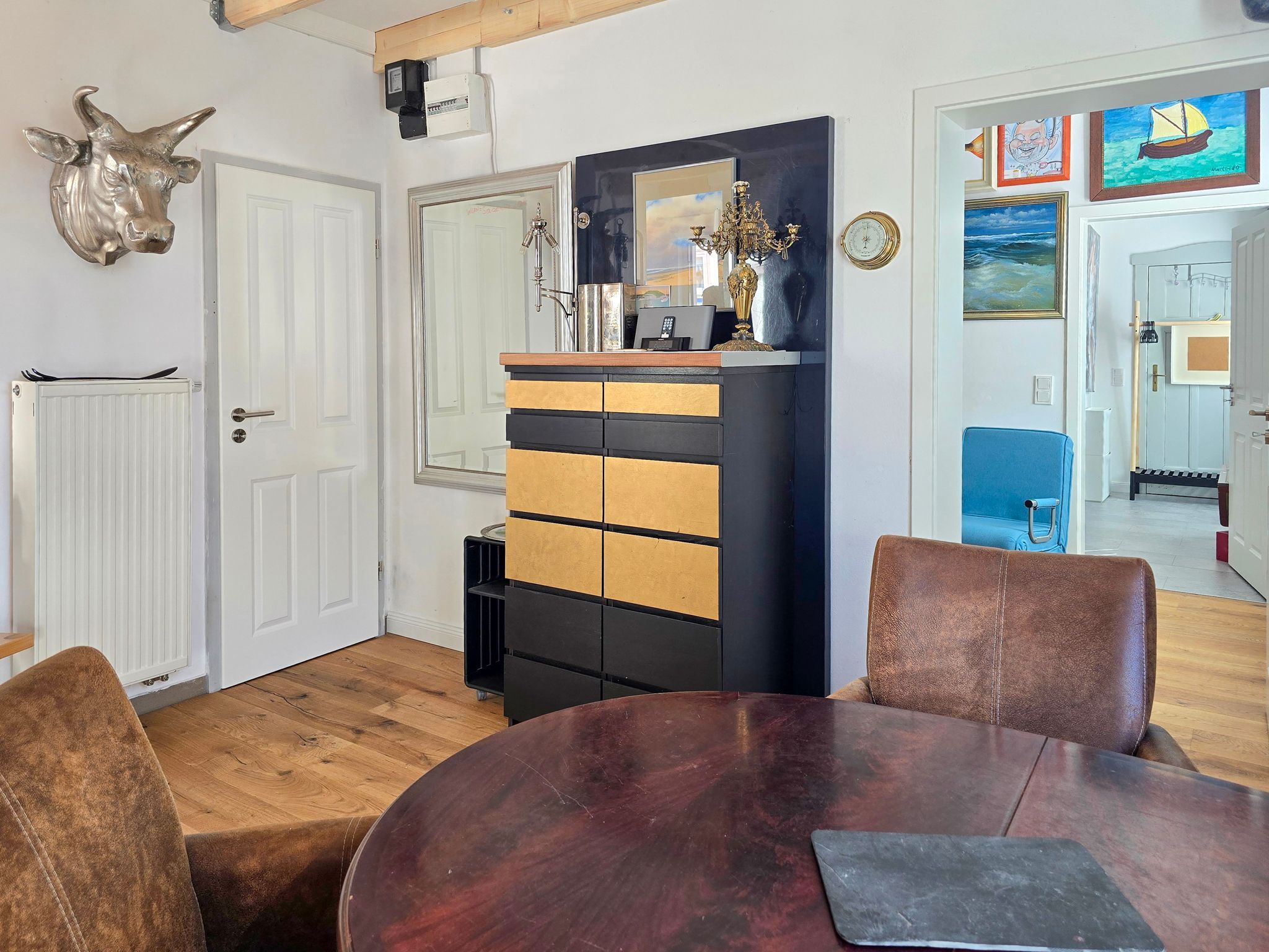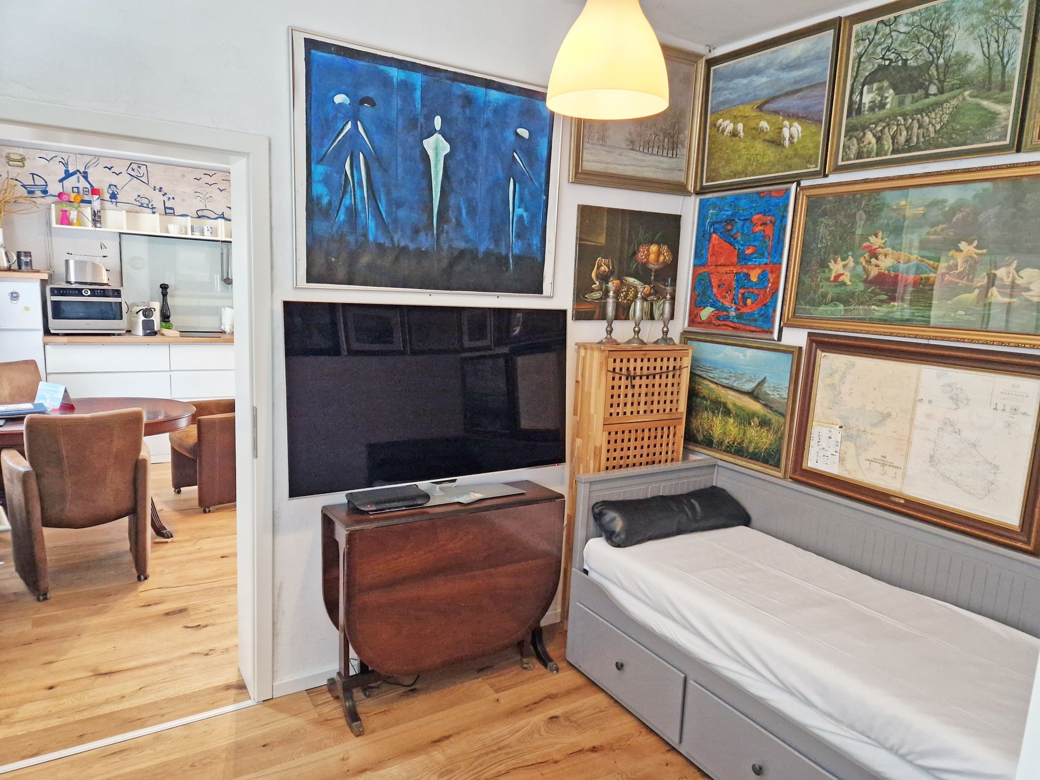 • Kleiner Wohnbereich mit integrieter Küchenzeile, 2-Platten-Ceranherd, Mikrowelle mit Grill- und Heißluftfunktion, Geschirrspüler, Kühlschrank mit Eisfach, Wasserkocher, Kaffeemaschine, Toaster und Radio.