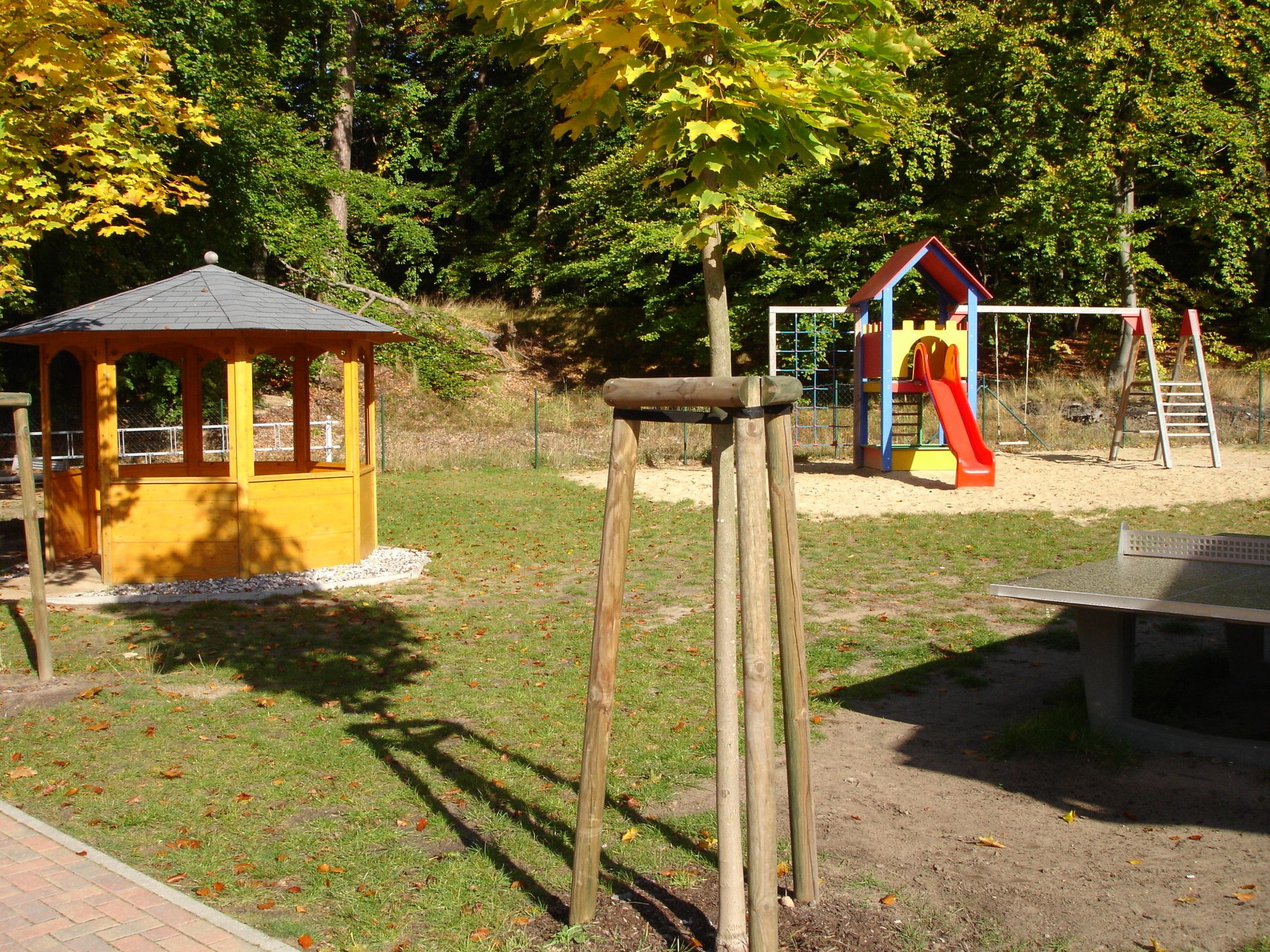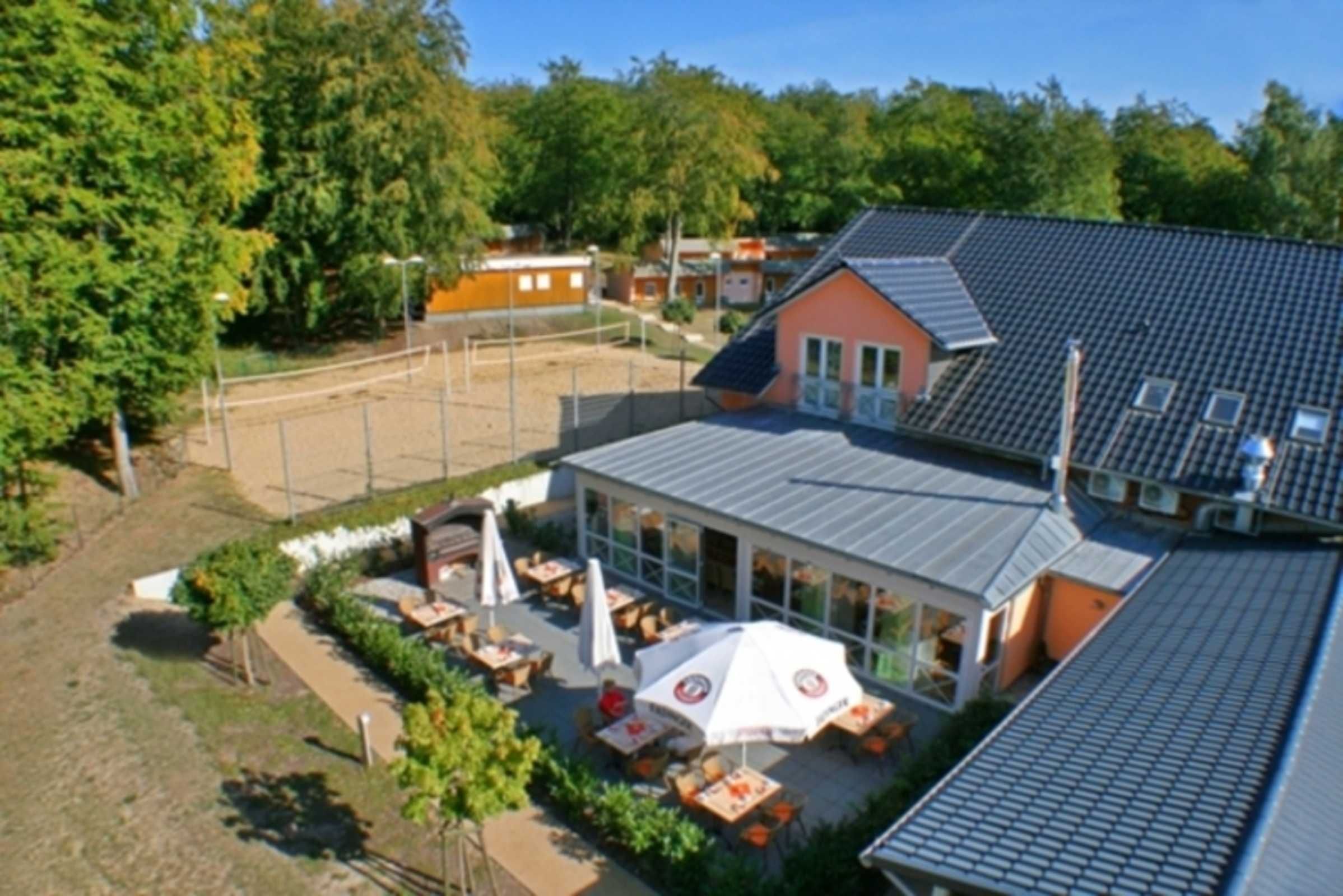 Außensportanlage mit Volleyballfeld, Tischtennis, Spielplatz und Sitzpavillons
