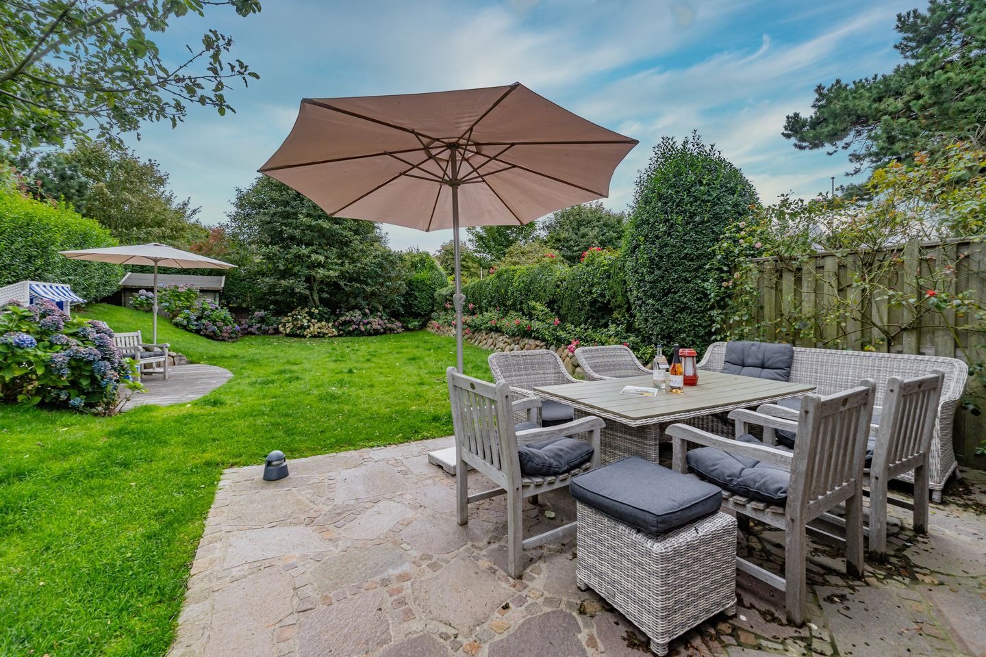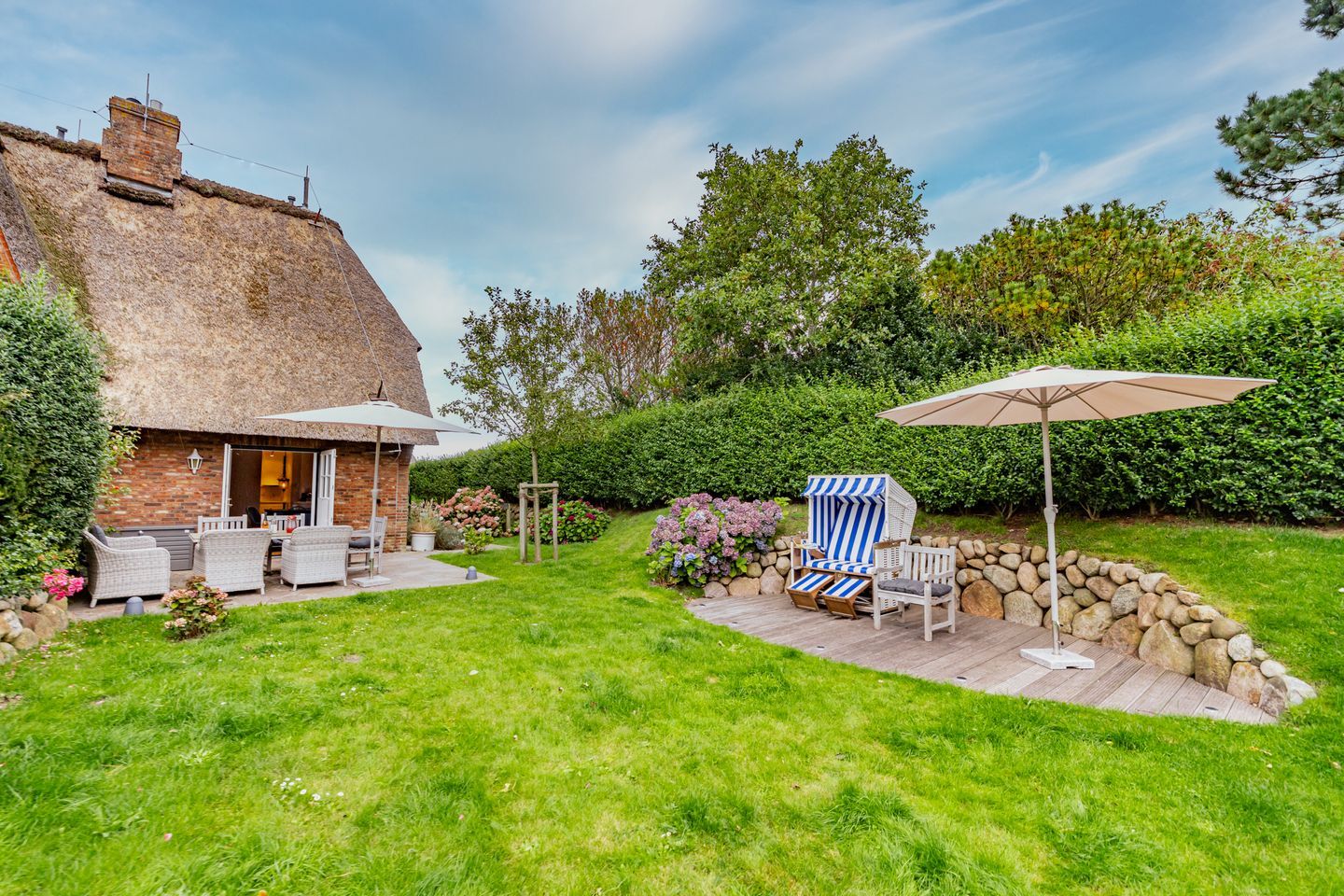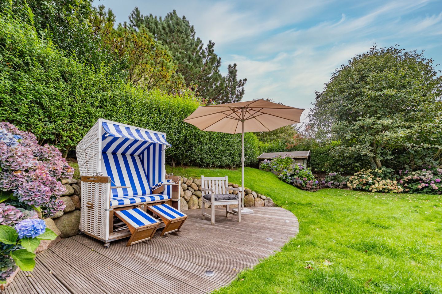 Die Außenanlage des Hauses bietet zusätzlich einen Garten mit gemütlichen Gartenmöbeln. Genießen Sie die frische Luft und entspannen Sie im Strandkorb oder auf der Terrasse.