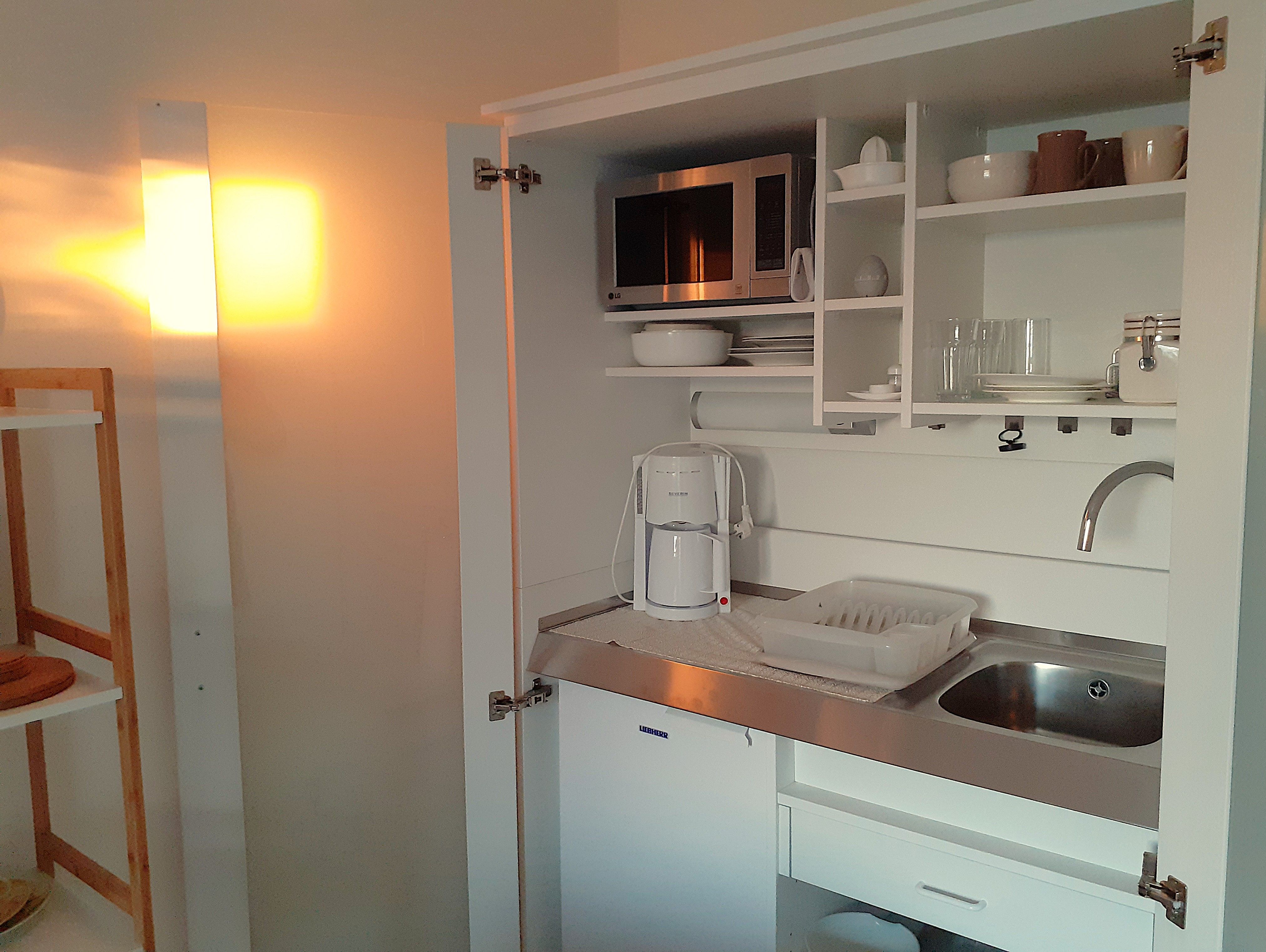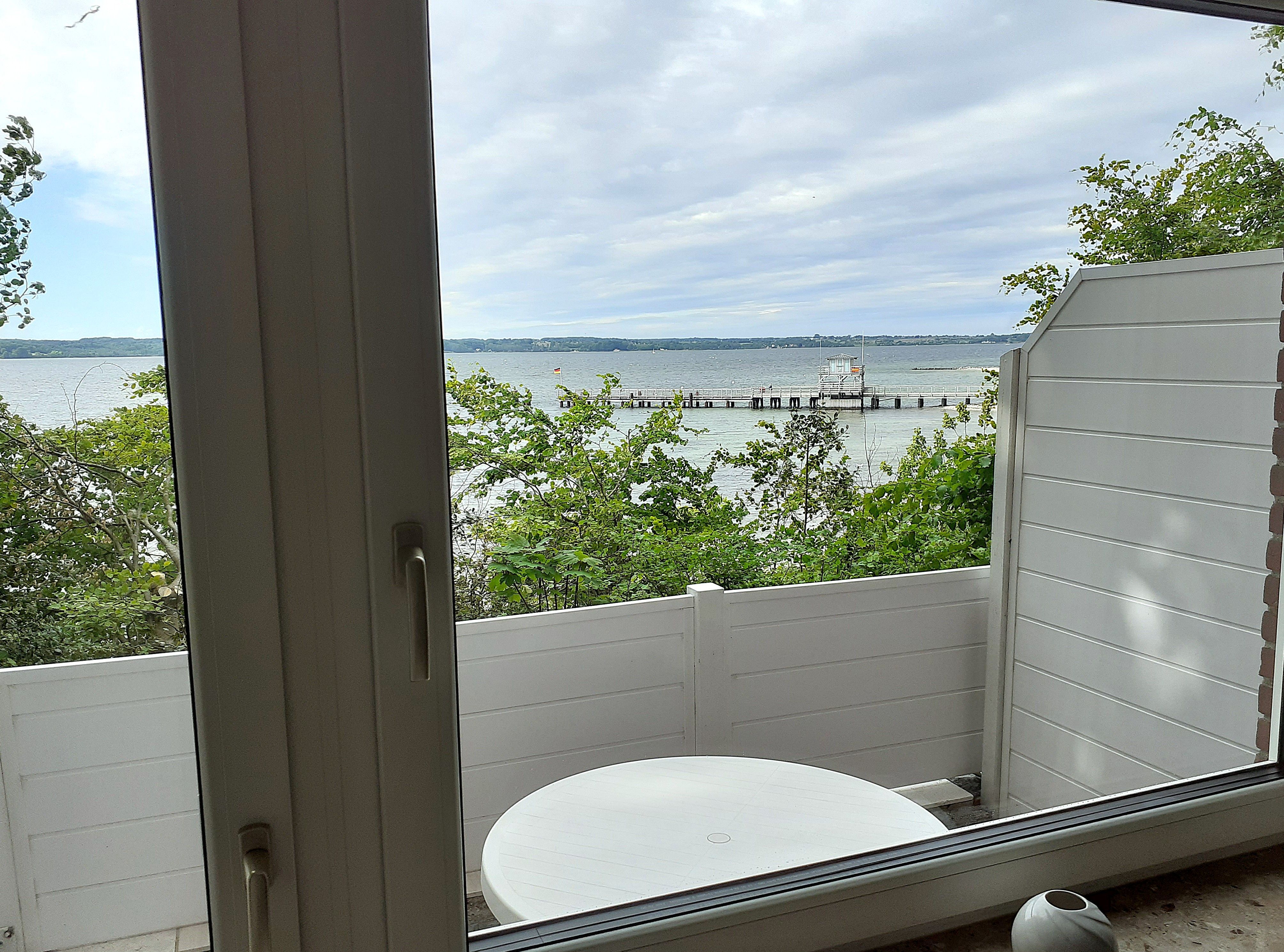 Das Appartement liegt zur Meerseite im Erdgeschoss des Hauses. Es verfügt über eine Terrasse mit direktem Blick auf die Förde, ein innenliegendes Badezimmer mit Dusche, ein Wohnzimmer mit Couch, Schrankbett (90cmx1,90 cm) sowie einem Schreib-/Esstisch. Im Wohnzimmer befindet sich zudem ein Bistro-Vitrinenschrank. Dieser ist ausgestattet mit einer Spüle, Kühlschrank, Filterkaffeemaschine, Wasserkocher, Toaster und Mikrowelle.