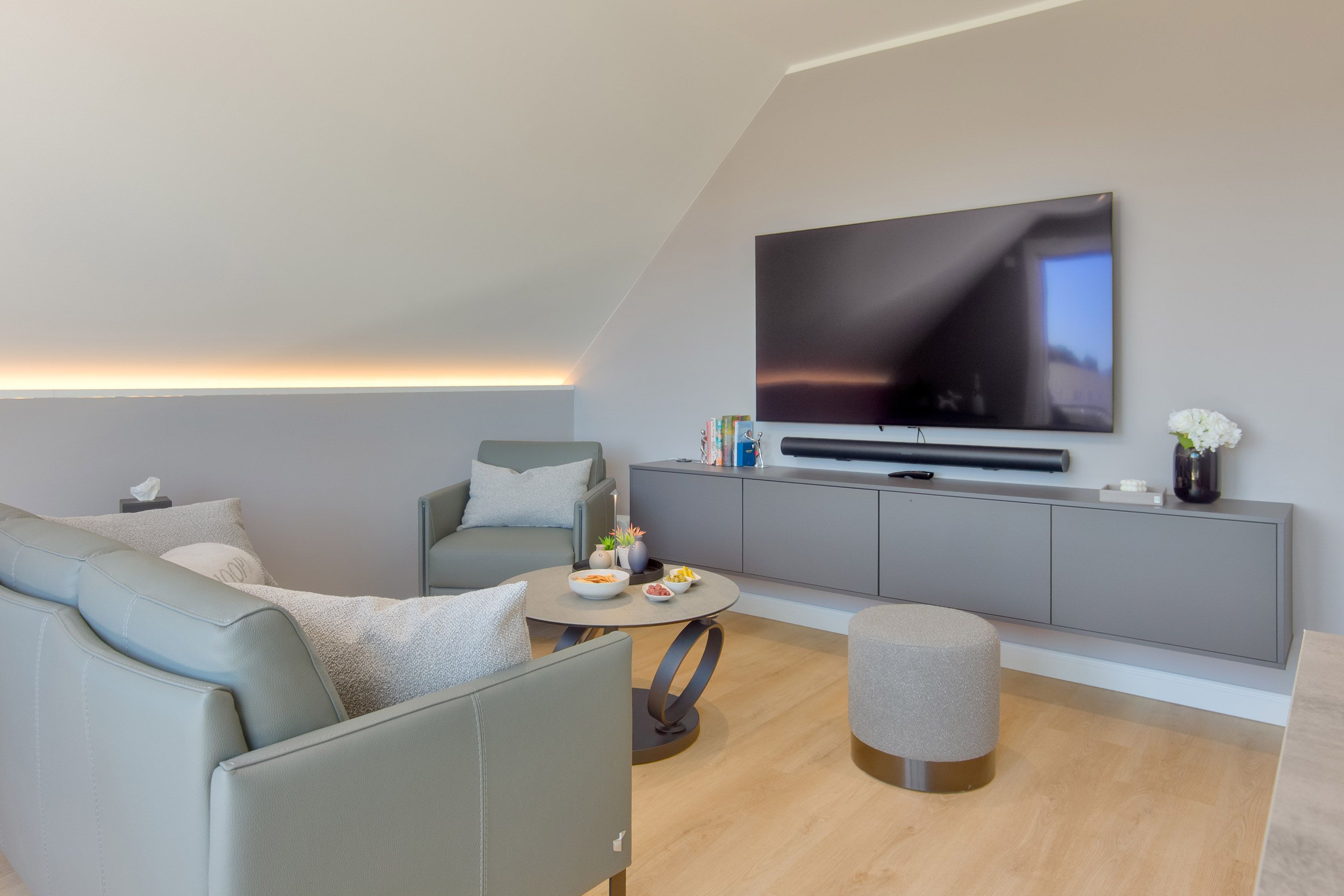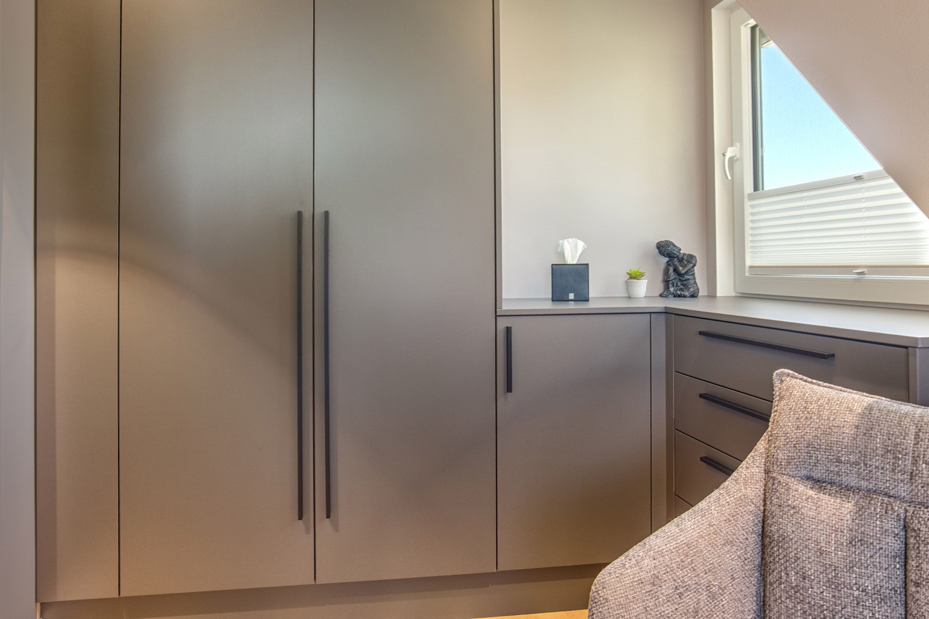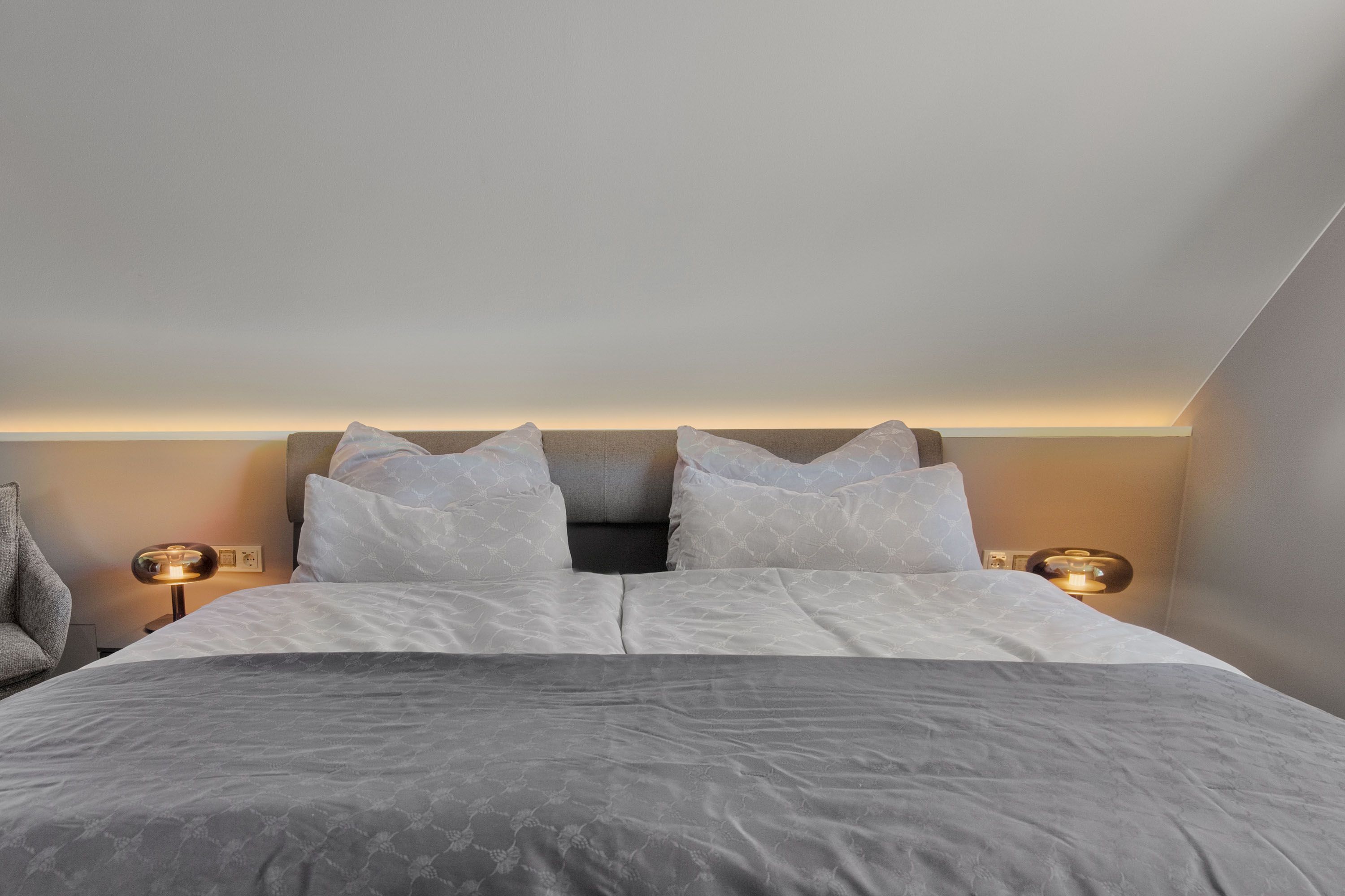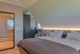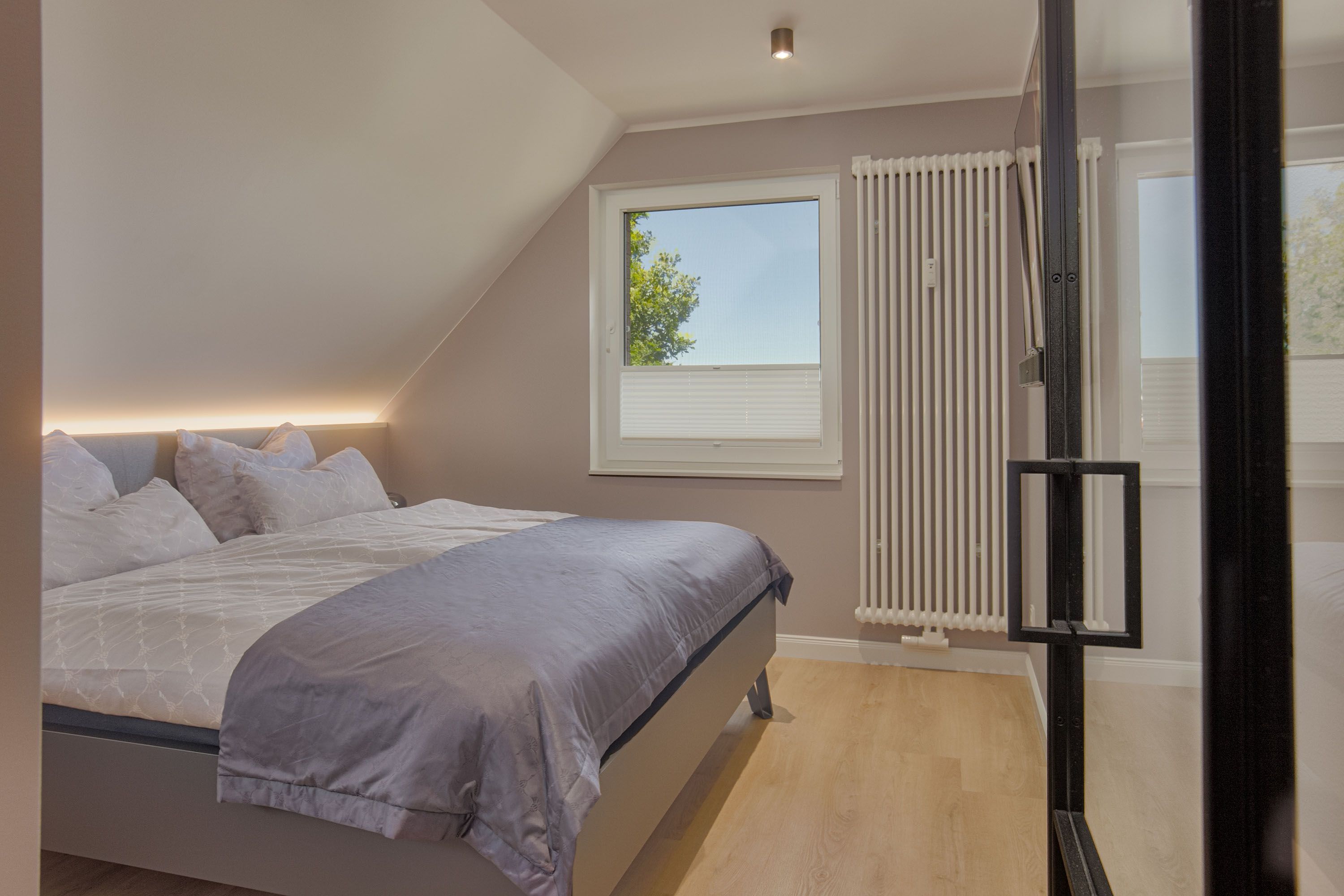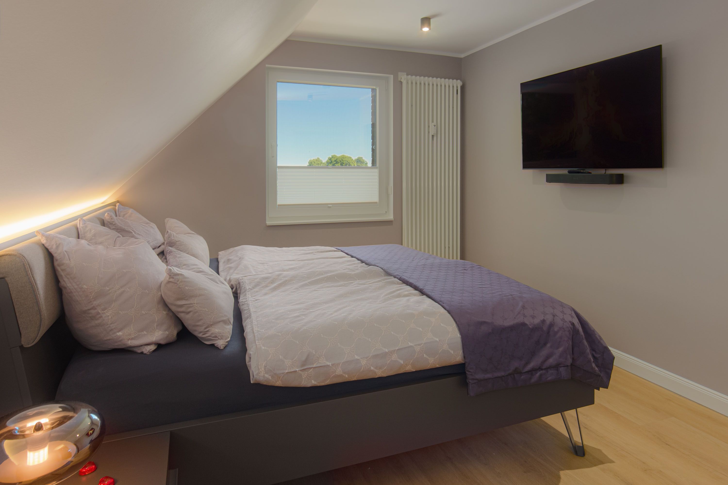 Die Ferienwohnung Seewind 3 verfügt im Schlafzimmer über ein bequemes, erhöhtes Doppelbett (180x200) mit getrennten Taschenfederkernmatratzen mit integriertem Geltoppper. Eine Entertainment-Ausstattung mit 4K-OLED-Smart-TV, SONOS-Soundambiente und Beleuchtungselementen gehört hier auch dazu. Ein großer Kleiderschrank und eine Kommode bieten viel Stauraum. Kofferständer, Bügeleisen/-brett, Erste-Hilfe-Set oder Safe sind für den Komfort vorhanden. Rollläden sorgen für Verdunklung.
