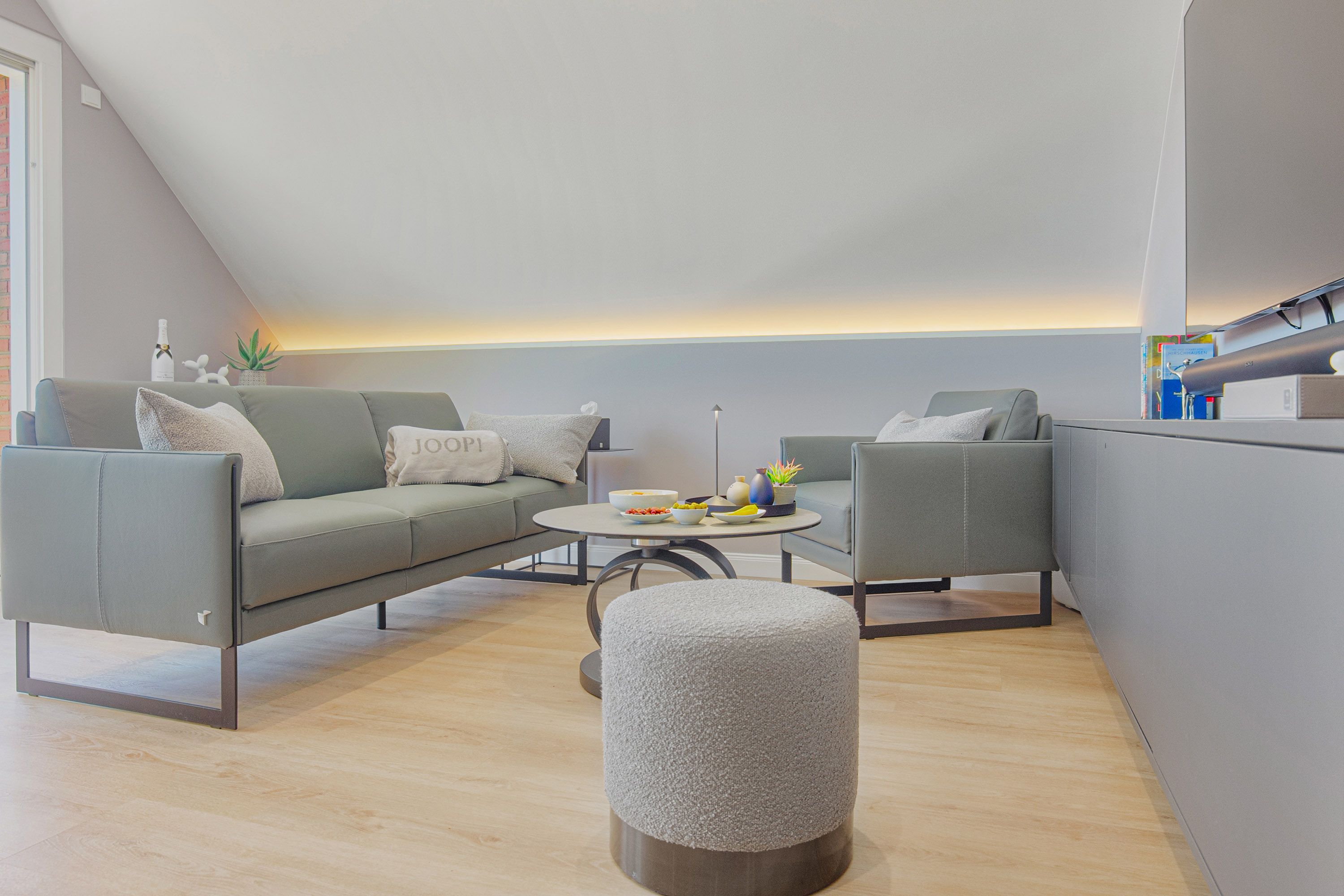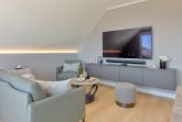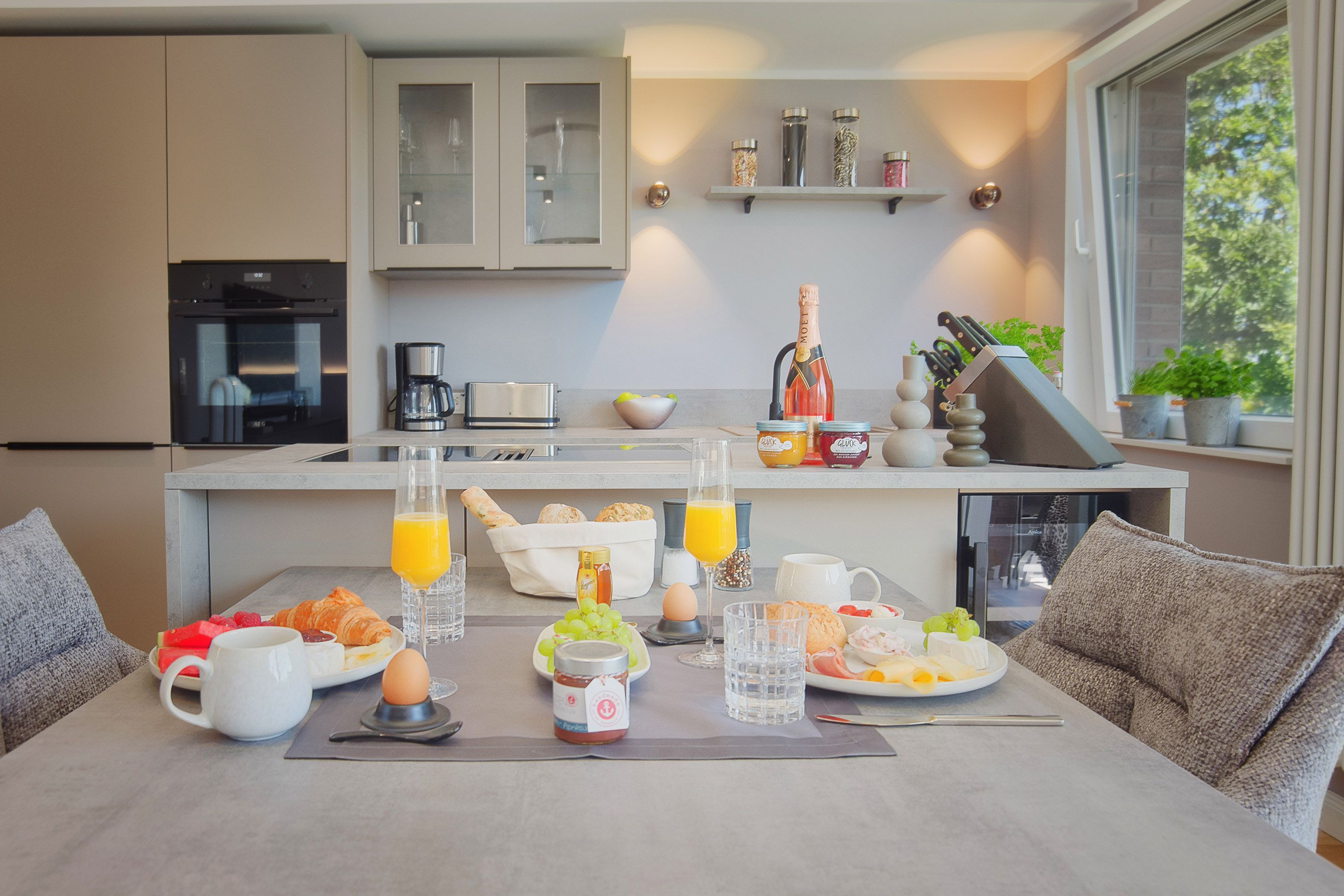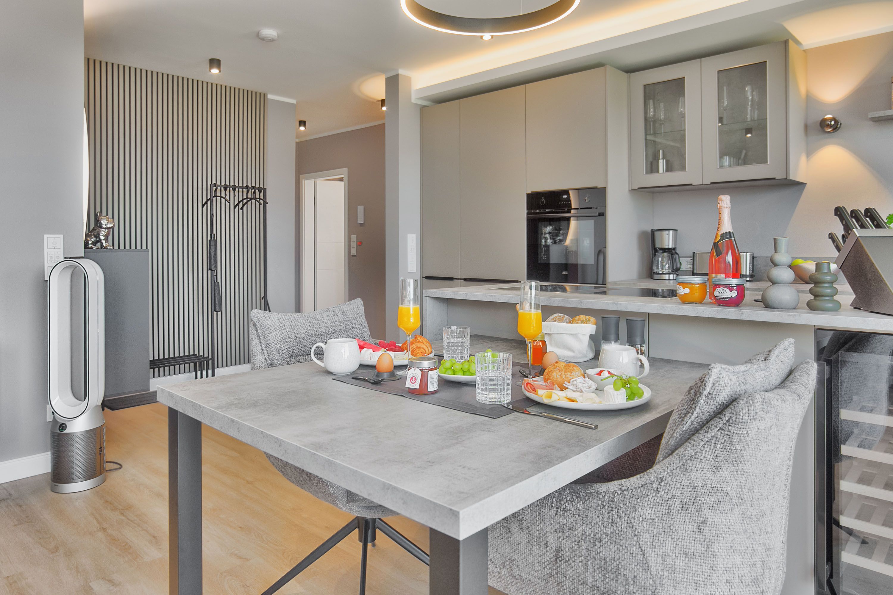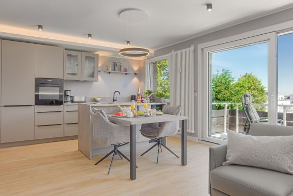Die offene Wohnraum-Küche mit kompletter Ausstattung (WMF) ist sehr komfortabel. Ob Nespresso-Kaffeemaschine oder Weinkühler, es ist alles an Geräten und Utensilien vorhanden, was Sie für Ihren hochwertigen Urlaub erwarten. Der Kulinarik steht nichts im Wege. Dafür sorgt auch der Essbereich des Wohnzimmers mit Sitzkomfort und ausziehbarem Esstisch. Begrüßen Sie hier doch einfach Urlaubsbekanntschaften oder Freunde zum gepflegten Beisammensein. Eine Waschmaschine ist hier zudem komfortabel in der Küche integriert.
