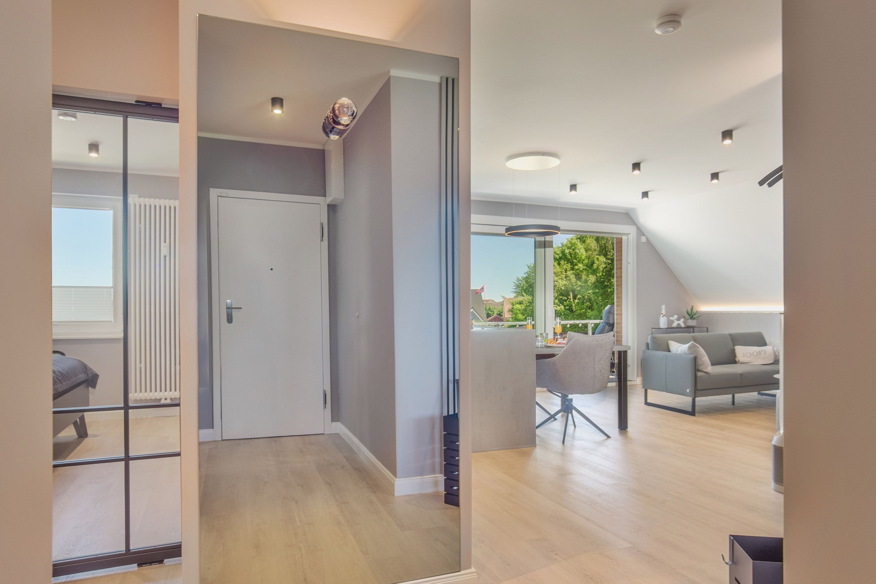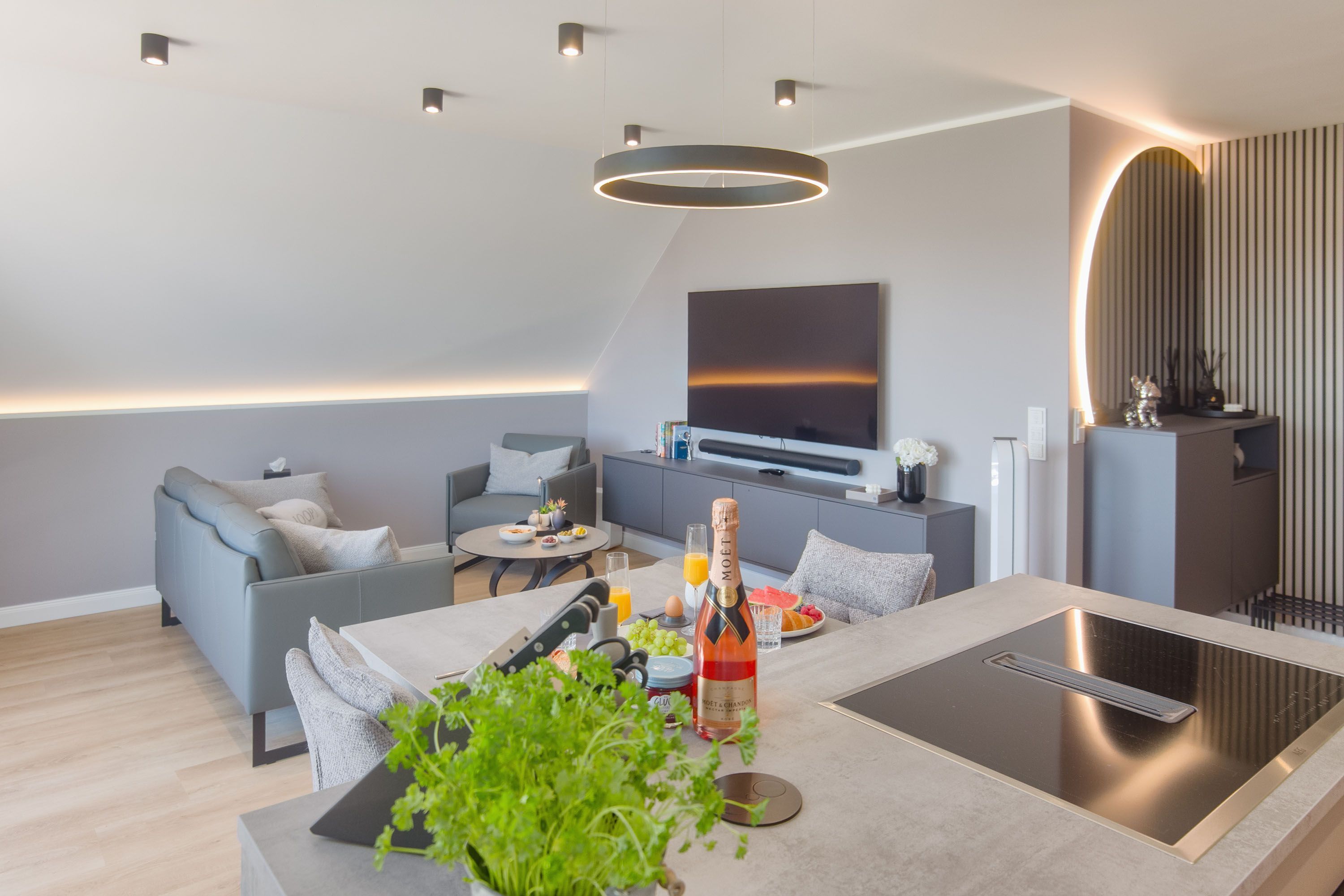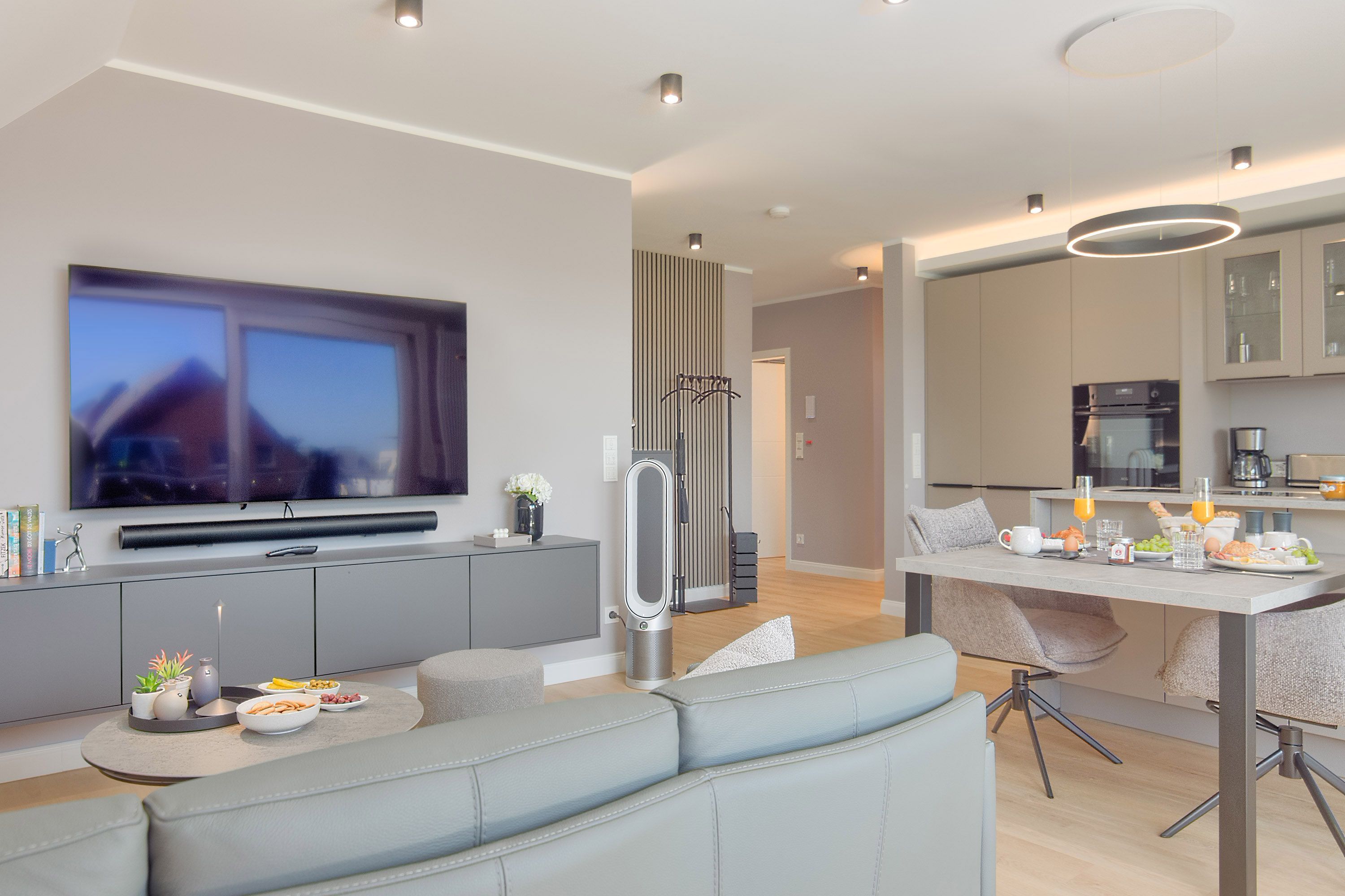 Die komplett neu sanierte Ferienwohnung Seewind 3, mit den liebevollen und erstklassigen Extras! Für maximal 2 Personen bietet diese geräumige Ferienunterkunft auf 55 m² Wohnfläche mit 5,5 m² möbliertem Balkon mit Ostseeblick im 2. Stock alles im Topzustand für Ihre beste Zeit des Jahres. Hier steht der stilvoll-moderne Komfort für Gäste im Vordergrund. Liebevoll designt und hochwertig mit maßgefertigten Einbaumöbeln eingerichtet. Der Wohnbereich mit elektrisch verstellbarem bequemen Ledersofa und topmoderner Unterhaltungstechnik bietet tolle Annehmlichkeiten. Die technische Ausstattung mit 4K-OLED-Smart-TV, WLAN und Streaming Möglichkeit, SONOS-Surroundsound-Anlage und einstellbarer Ambientebeleuchtung ist premium. Diverse Bücher und eine Spielesammlung sind ebenfalls vorhanden. Langweilig wird hier sicher niemand.
