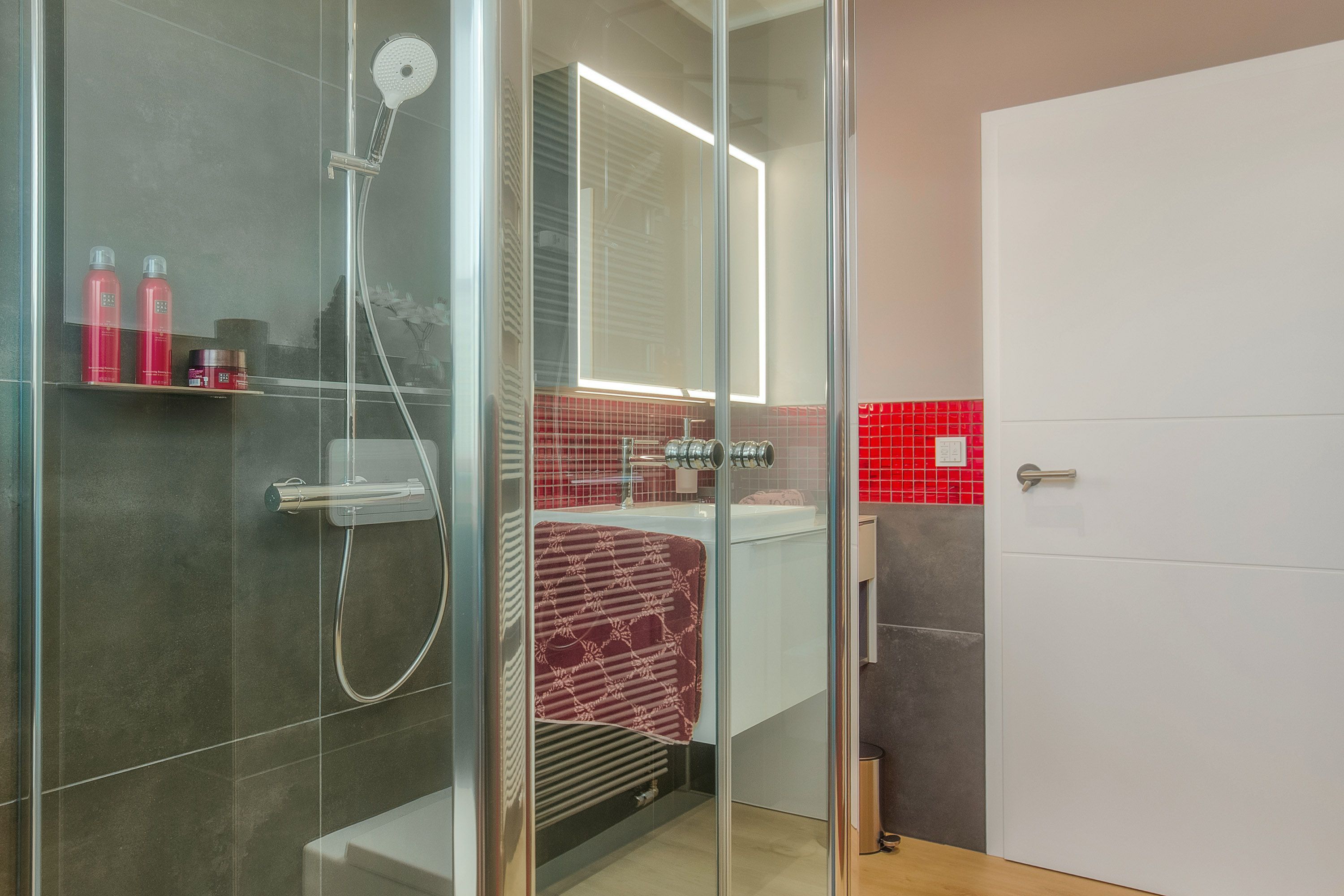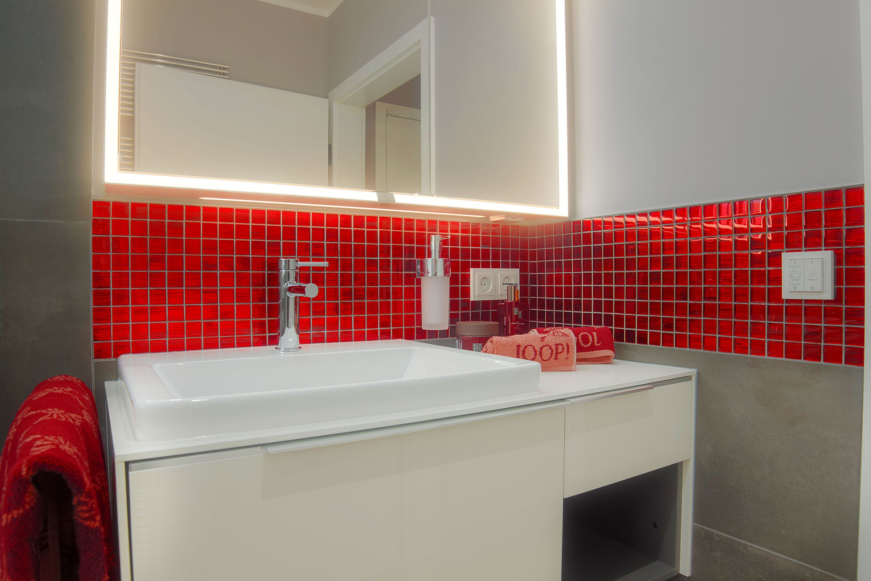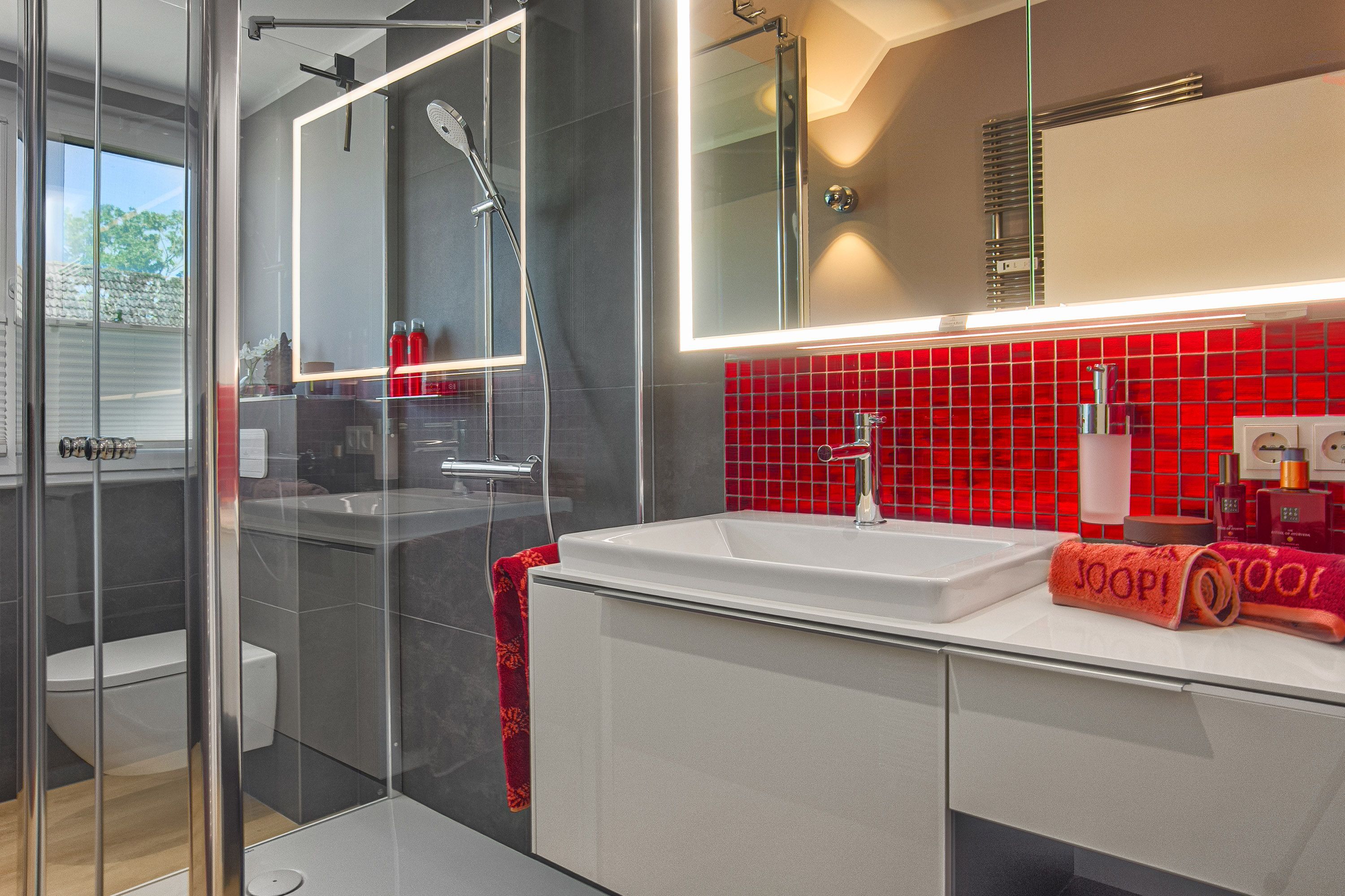 Das Wohlfühl-Badezimmer mit Fenster, ebenerdiger Regendusche, beleuchteten Spiegelelementen und Handtuchwärmer lädt auch an ungemütlicheren Tagen zur Entspannung ein.