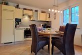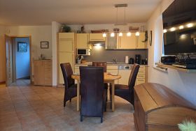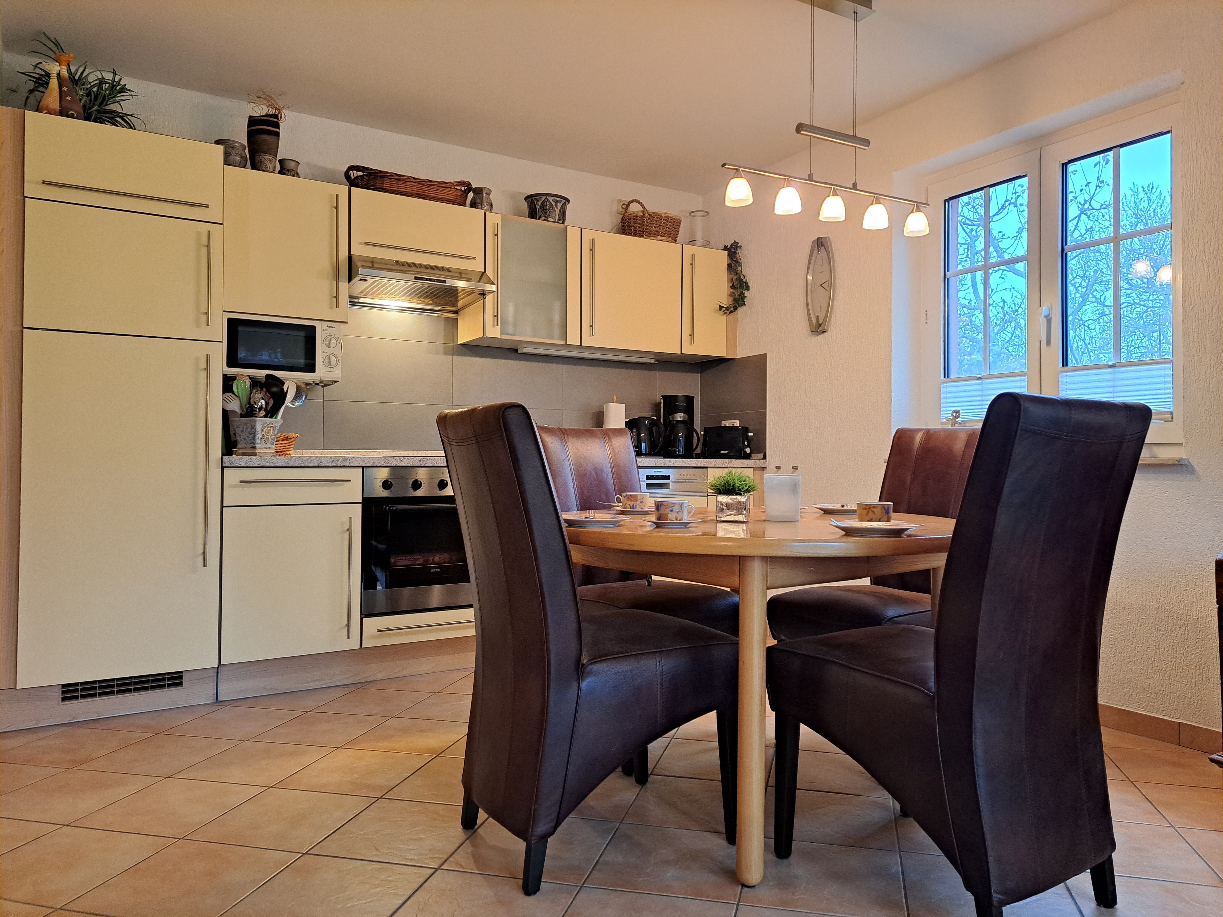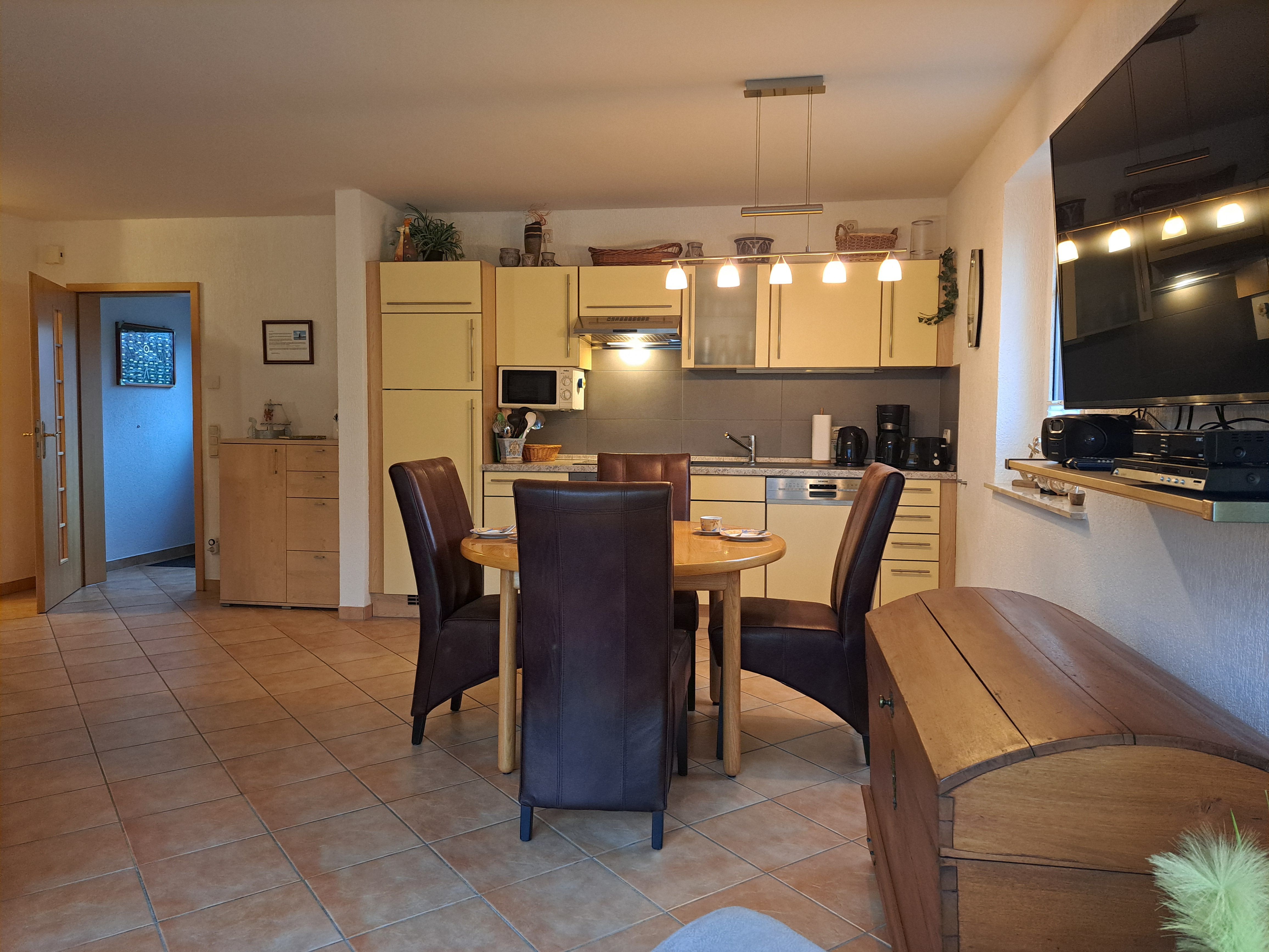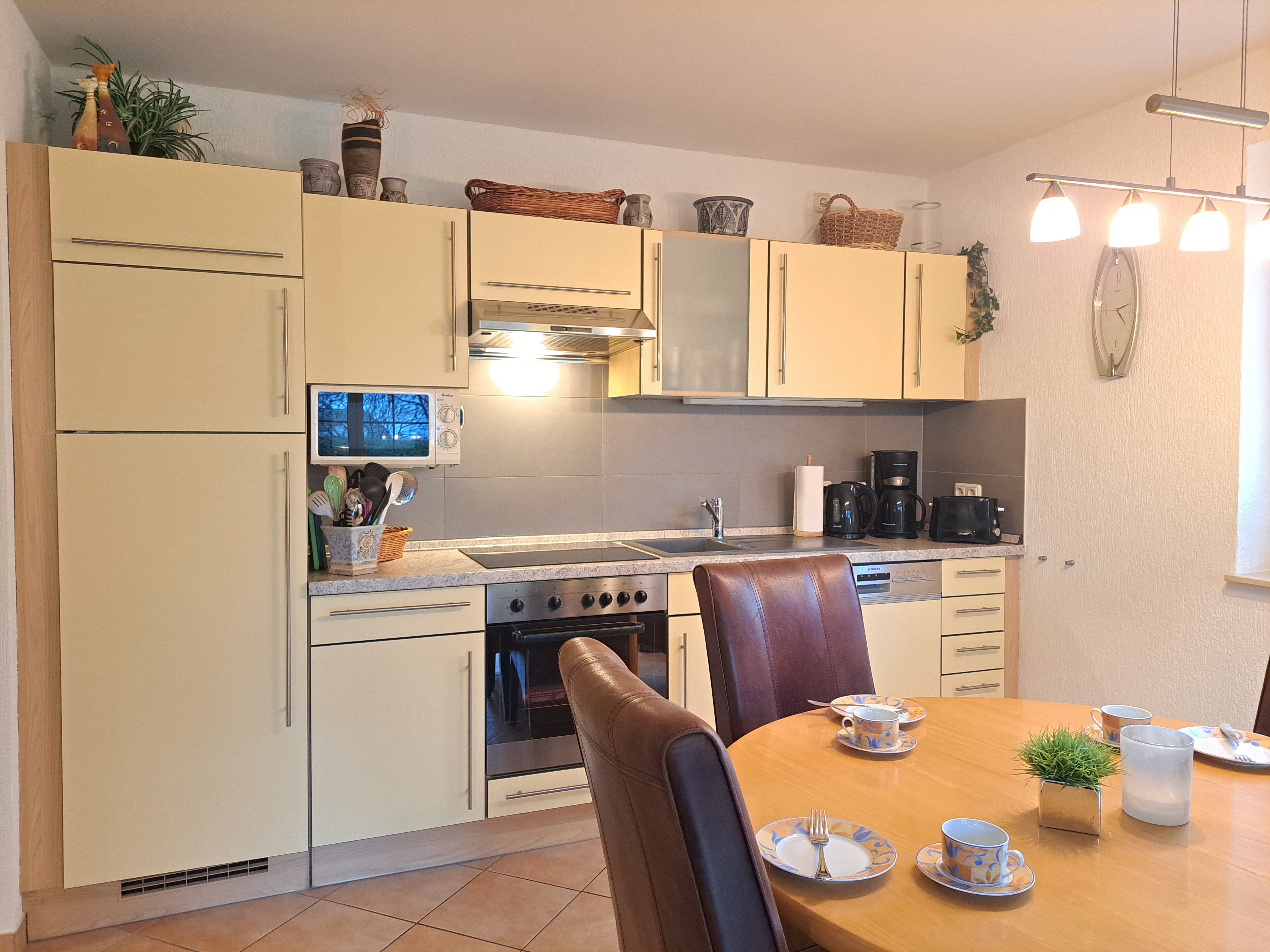 geachtet, damit die Gäste sich rundum Wohlfühlen können. Zur Ausstattung gehören alle notwendigen Küchenutensilien und laden mit dem großzügigen Essplatz zum gemeinsamen kochen ein. Die Küchenzeile wurde mit Kaffeemaschine, Wasserkocher, Kühlschrank mit Gefrierfach, Mikrowelle, Geschirrspüler und Herd mit Cerankochfeld sowie einem Backofen ausgestattet. Das Badezimmer wurde mit einer Dusche und Fön ausgestattet. Einige Räume der Ferienwohnung sind mit Fliegengasen ausgestattet. Die Wohnung ist eine Nichtraucherwohnung. Für unsere Gäste steht ein kostenloser WLAN
