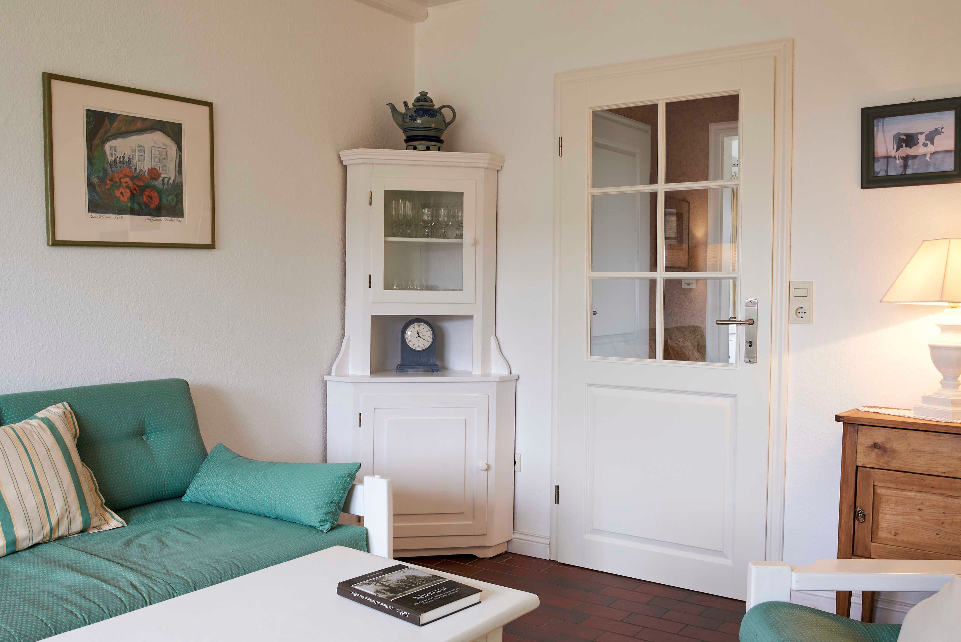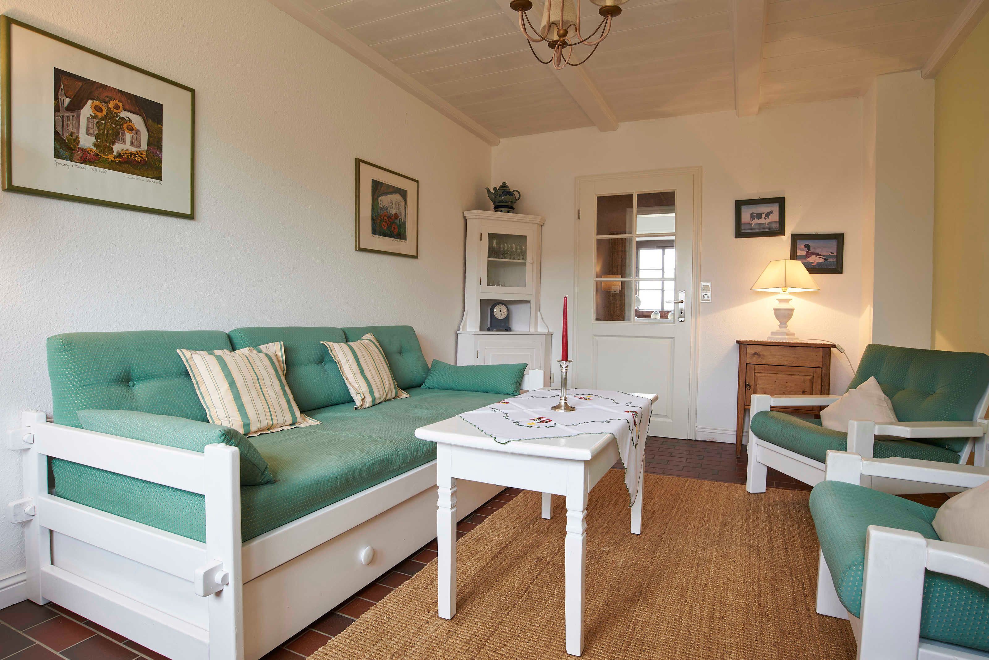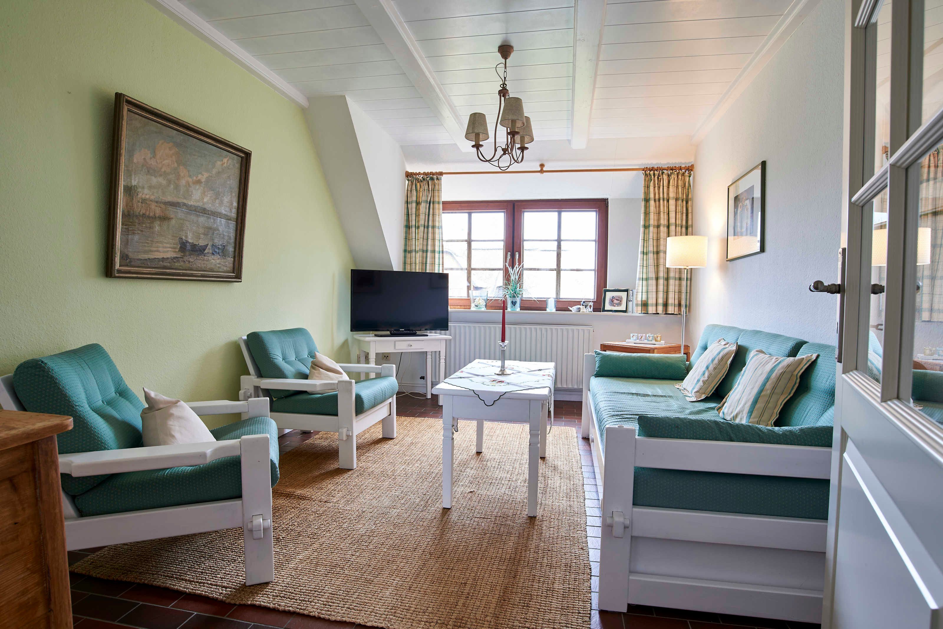Vom gemütlich eingerichteten Wohnzimmer aus können Sie auf das Meer blicken.