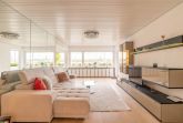 Neben einer großen Couchlandschaft und einem Lowboard mit Flachbildfernseher befindet sich als Highlight im Wohnzimmer eine Spiegelwand hinter dem Sofa. Der Esstisch mit sechs Stühlen steht direkt an der Fensterfront mit Blick zur Kieler Förde, beziehungsweise dem Yachthafen Düsternbrook