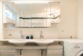 Das Badezimmer ist mit einer Waschmaschine und zwei Waschbecken ausgestattet. Es bietet zusätzlich genügend Ablage und Staufläche für Ihren Aufenthalt. Neben einem Heizungs-Handtuchhalter steht eine Eckdusche zur Verfügung.