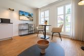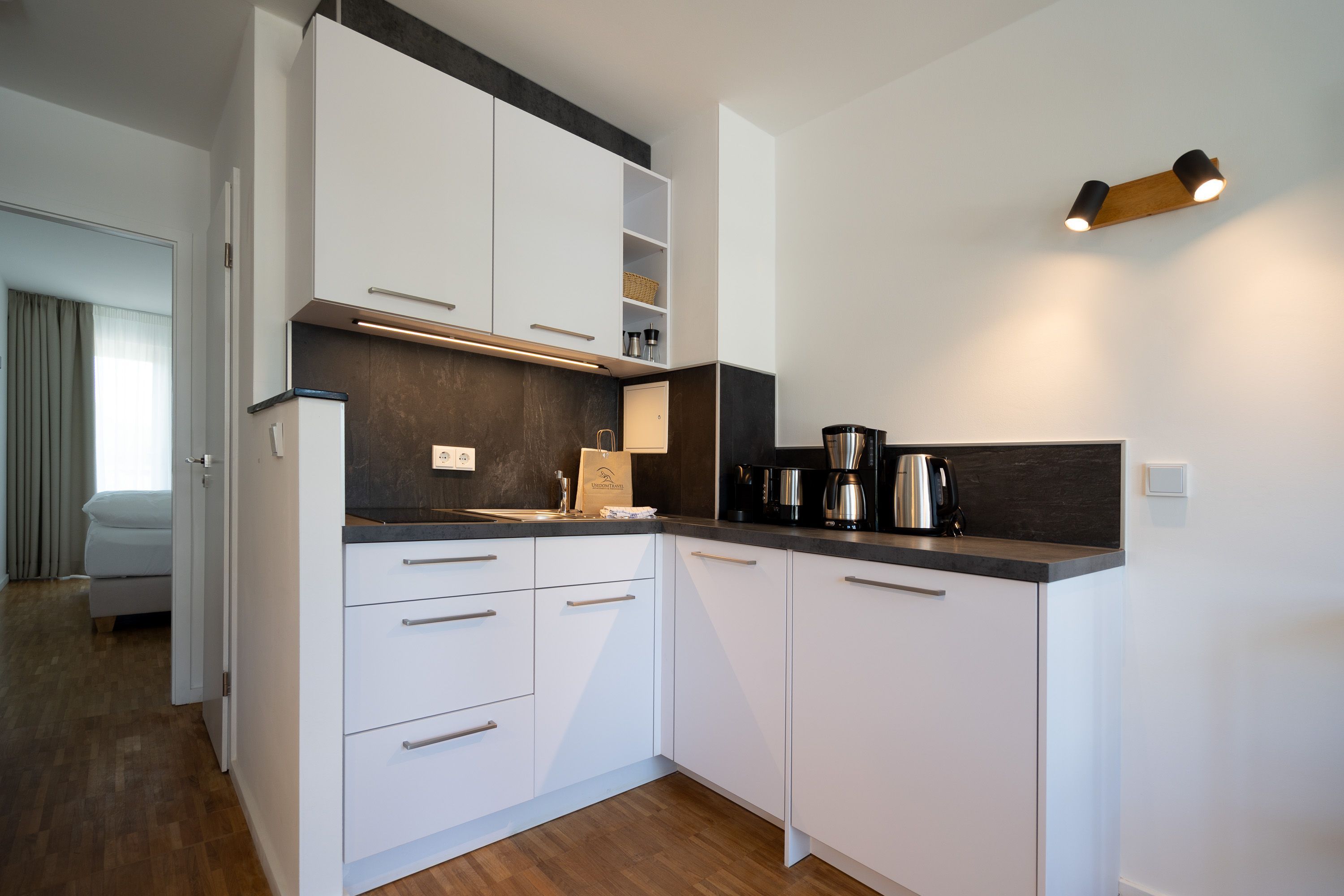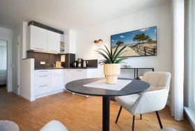 Gemütliches 2-Raum-Appartement mit Balkon Ihre stilvolle Auszeit zu zweit. Dieses liebevoll eingerichtete 2-Raum-Appartement im Hochparterre bietet auf 33?m² alles, was Sie für einen komfortablen Aufenthalt zu zweit benötigen hell, durchdacht und rundum einladend. Im offenen Wohnbereich erwartet Sie eine moderne Küchenecke mit 2-Platten-Cerankochfeld, Spülmaschine, Kühlschrank mit Gefrierfach und Nespresso-Kapselmaschine perfekt für die kleine Auszeit mit frischem Kaffee oder einem gemütlichen Frühstück am Esstisch für zwei. Ein bequemes Sofa und ein 55-Zoll-Flat-TV laden zu entspannten Stunden ein ob bei einem Filmabend oder einfach zum Abschalten nach einem aktiven Urlaubstag. Das separate Schlafzimmer ist mit einem komfortablen Boxspringbett (1,80?m x 2,00?m) ausgestattet. Von hier aus gelangen Sie direkt auf den sonnigen Süd-Ost-Balkon (ca. 5?m²) ein idealer Ort für die erste Tasse Kaffee oder den ruhigen Tagesausklang. Ein geräumiger Kleiderschrank befindet sich im Flur und bietet ausreichend Platz für Ihre Urlaubsgarderobe. Ein kleines, funktionales Bad mit Dusche ( 85 cm x 70 cm), Waschtisch und WC rundet das Wohlfühlangebot ab. Für Ihren PKW steht der Stellplatz Nr.?3 direkt vor dem Haus zur Verfügung. Natürlich ist kostenfreies WLAN inklusive. Ein stilvoller Rückzugsort für alle, die Ruhe, Komfort und gute Ausstattung schätzen.