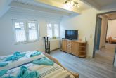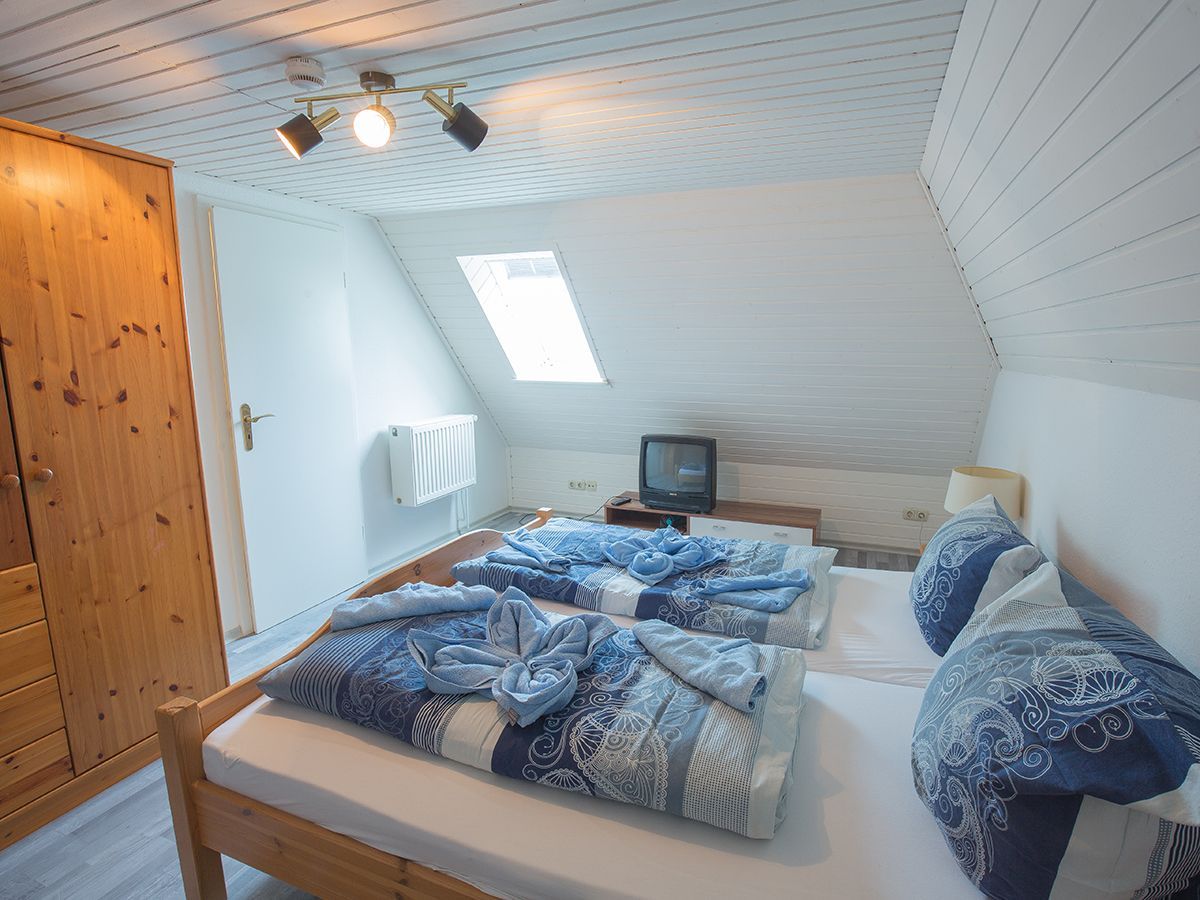 Im ersten Obergeschoss befinden sich zwei helle Schlafräume mit je zwei Einzelbetten und einem Doppelbett sowie das geräumige Duschbad mit Fenster. Im Dachgeschoss gibt es noch ein weiteres Schlafzimmer mit zwei Einzelbetten.