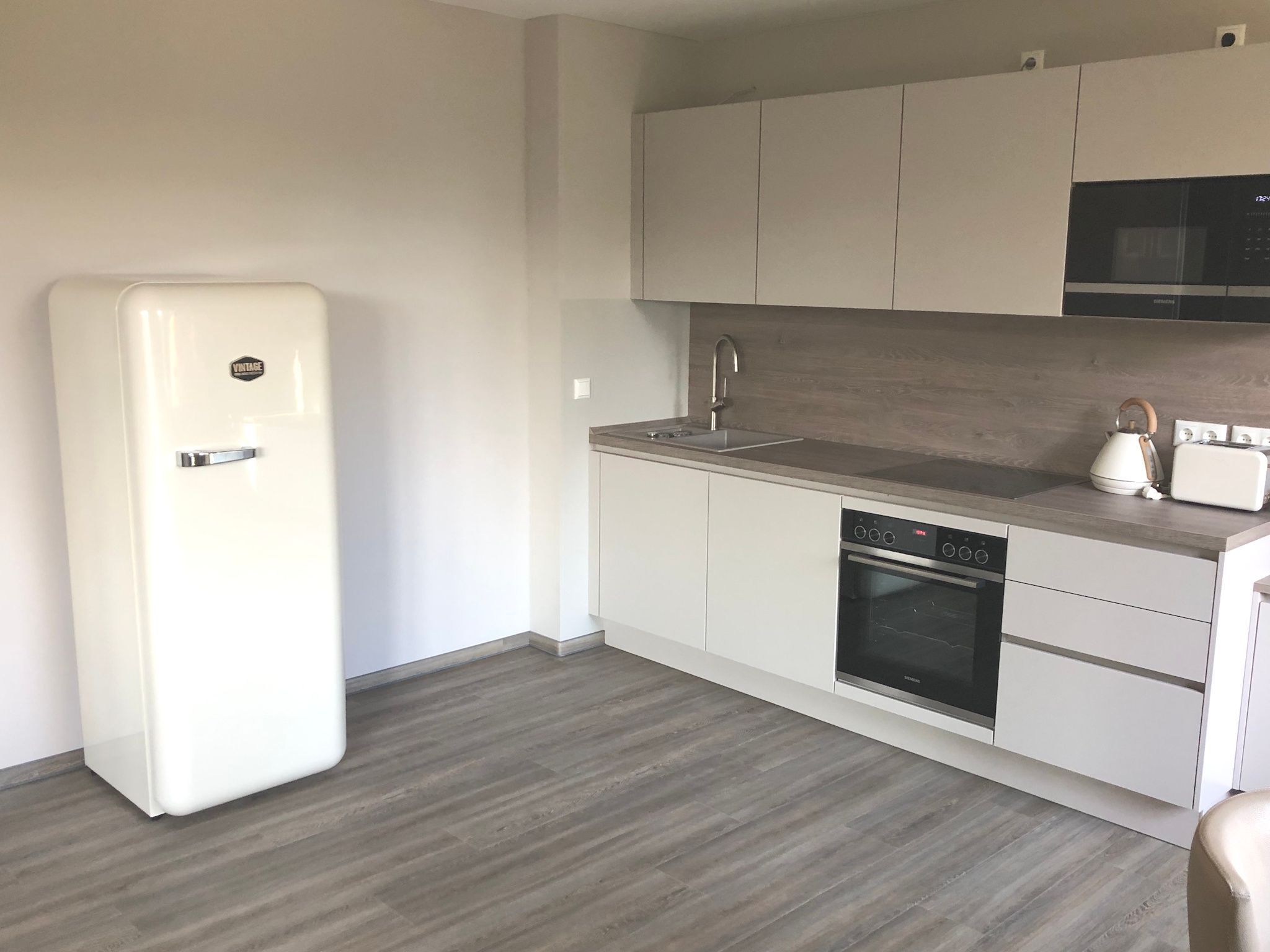 Einbauküche mit Kühlschrank/Gefrierfach, Herd mit Ceran- Kochfeld und Backofen, Spülmaschine, Mikrowelle, Kapsel- Kaffeemaschine, Wasserkocher, Toaster