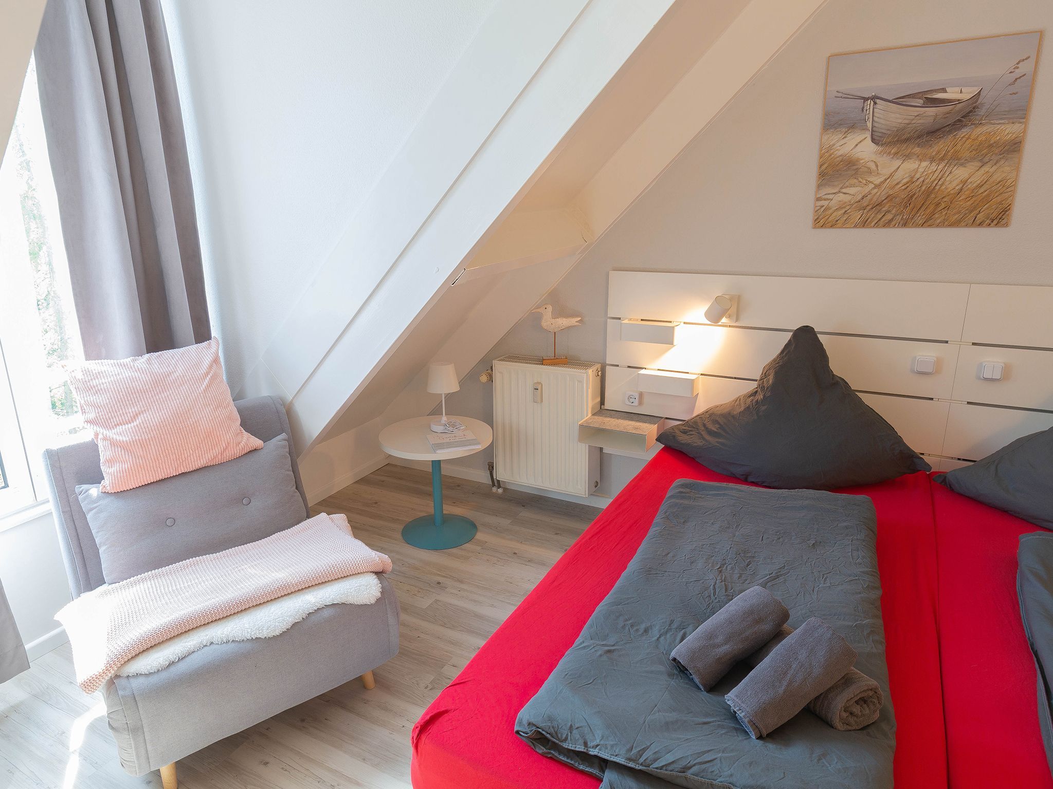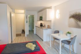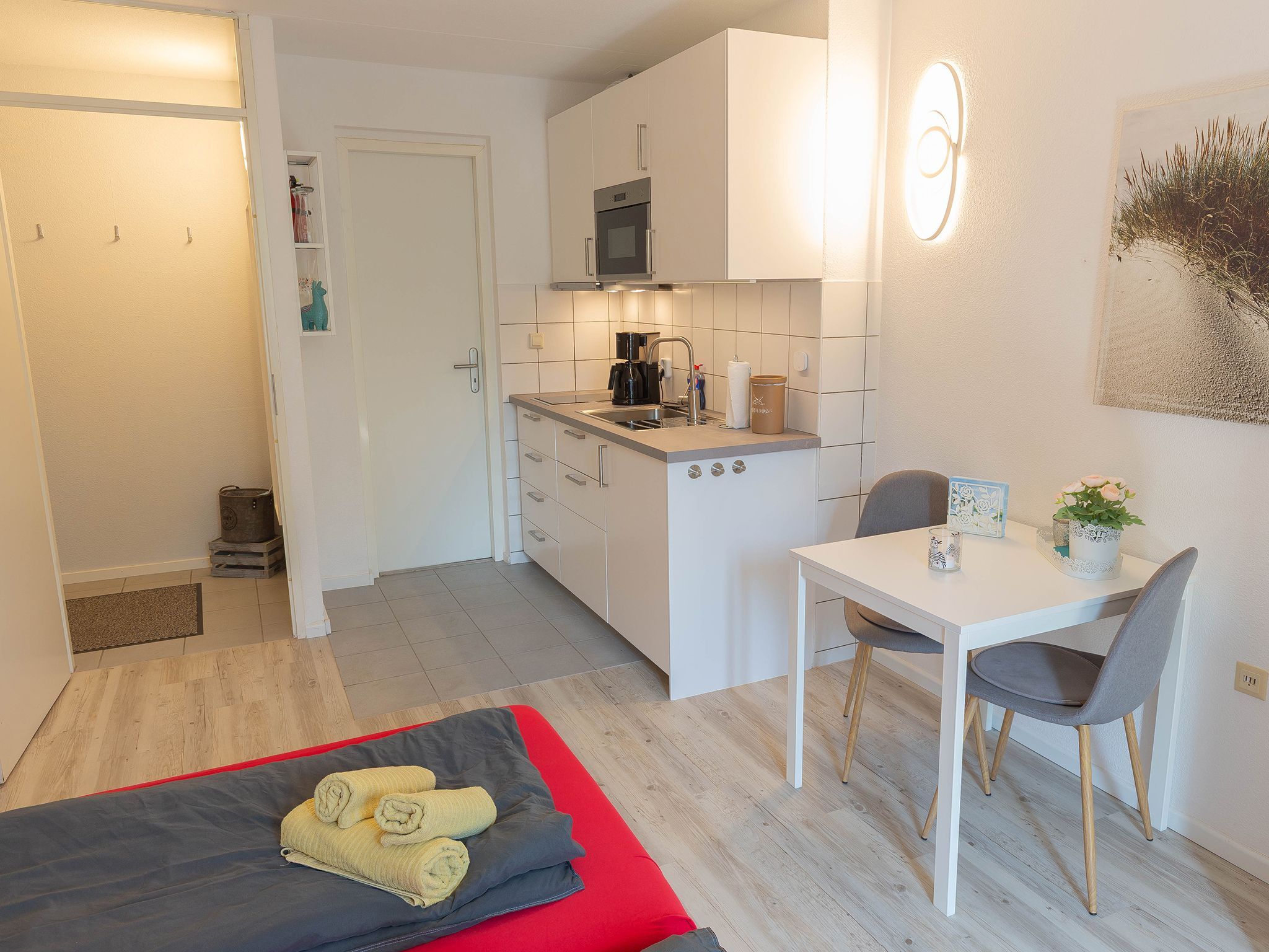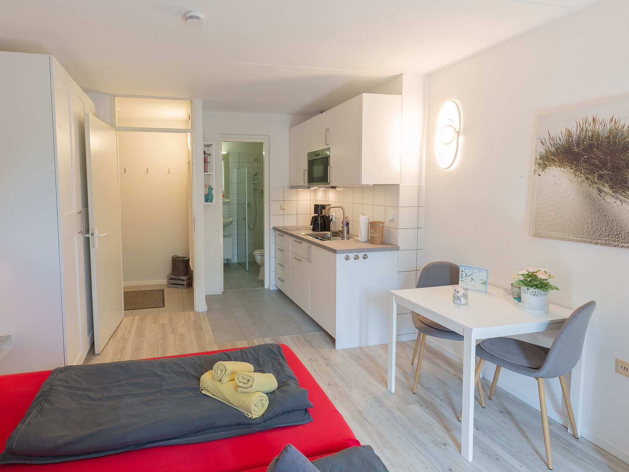 Hier urlauben der Single und das Paar auf einer Ebene. Vom großzügigen Flurbereich gelangen Sie in den großen hellen Raum mit zunächst links der modernen Küchenzeile mit 2-Platten-Ceranfeld und integrierter Mikrowelle sowie einen vorgelagerten Esstisch mit zwei Stühlen. Gegenüber das gemütliche Doppelbett mit Kleiderschrank und einem Relaxsessel daneben.