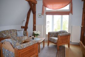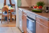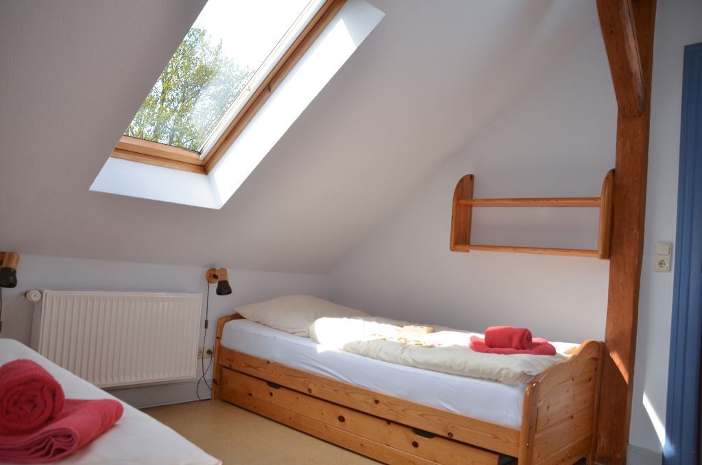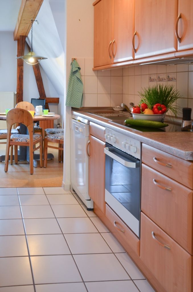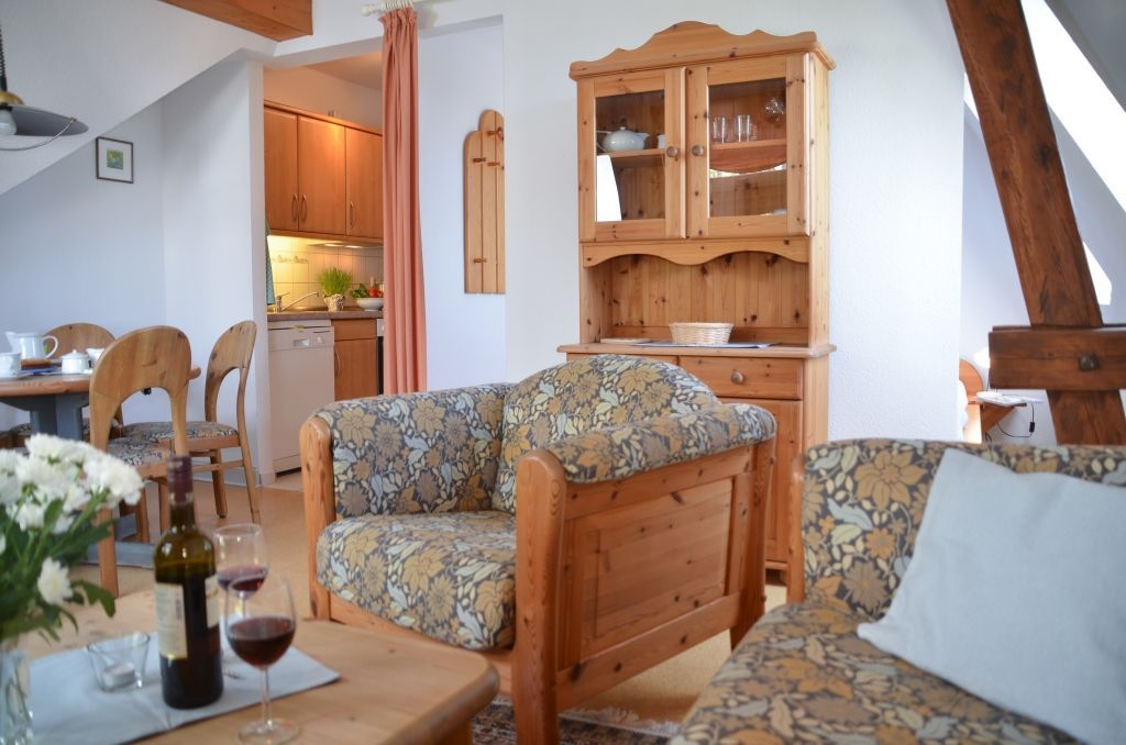 Unsere Ferienwohnung Mühlenkamp befindet sich im Dachgeschoss und bietet auf 42m2 Platz für bis zu 4 Personen. Die Wohnung verfügt über ein Wohnzimmer mit Essbereich, ein Elternschlafbereich, ein Kinderschlafzimmer, eine Küchenzeile