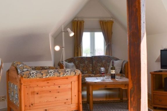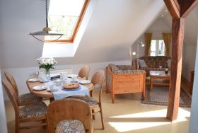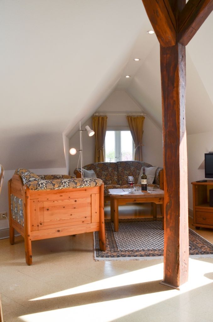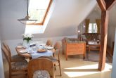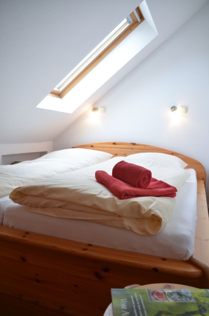 Unsere Ferienwohnung Fuchslöcher befindet sich im Dachgeschoss und bietet auf 45m2 Platz für bis zu 5 Personen. Die Wohnung verfügt über ein Wohnzimmer mit Essbereich, ein Elternschlafbereich, ein Kinderschlafzimmer, eine Küchenzeile