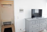 In dem kombinierten Schlaf-/ Wohnraum stehen ein Hochbett (1,40 x 2,00m), ein Schlafsofa , ein Kleiderschrank, ein Esstisch mit zwei Stühlen und eine Kommode mit Flachbild-TV. Es können also hier max. 2 Erwachsen und ein Kind bis 16 Jahre wohnen und schlafen. Achtung das Hochbett ist nur 1,40 breit!