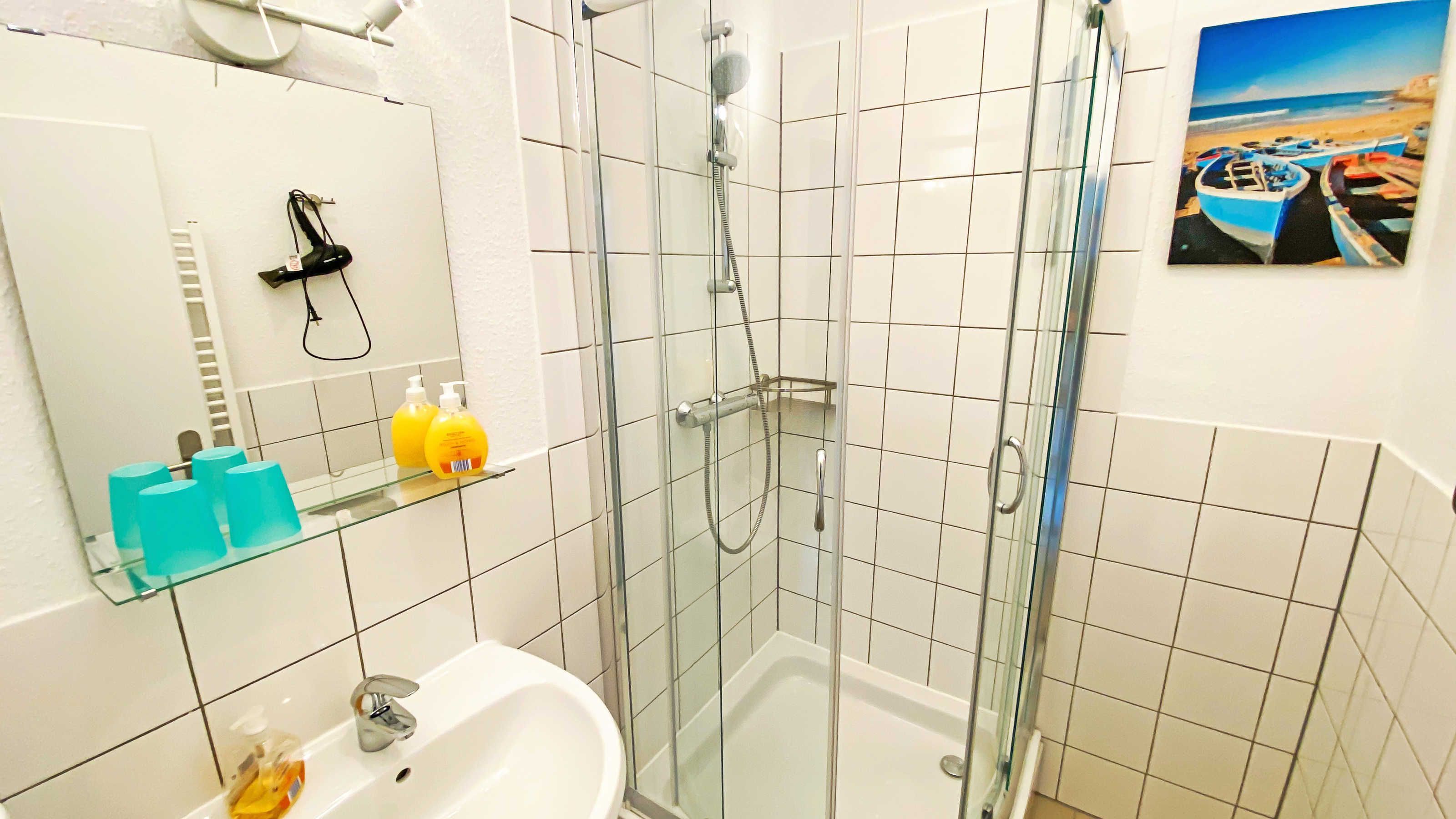 Das moderne Bad ist mit Dusche, WC, Waschbecken, Spiegel und Föhn ausgestattet.